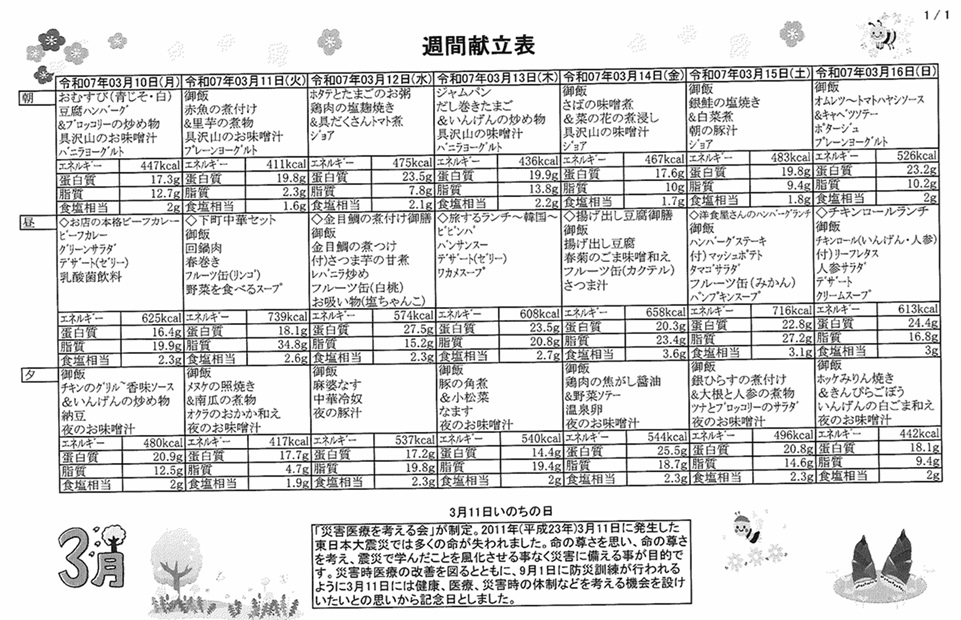 3月10日(月)~3月16日(日)の献立表になります。ぜひご覧ください。