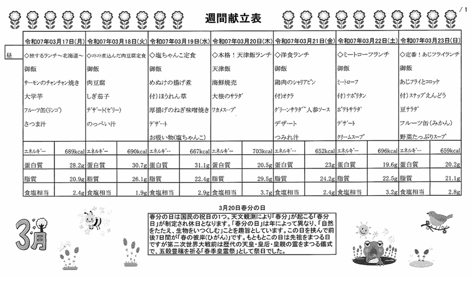 3月7日(月)~3月23日(日)の献立表になります。ぜひご覧ください。