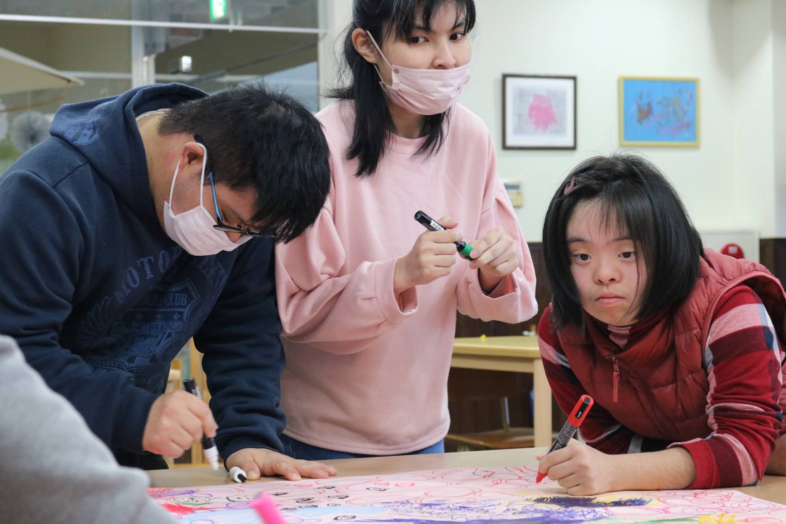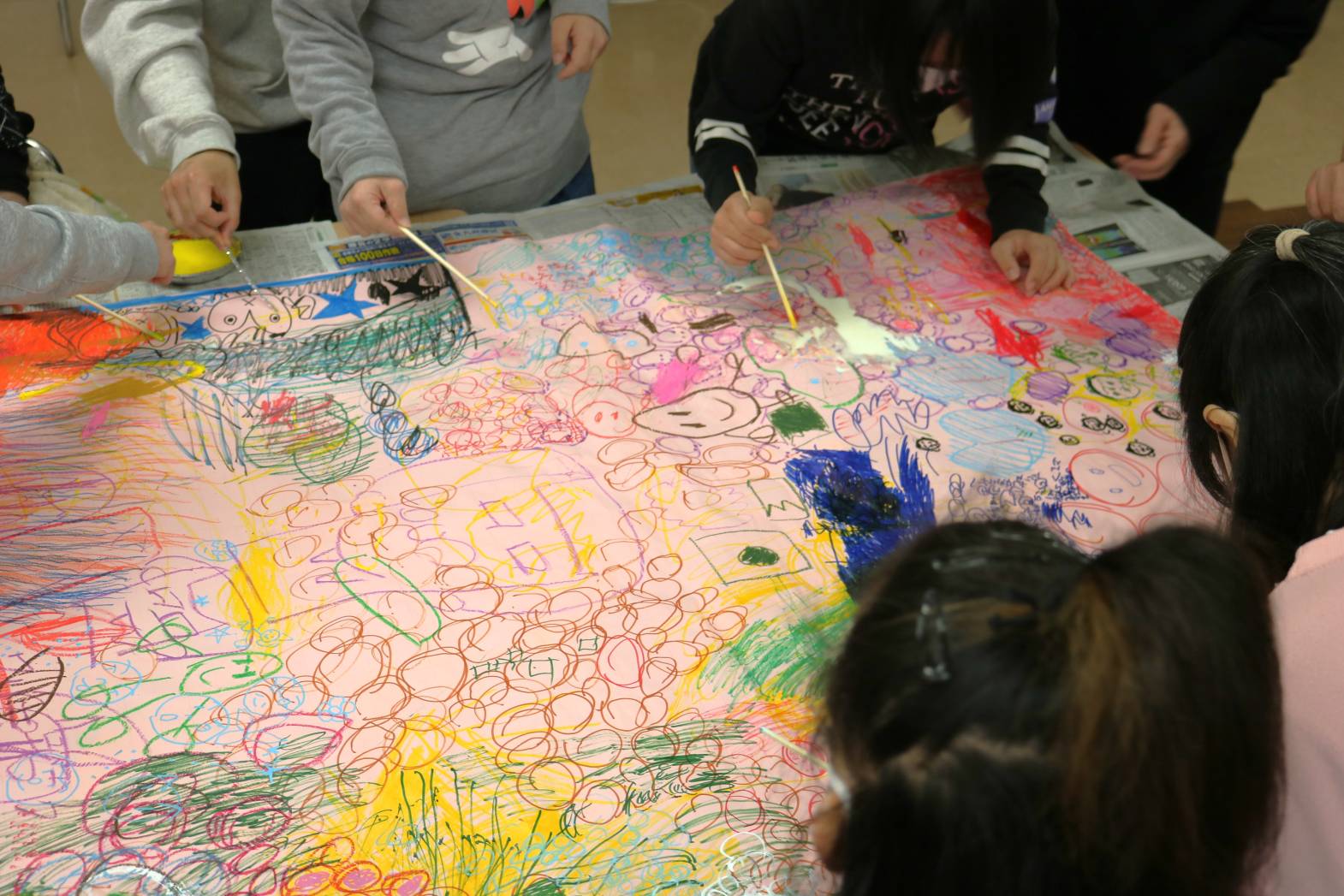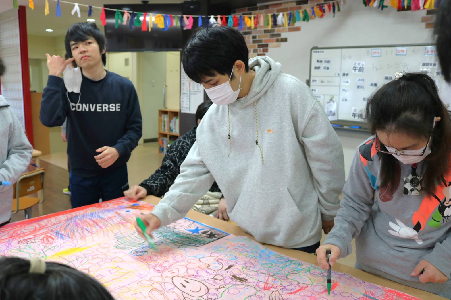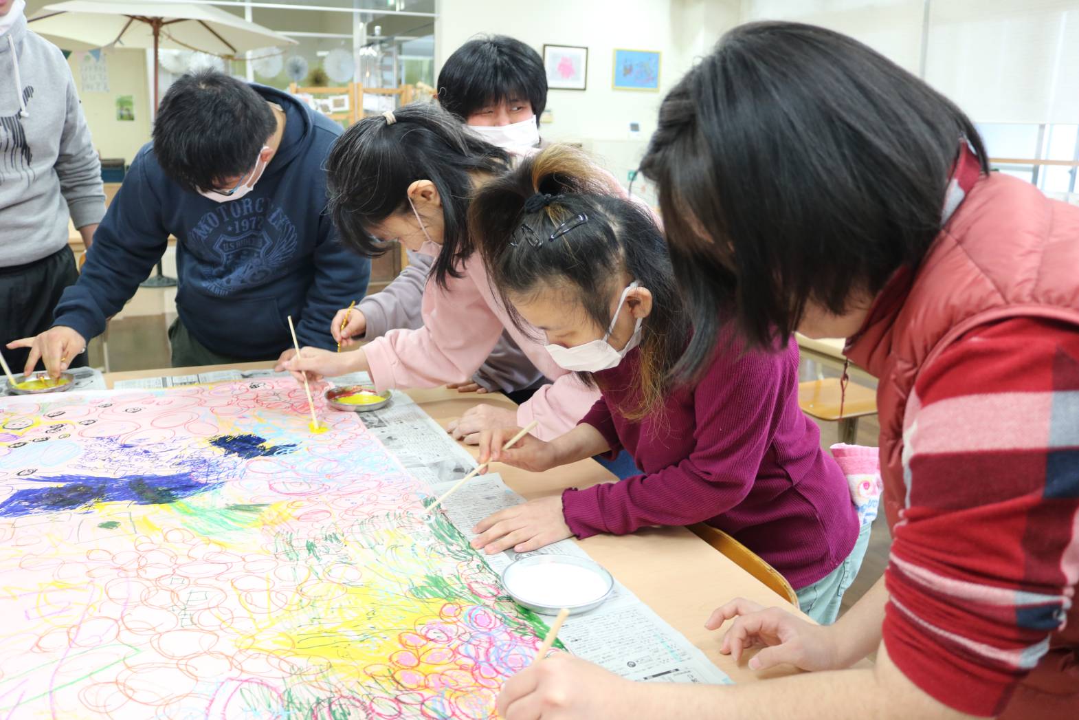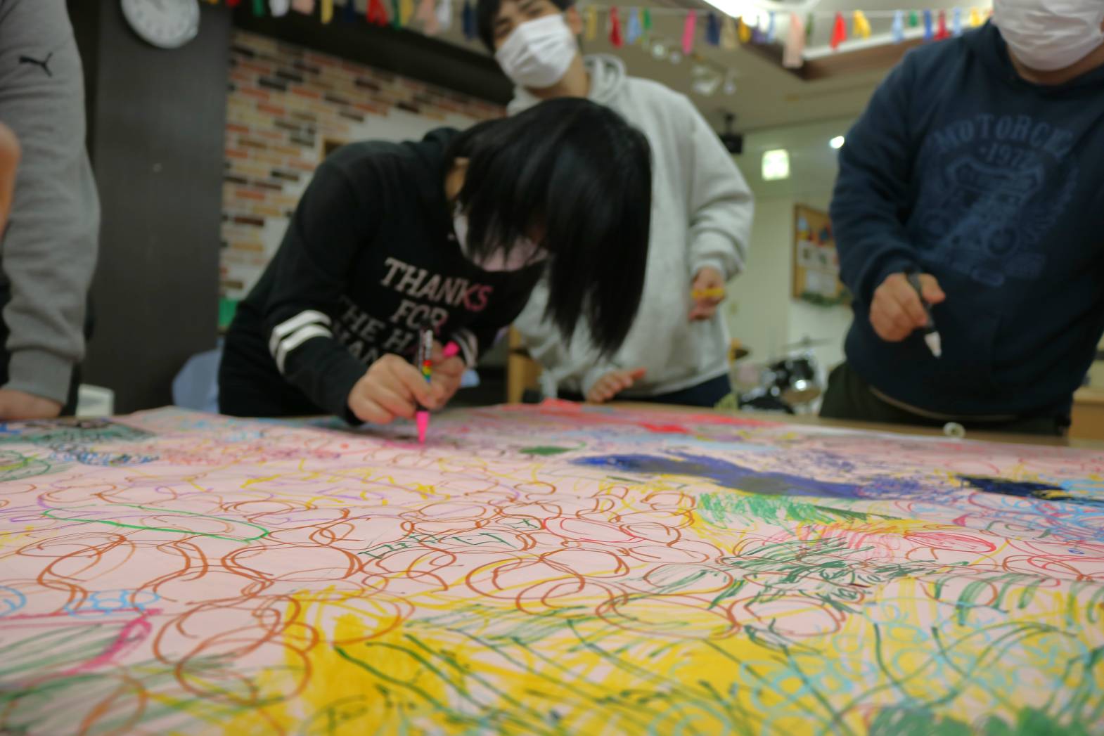 先日のLet’sアートにて、皆さんで一緒に制作した大きな作品の続きをしました。 今回はペンやクレヨンに加え、割りばしペンを使って取り組みました。 皆さんと少しずつ制作していき、今年度の最後の作品として 完成させたいと考えています。 支援員もどのような作品になるのか楽しみにしております。