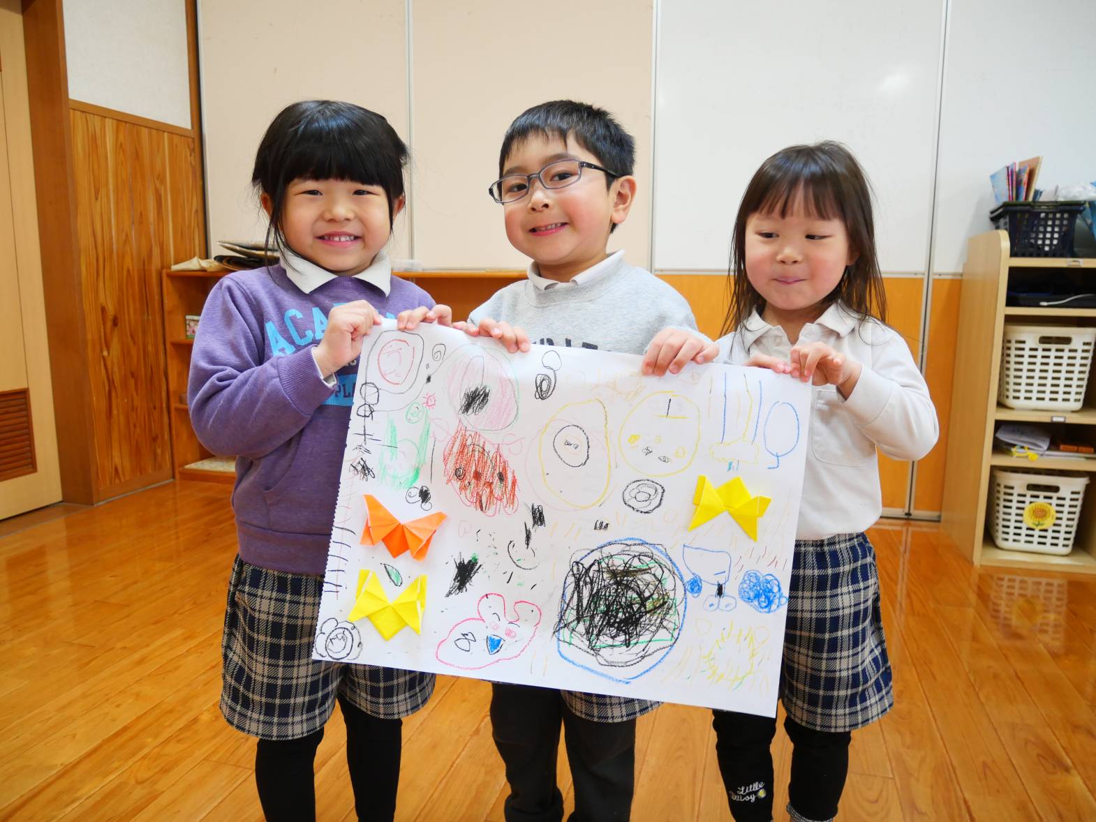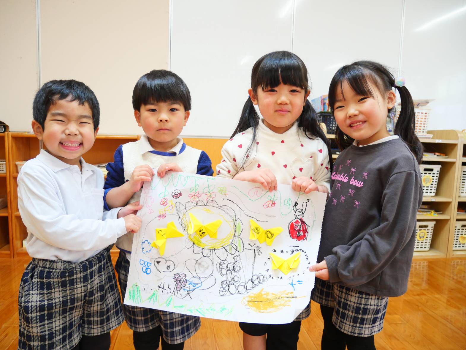 完成したちょうちょは、大きな紙に貼り、友だちと一緒に絵を描いていきます。「ちょうちょさんはお花が好きだよね。」、「ちょうちょさんだけじゃ、寂しいからお友だちの虫さんも描いてあげよう!」と、友だちと一緒に楽しく製作活動をすることができたうさぎ組さんです♪