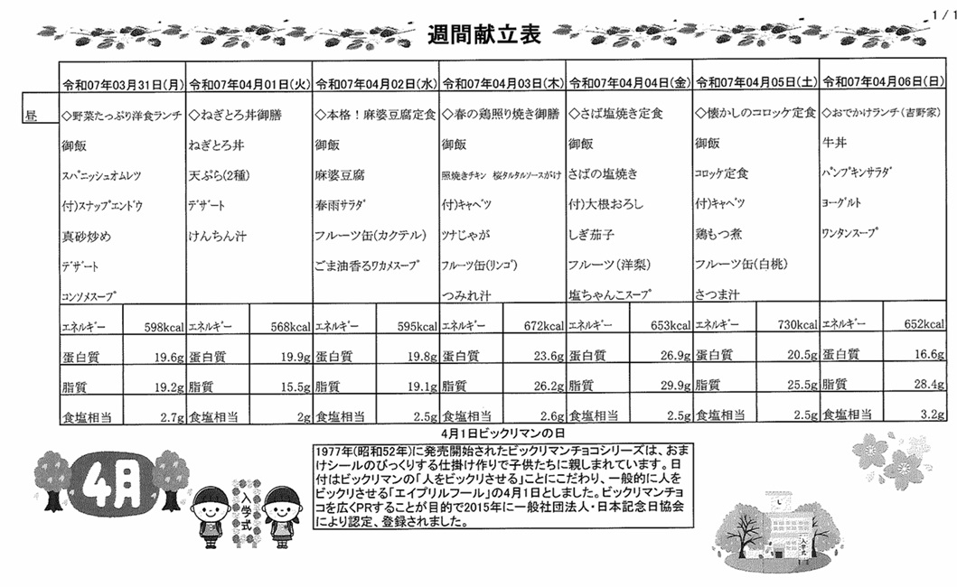 3月31日(月)~4月6日(日)の献立表になります。ぜひご覧ください。