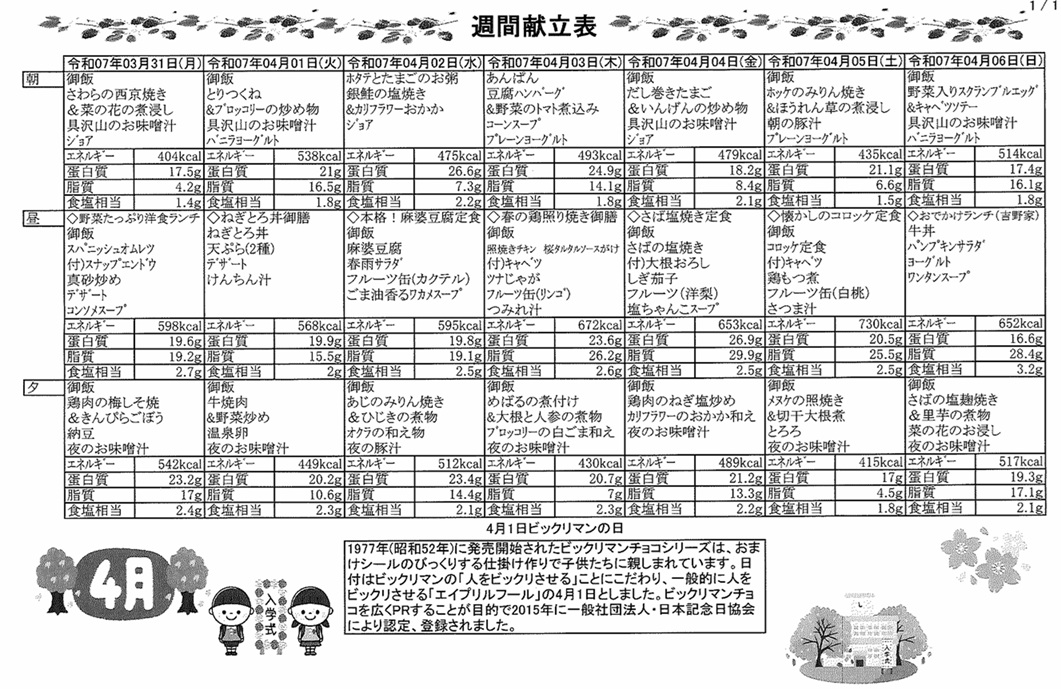 3月31日(月)~4月6日(日)の献立表になります。ぜひご覧ください。