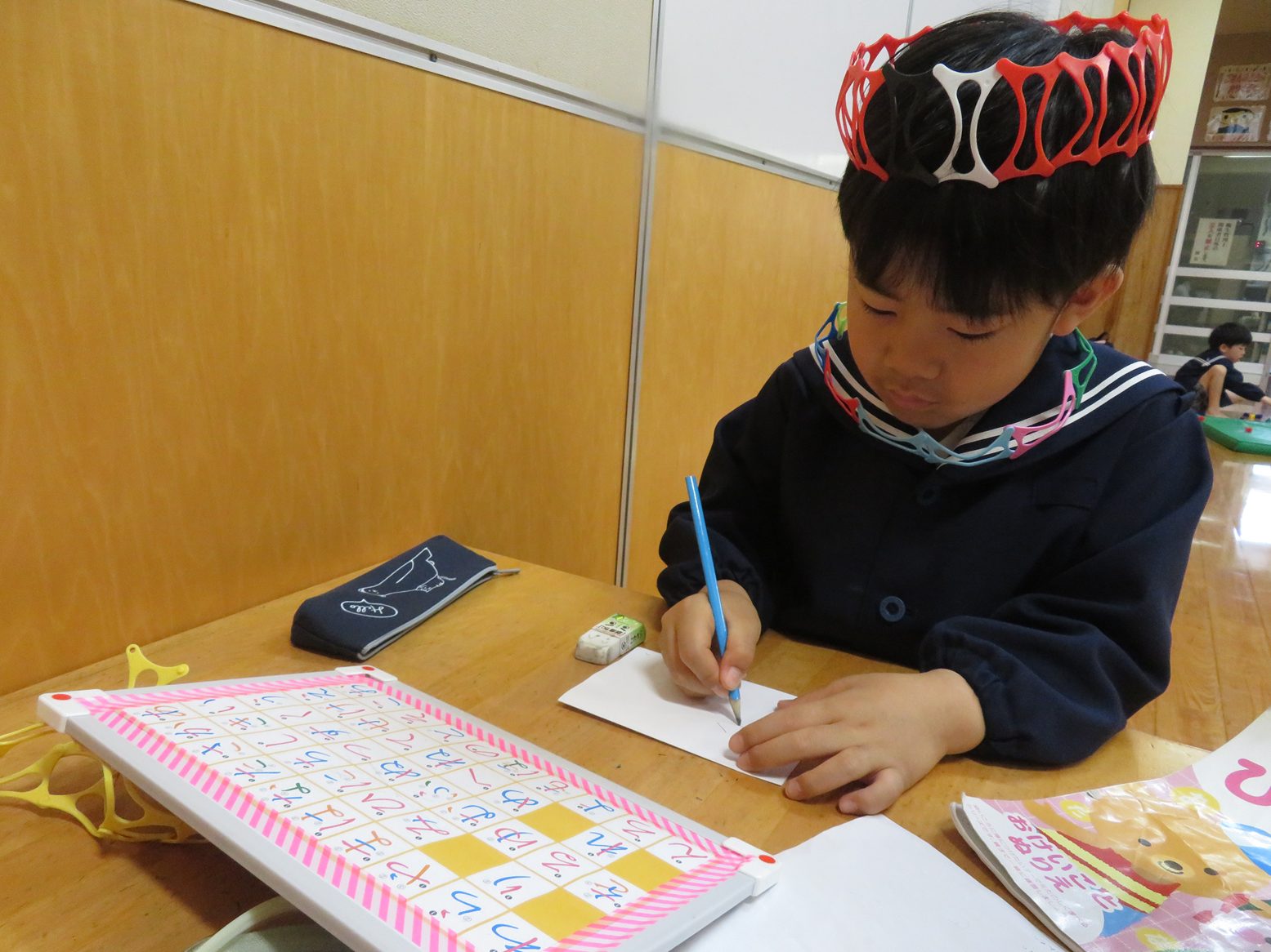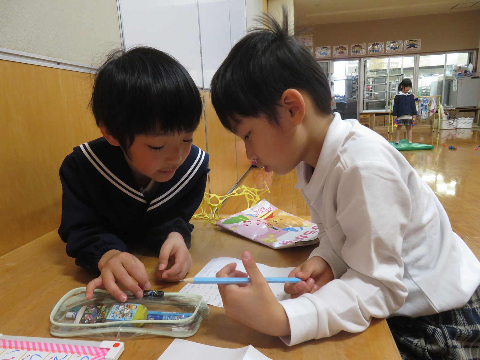 「お手紙書く!」、「今日は誰に手紙を書こうかな?」と宛先リストを見ながら誰に手紙を書くか考えたり、「なんて書こうかな?」と手紙の内容を考えたりと、一つひとつ考える場面では真剣な様子や笑顔を覗かせる子どもたち。