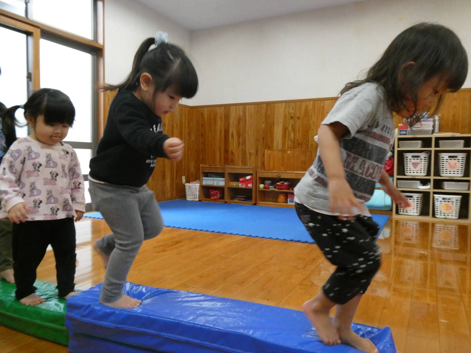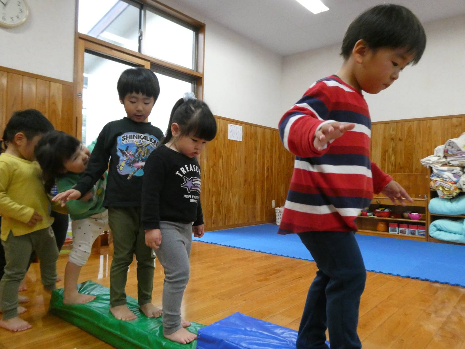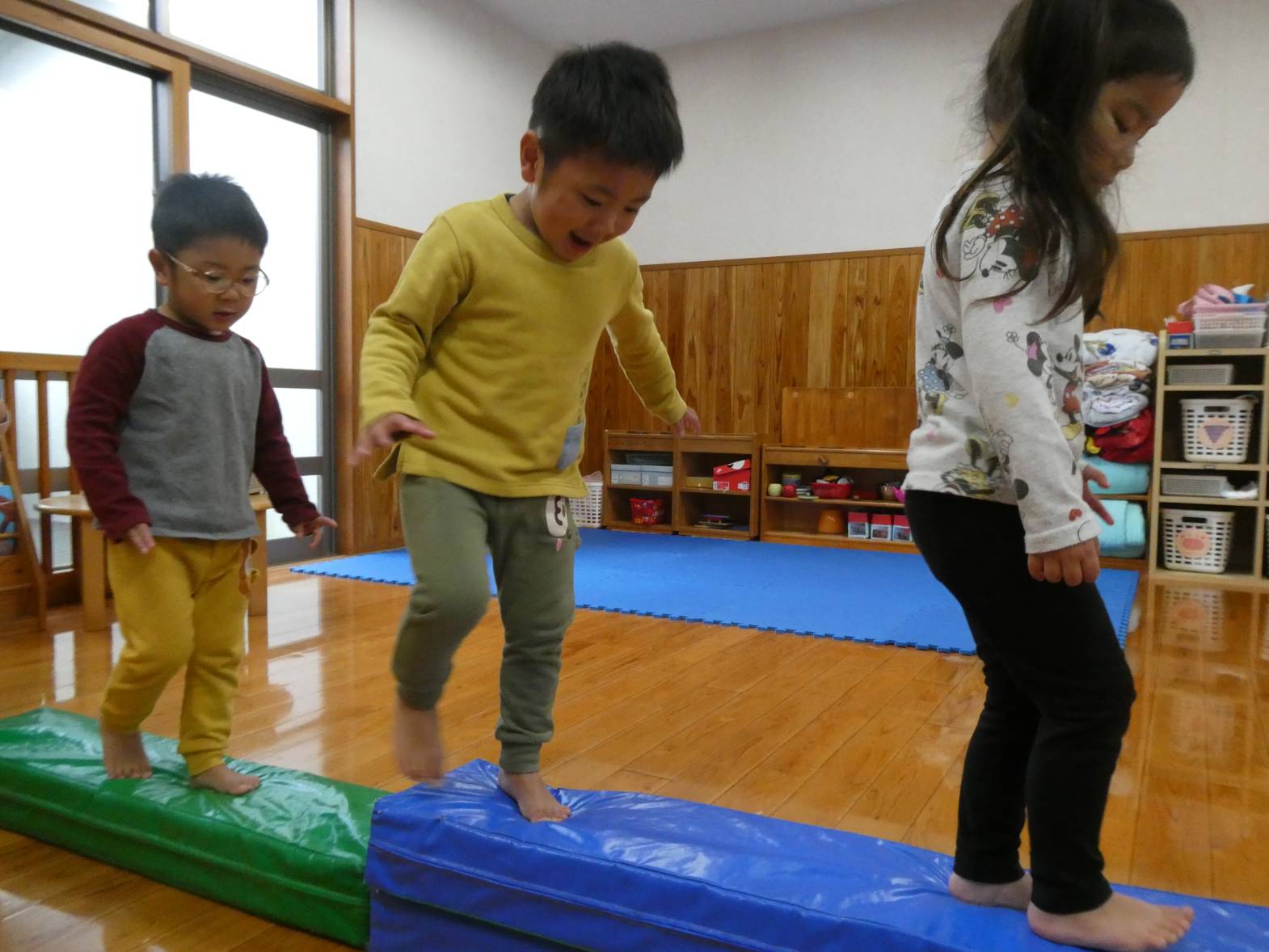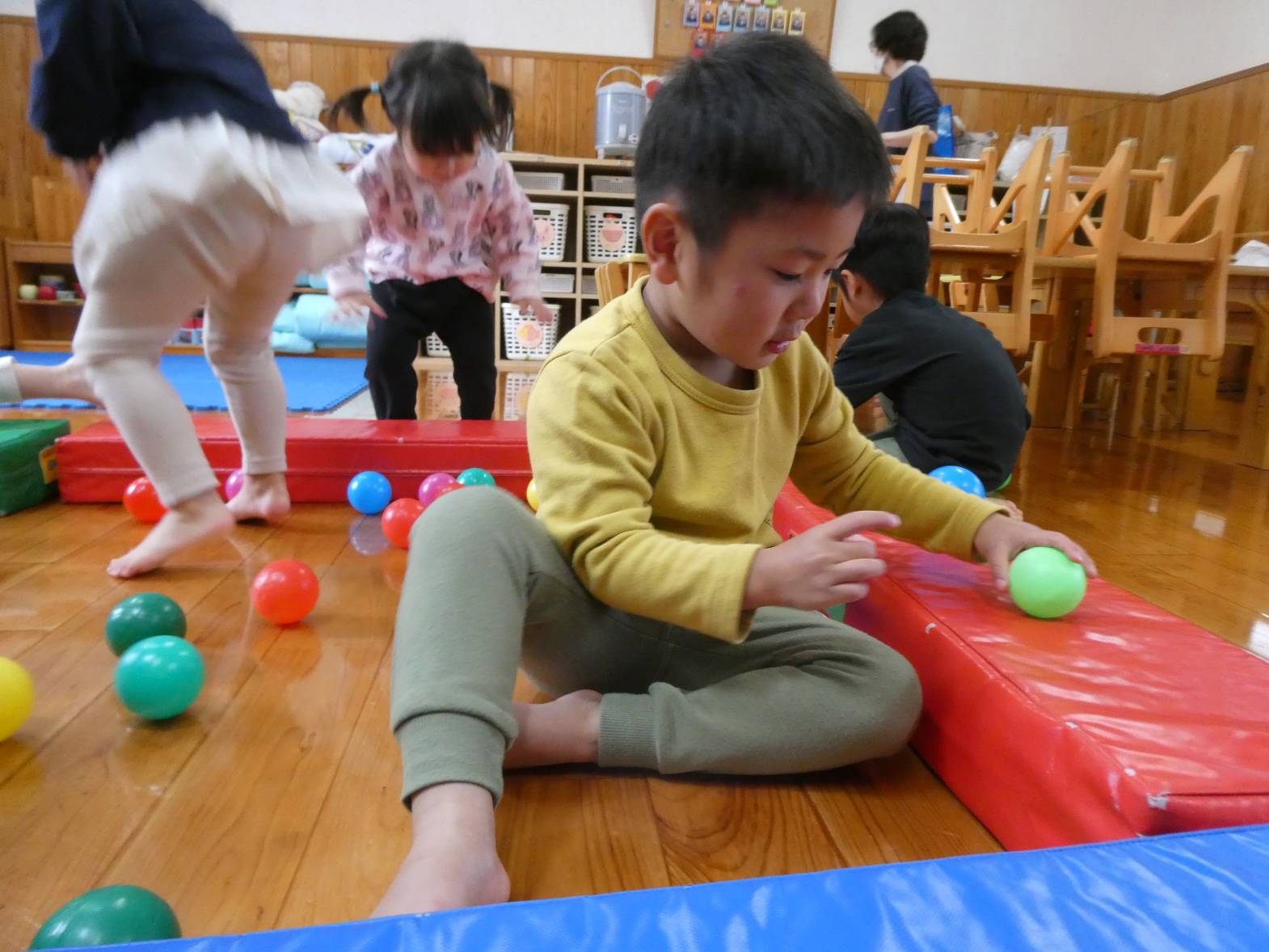 昨日と今日は、ボールやマットを使って体をたくさん動かしました! 子どもたちが大好きなボールプールを組み立てると、「やった!ボールプールだ!」と嬉しそうな様子が見られました。 マット遊びでは、細長いマットを繋げたり高く積んだりした上を「おっとっと!」、「落ちないようにしないと…」と慎重に渡る子どもたち。 色んなことがあった一年間でしたが、子どもたちの成長をそばで見守ることができて本当によかったです! ぱんだ組さんで過ごした思い出を忘れずに、かっこいいりす組さんになってね!