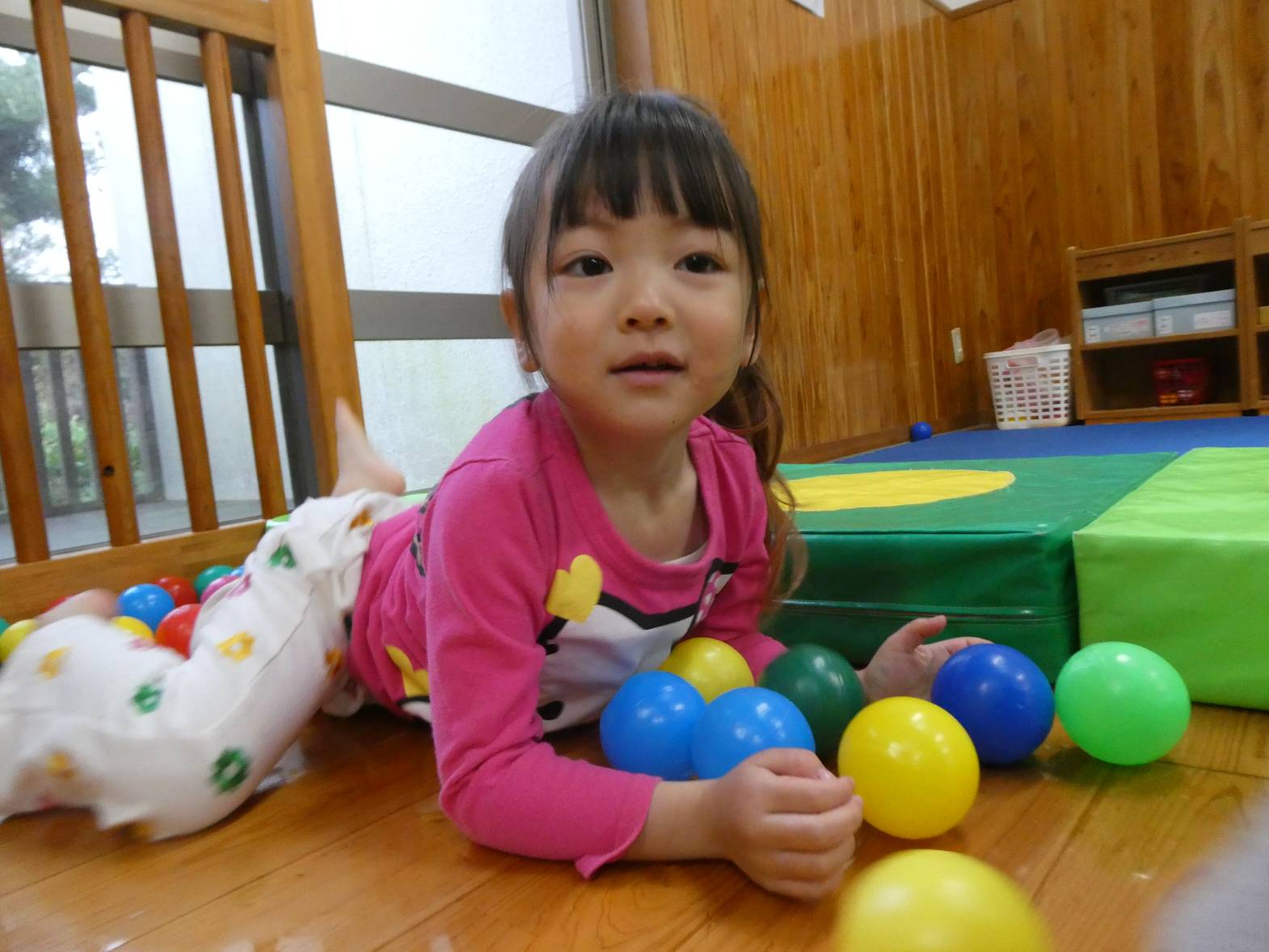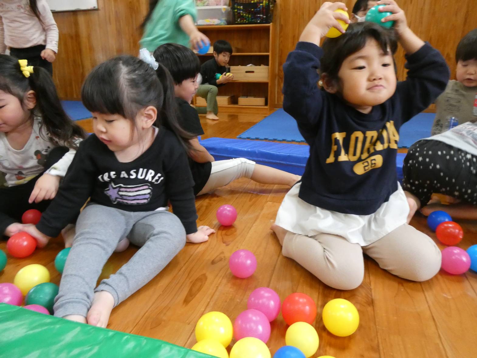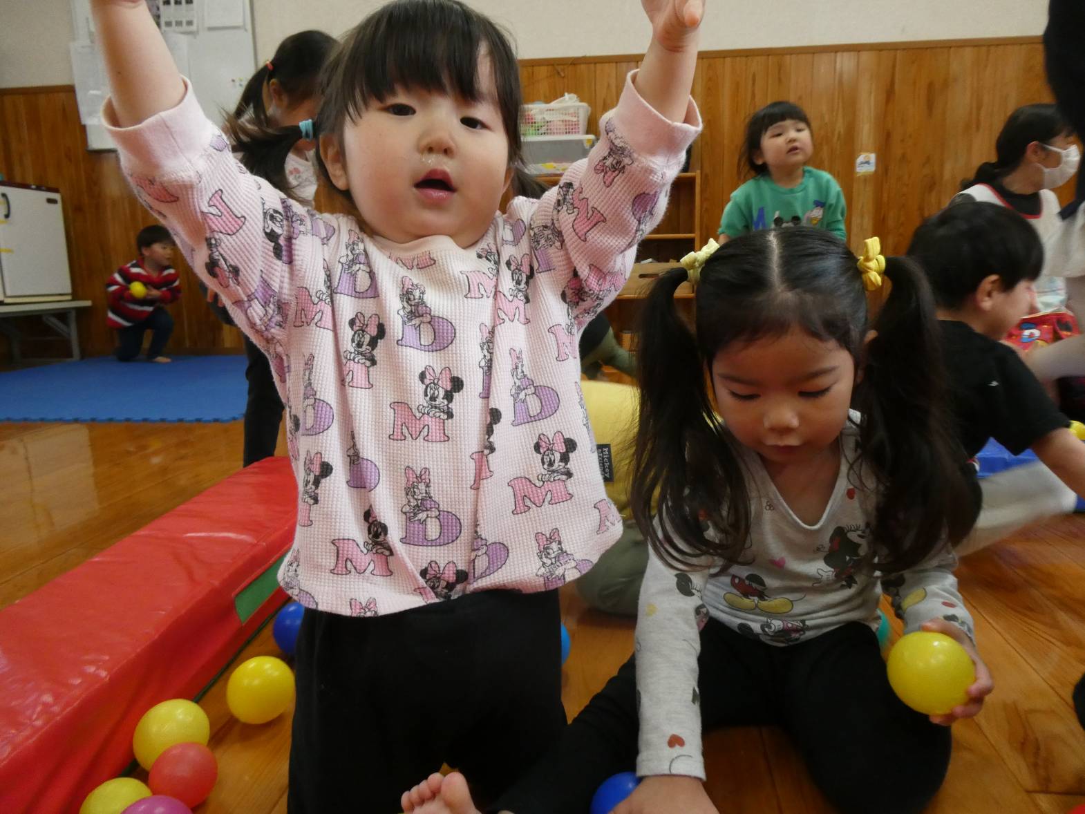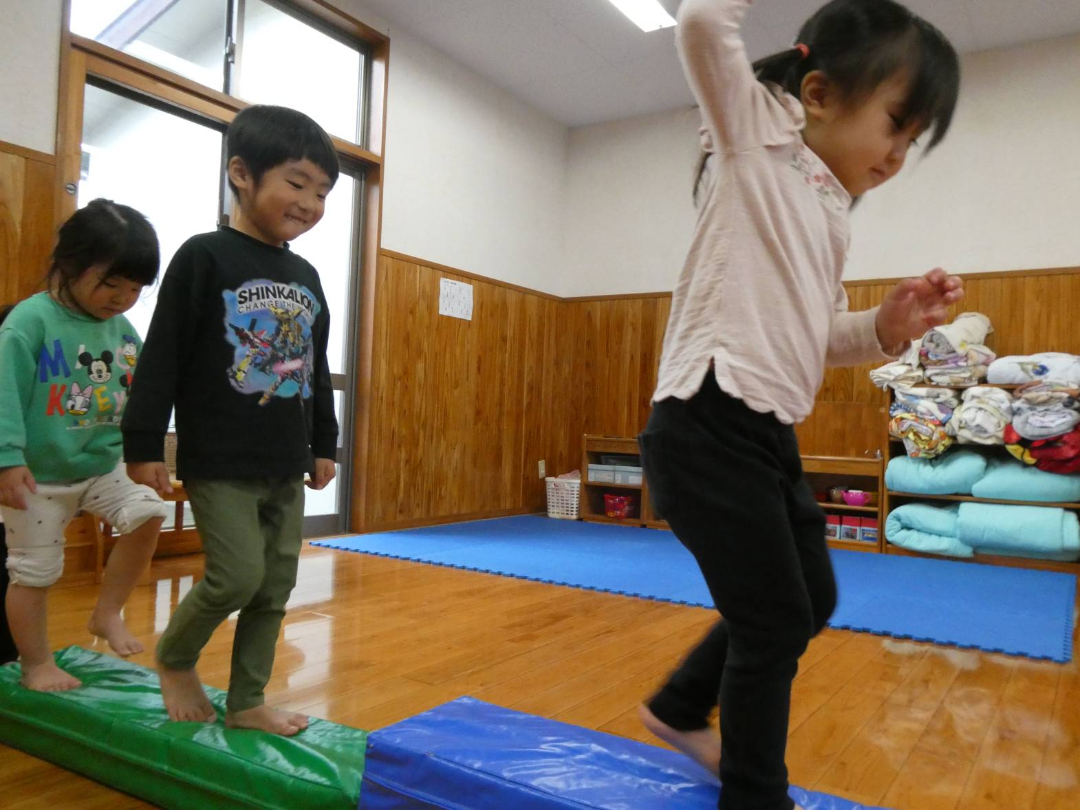 昨日と今日は、ボールやマットを使って体をたくさん動かしました! 子どもたちが大好きなボールプールを組み立てると、「やった!ボールプールだ!」と嬉しそうな様子が見られました。 マット遊びでは、細長いマットを繋げたり高く積んだりした上を「おっとっと!」、「落ちないようにしないと…」と慎重に渡る子どもたち。 色んなことがあった一年間でしたが、子どもたちの成長をそばで見守ることができて本当によかったです! ぱんだ組さんで過ごした思い出を忘れずに、かっこいいりす組さんになってね!