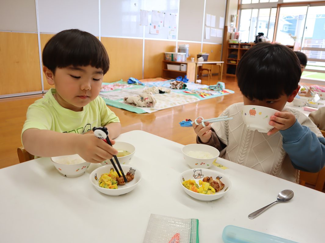 3月になってりす組さんの部屋で過ごしている子どもたち。 過ごす環境や一日の流れなどが変わっていますが、保育者の話をよく聞き一日を過ごしている姿が見られます。 サークルタイムや自分で朝の支度をしたり、給食をもりもり食べたりするぱんだ組さんです。 もちろんおもちゃ遊びも友だちと一緒に思う存分楽しんでいます! この1年間、様々なことに挑戦し、こころも身体も大きく成長した子どもたち。 来年もみんならしく頑張ってね!