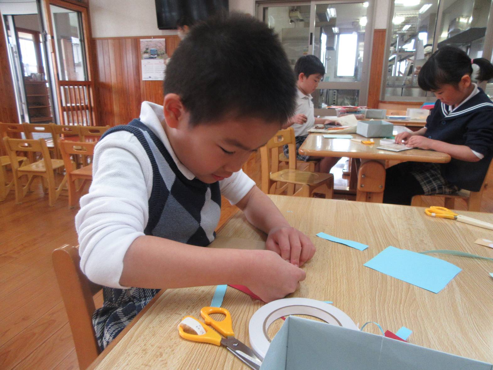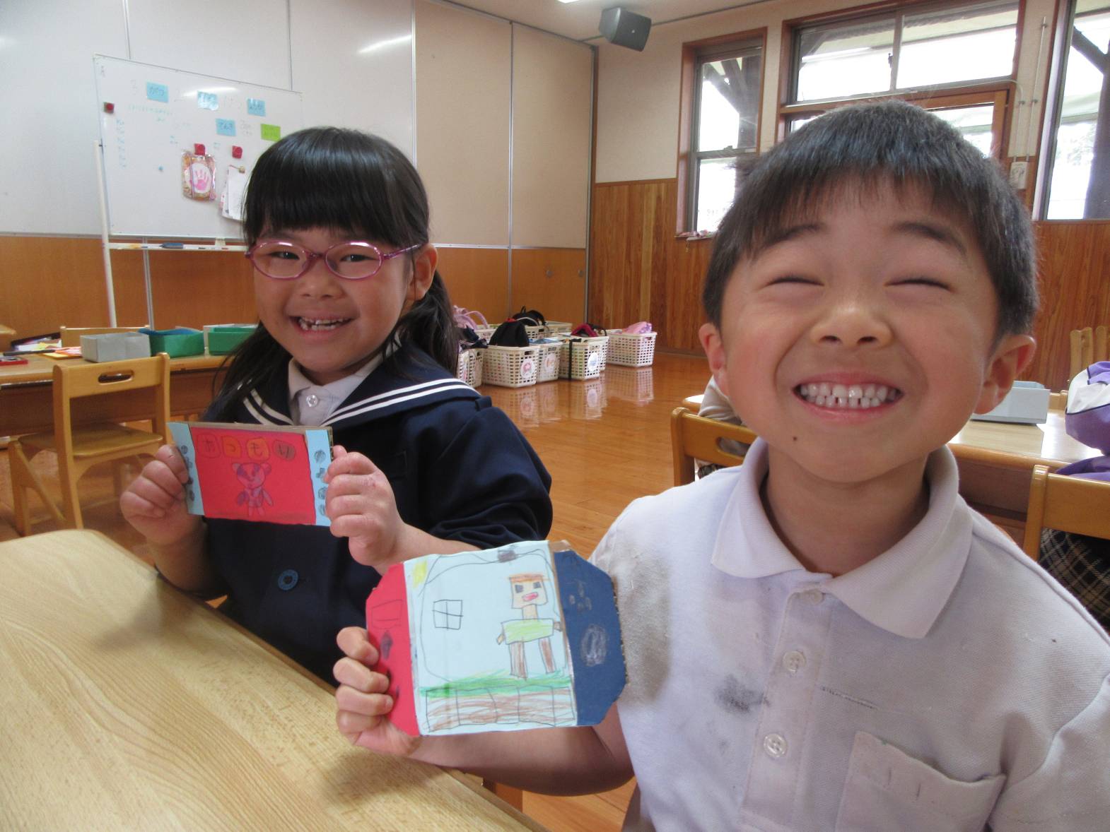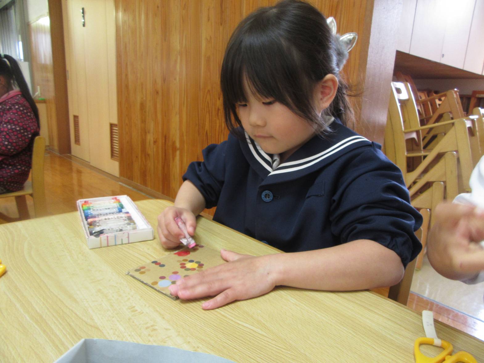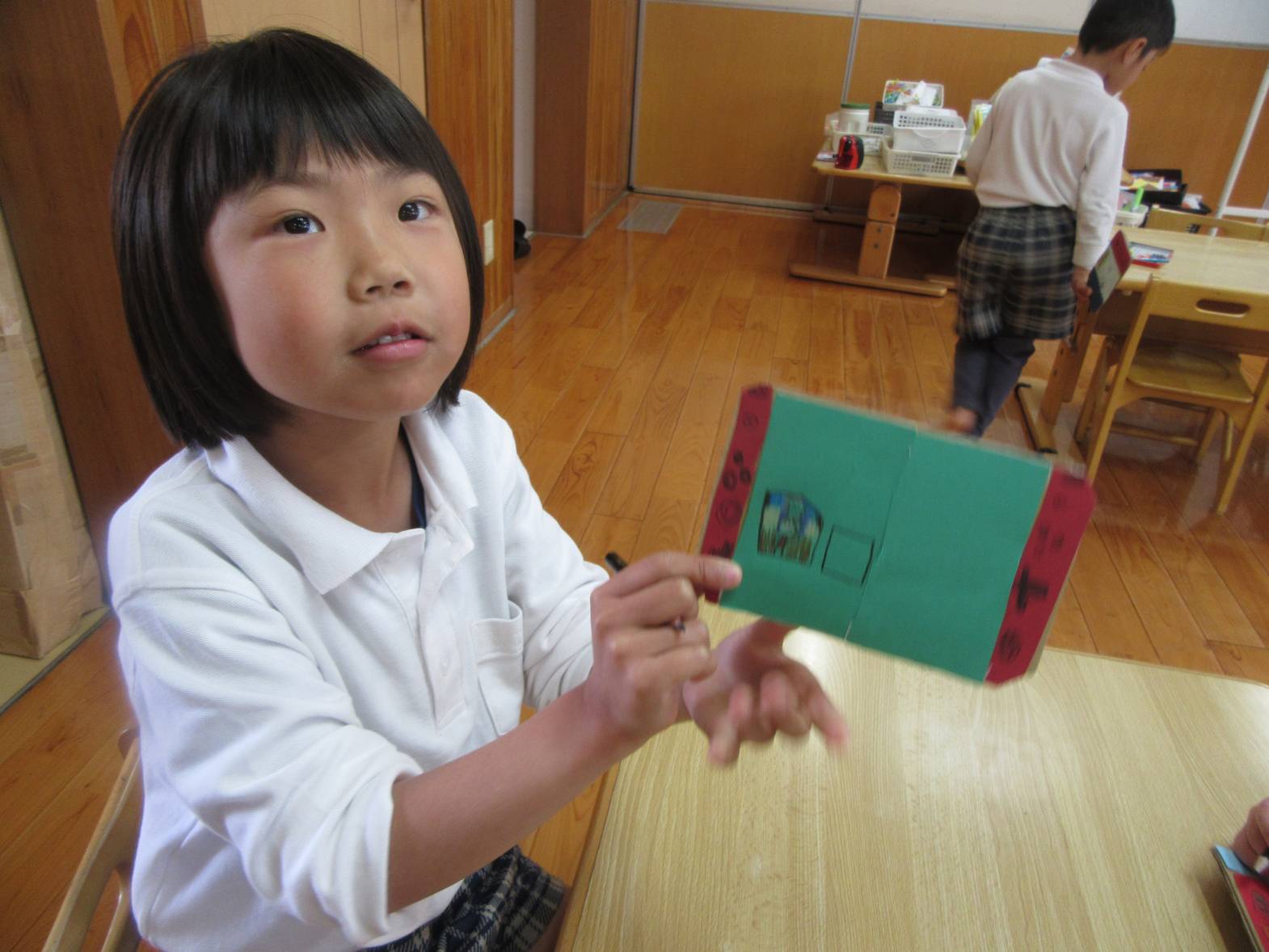 活動で工作活動をしました。 ダンボールや画用紙、ハサミ、テープ、シール等、様々な道具を使い、テーマを決めて作っていく子どもたち。 画用紙を好きな形に切って貼ったり、絵を描いたりと集中して作り進める姿が見られました。 完成した後は、「スイッチを作りました!」、「ハサミで画用紙を切ることを頑張りました。」と、どんなものを作ったのか、どんなところを頑張ったのかみんなの前で発表して、共有することができたきりん組さんでした!