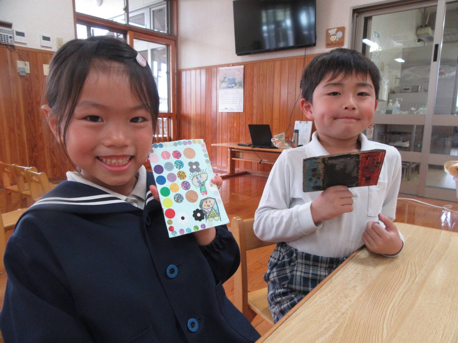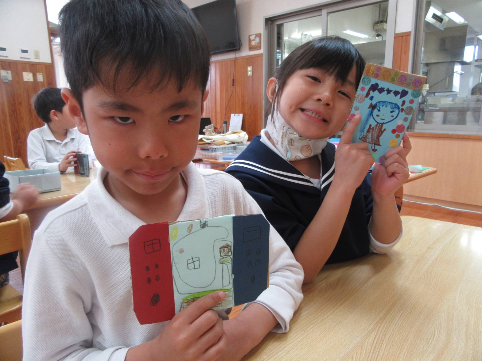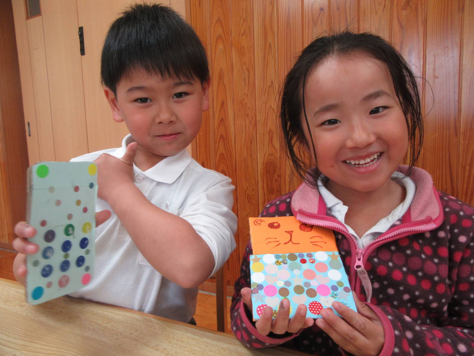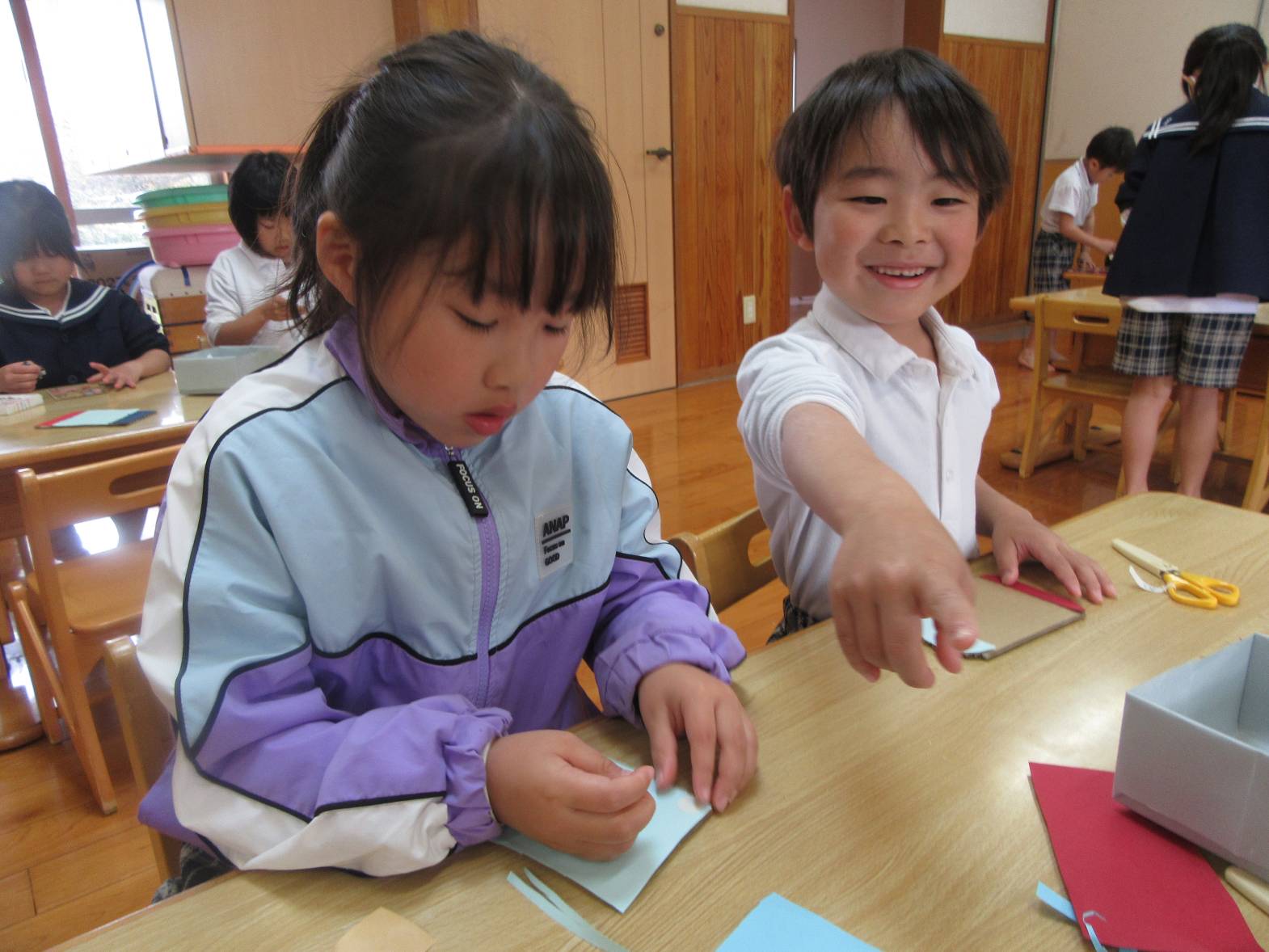 活動で工作活動をしました。 ダンボールや画用紙、ハサミ、テープ、シール等、様々な道具を使い、テーマを決めて作っていく子どもたち。 画用紙を好きな形に切って貼ったり、絵を描いたりと集中して作り進める姿が見られました。 完成した後は、「スイッチを作りました!」、「ハサミで画用紙を切ることを頑張りました。」と、どんなものを作ったのか、どんなところを頑張ったのかみんなの前で発表して、共有することができたきりん組さんでした!