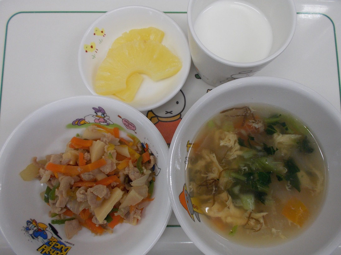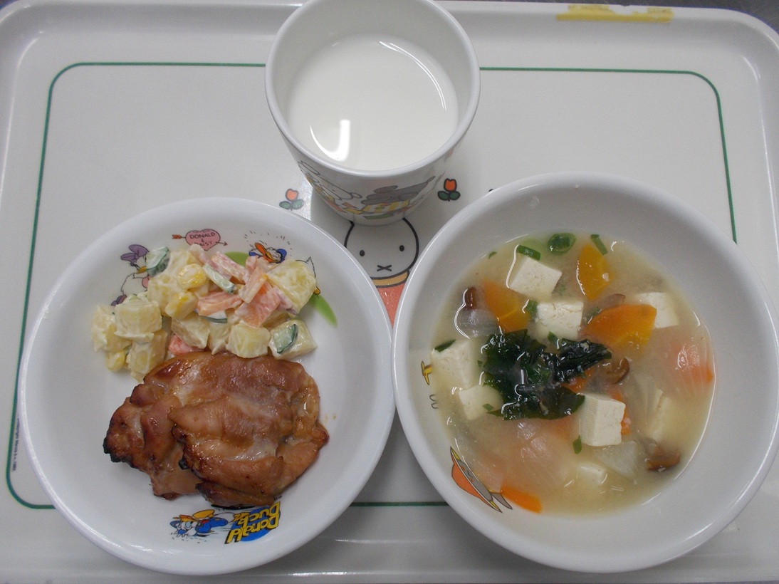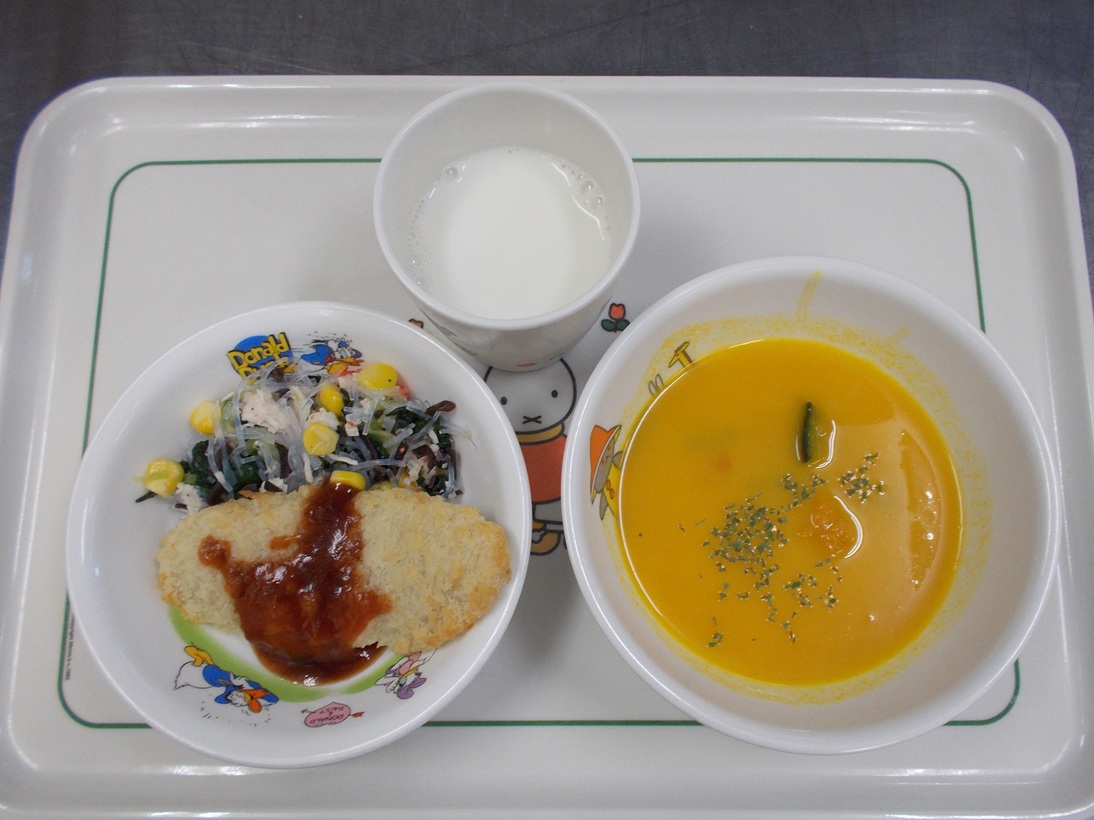 4月2日(水)から4月5日(土)までの給食献立写真の一例です。 ぜひ、ご覧ください。 4月2日(水) 白身魚のフライ 春雨サラダ パンプキンポタージュ 牛乳 キャロットケーキ スキムミルク 4月3日(木) 青椒肉絲 もずくスープ パイナップル 牛乳 みかんヨーグルト ミニサラダ 4月4日(金) 鶏肉の照り焼き かみかみサラダ なめこ汁 牛乳 ココア蒸しパン 麦茶 4月5日(土) 醬油ラーメン キャベツと卵の和え物 ウエハース チーズ 牛乳 バームクーヘン スキムミルク