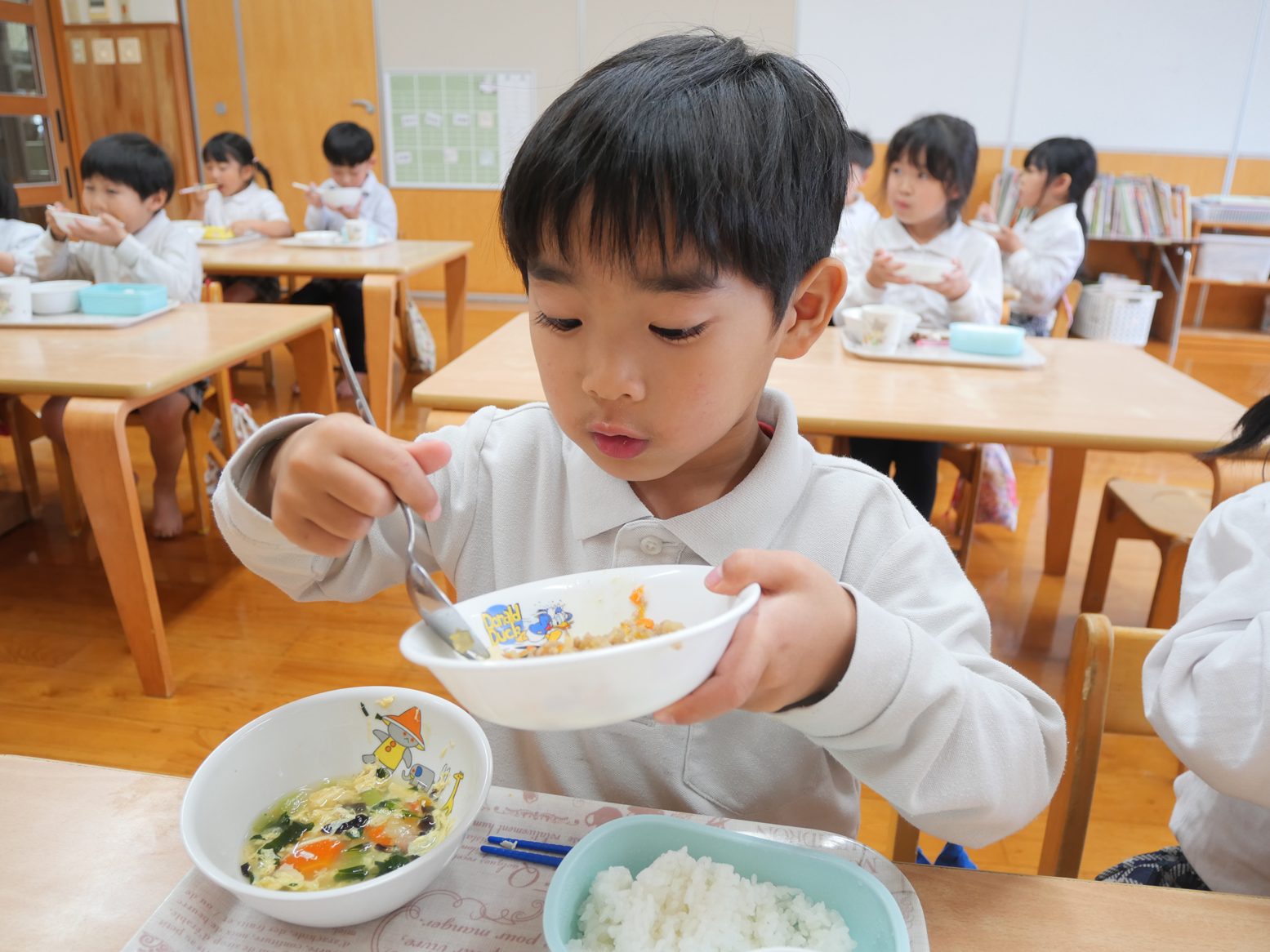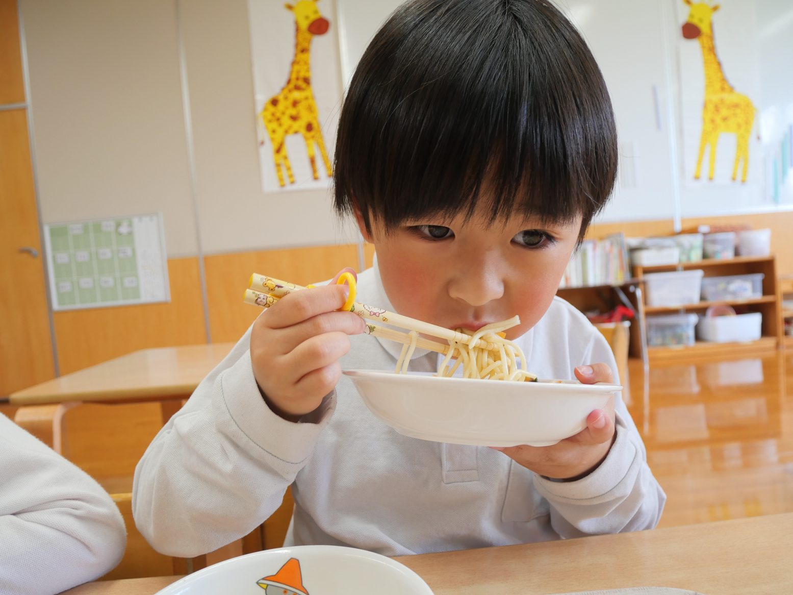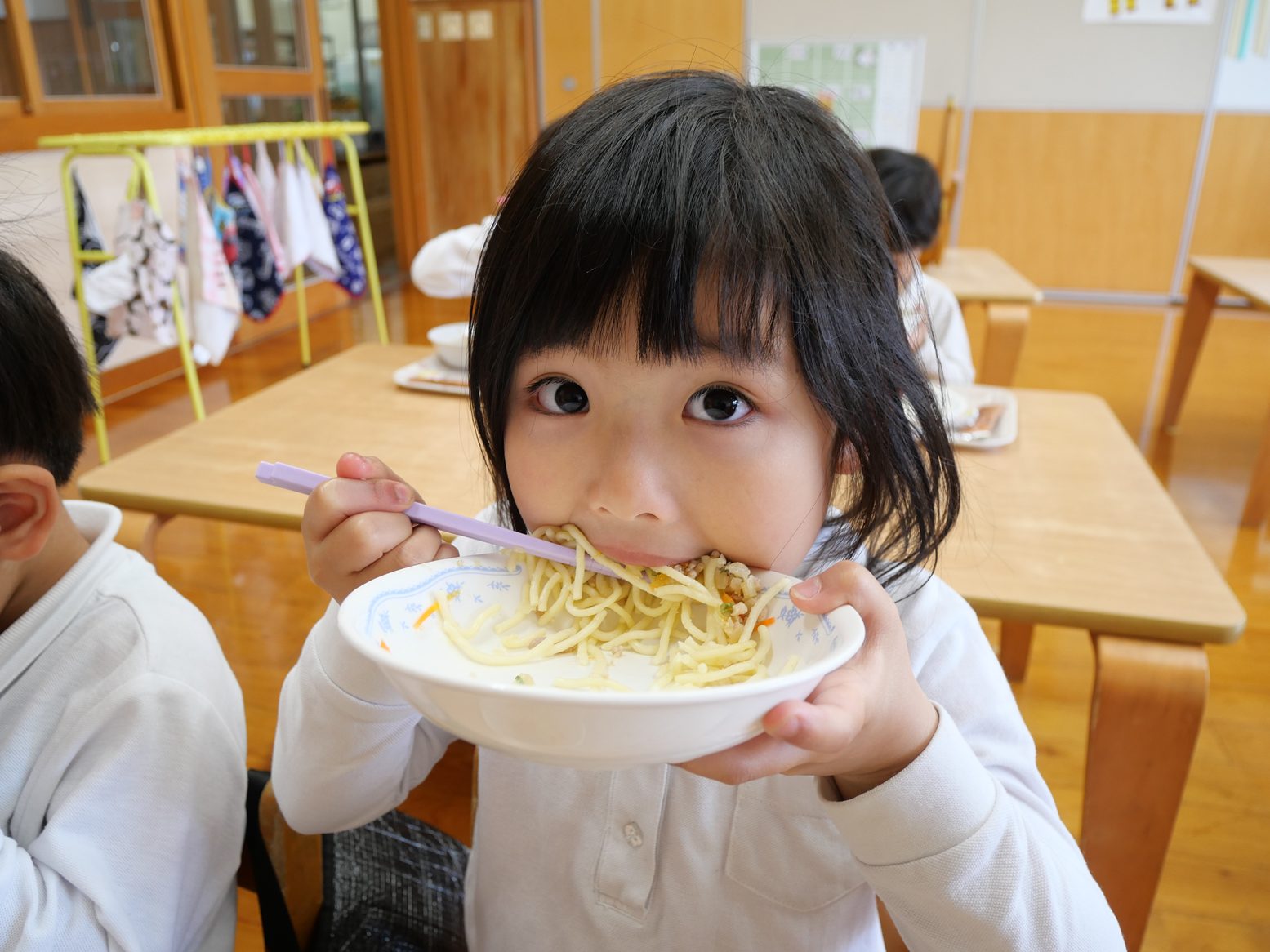給食では「溢さないで食べられるよ!」「自分で食べるよ。」と食べ溢しを意識したり、苦手な物も自分で食べたりする姿が見られるようになりました。