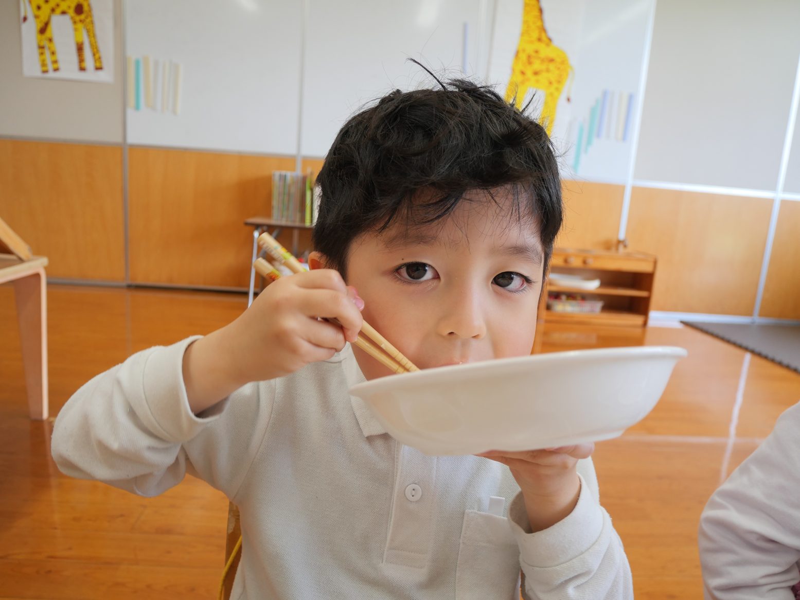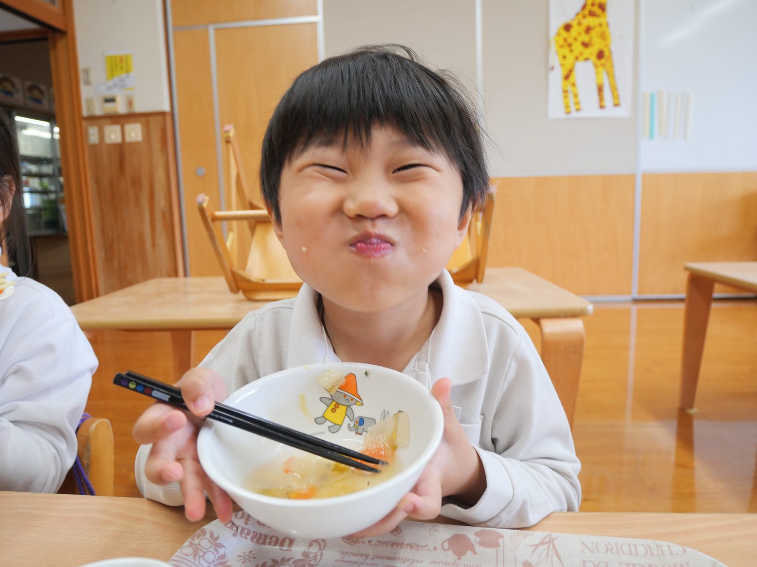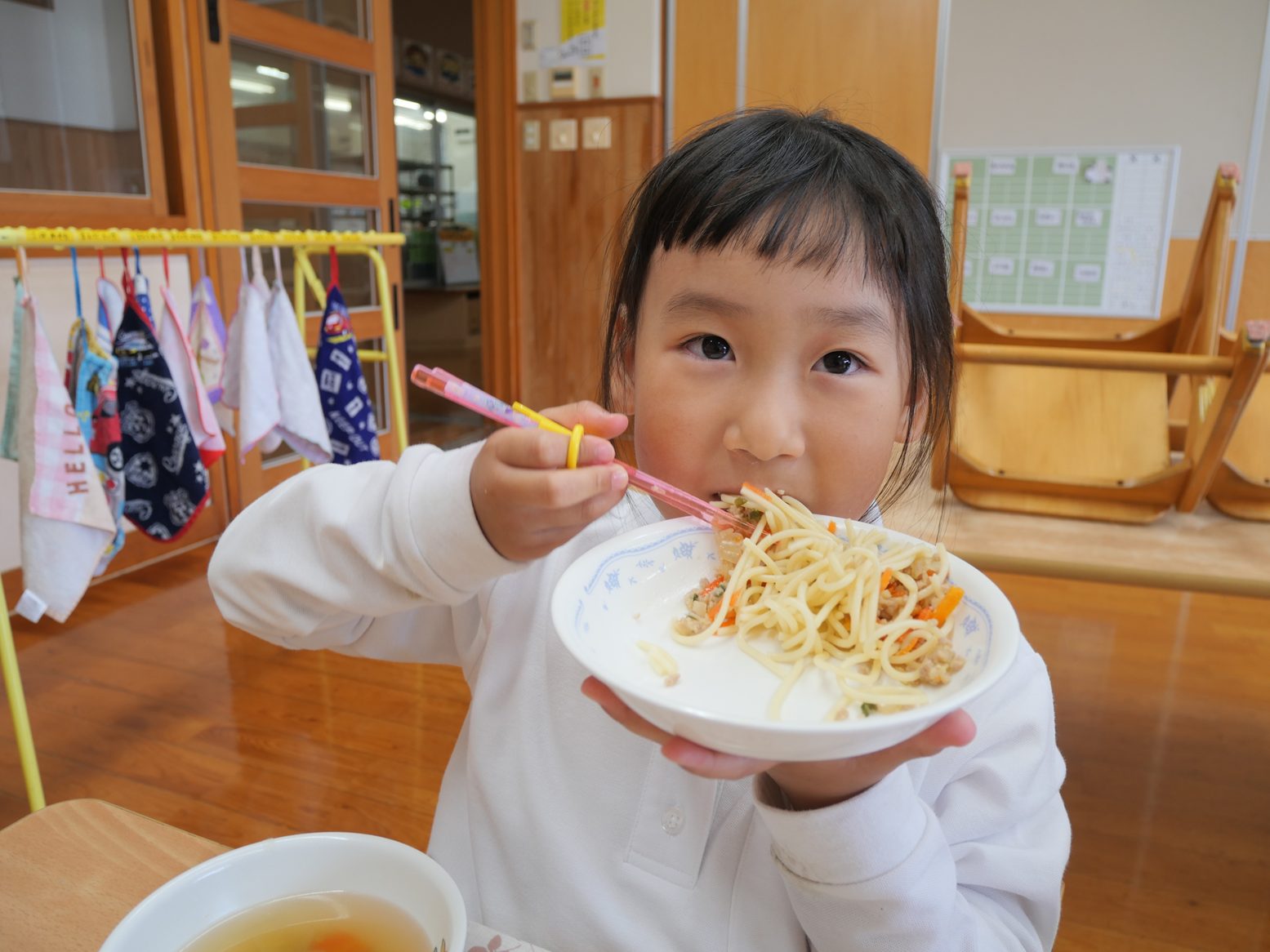 給食では「溢さないで食べられるよ!」「自分で食べるよ。」と食べ溢しを意識したり、苦手な物も自分で食べたりする姿が見られるようになりました。