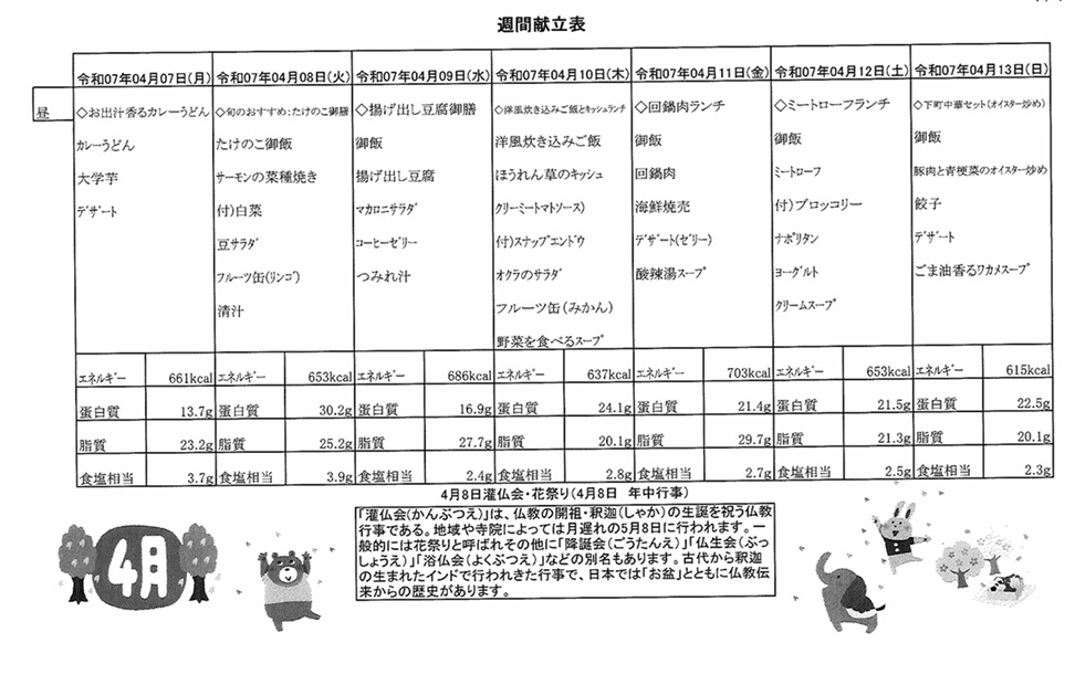 4月7日(月)~4月13日(日)の献立表になります。ぜひご覧ください。