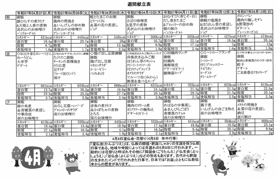 4月7日(月)~4月13日(日)の献立表になります。ぜひご覧ください。