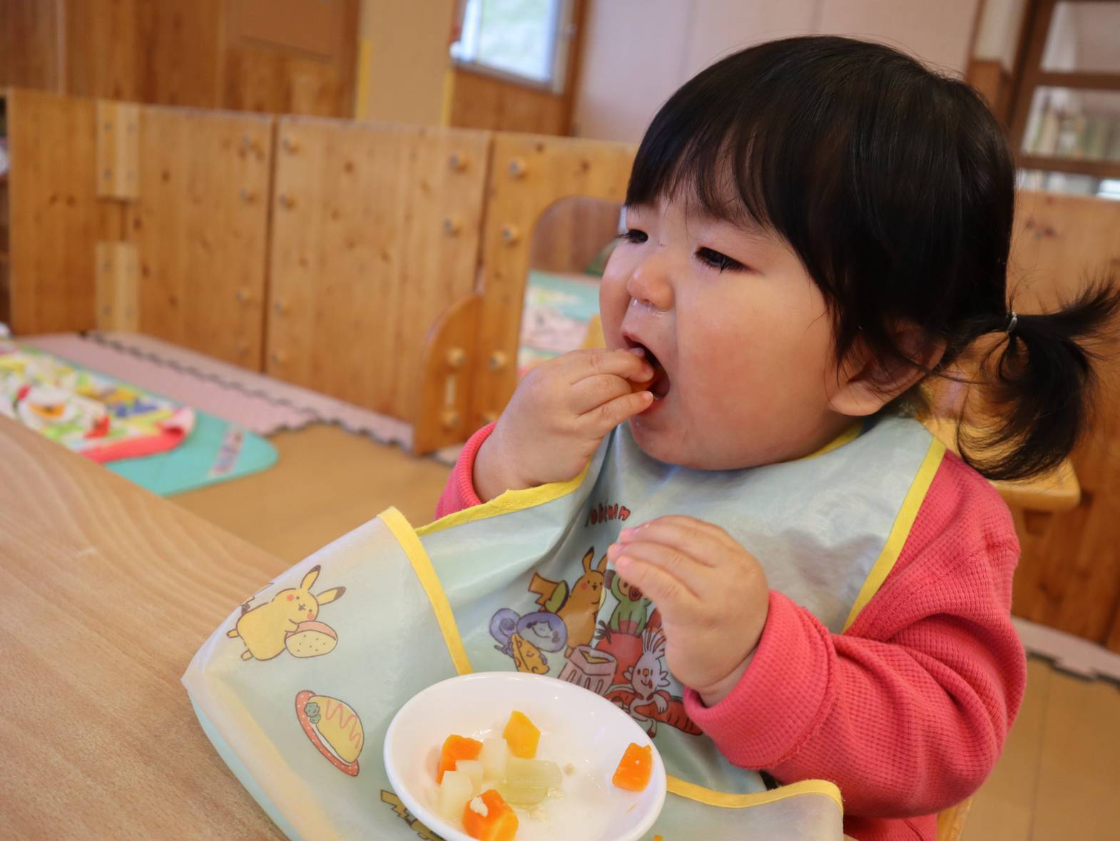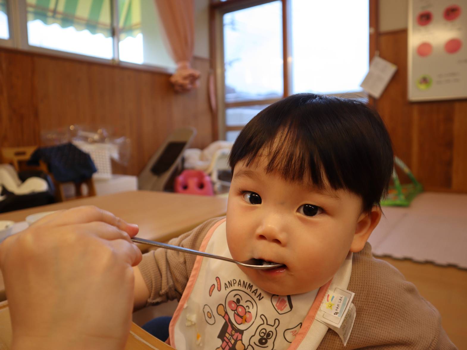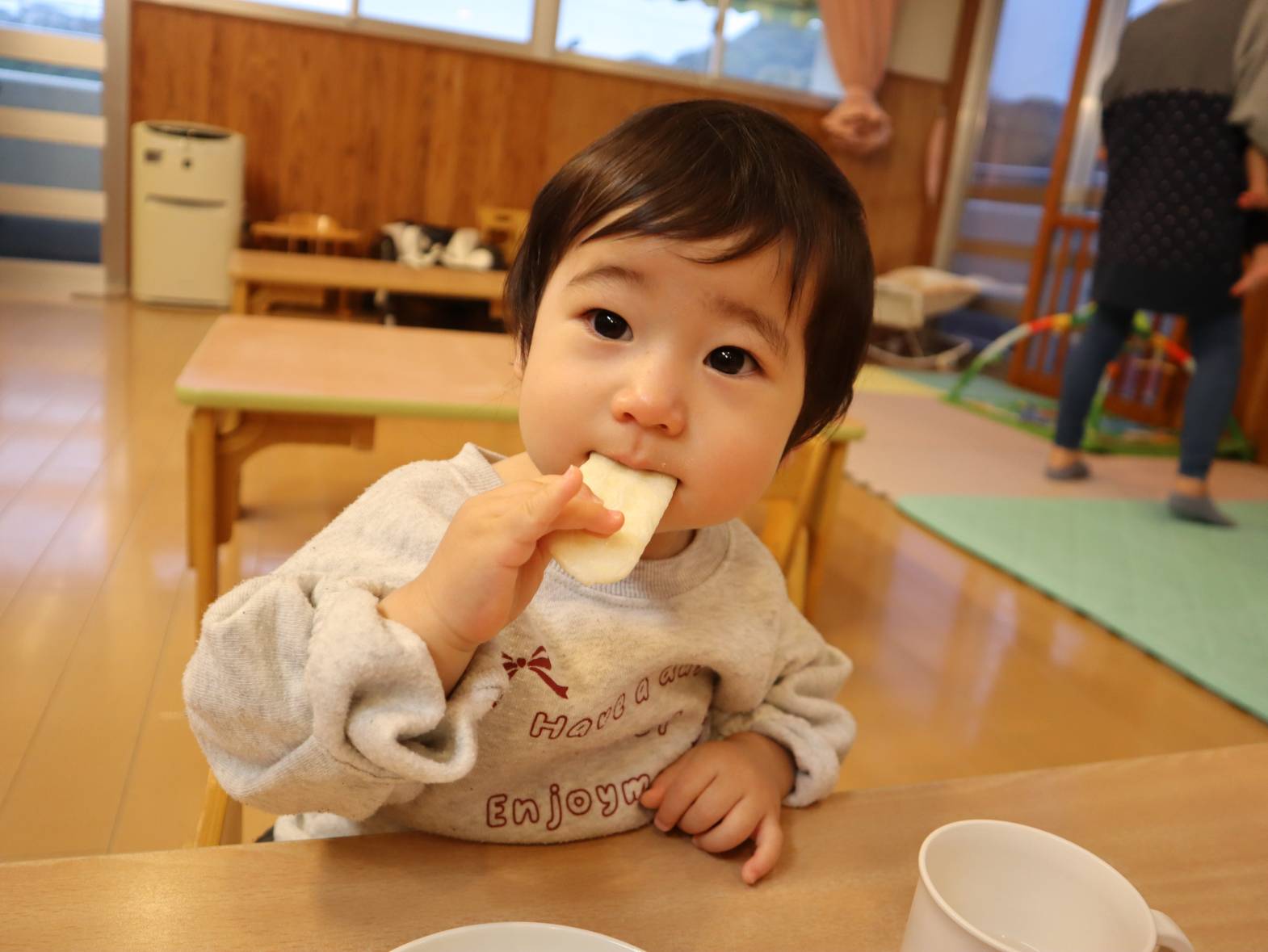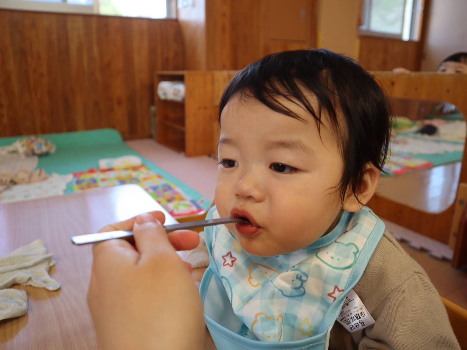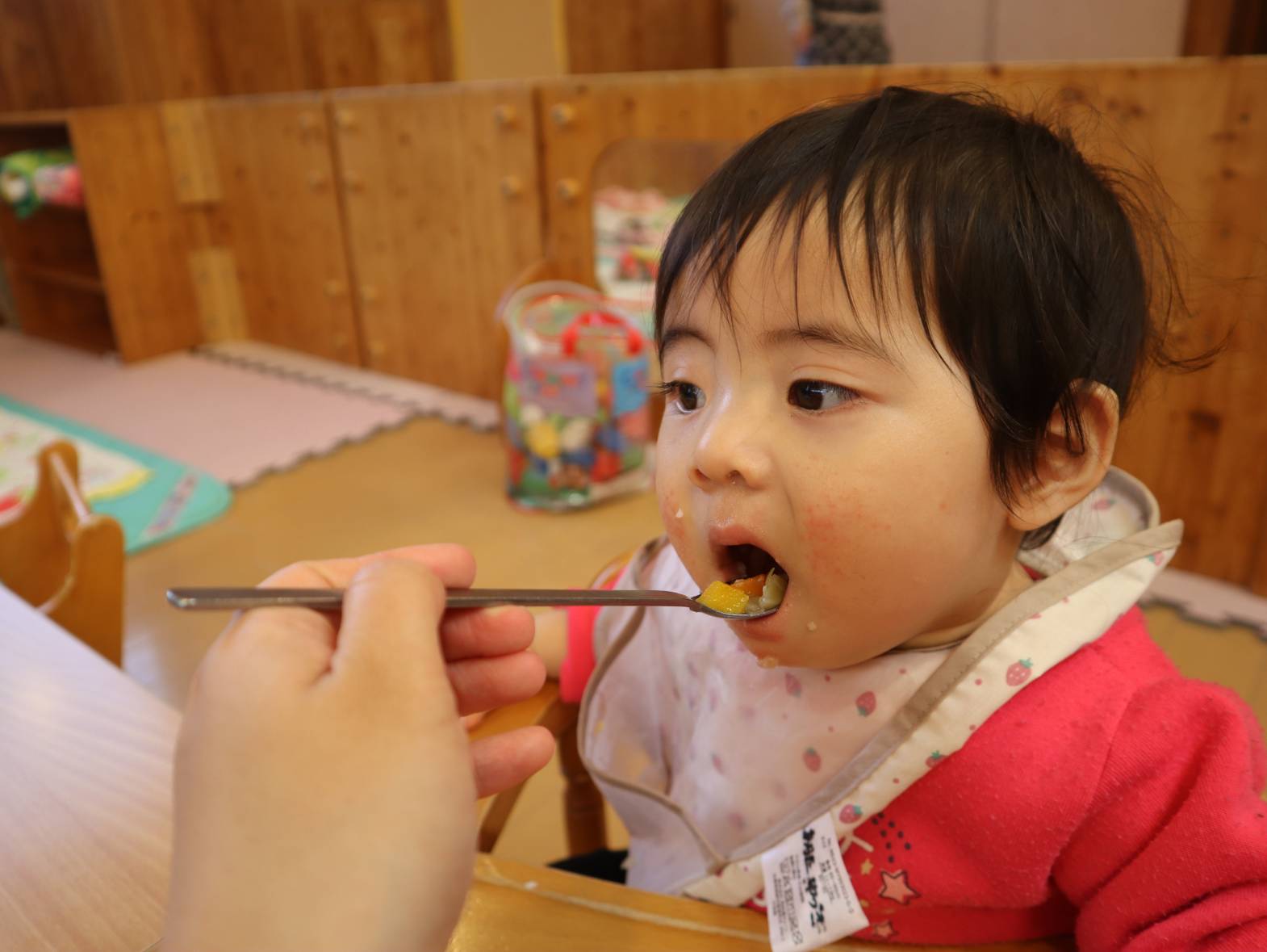 少しずつ新生活に慣れてきたひよこ組さん。 一日の中の楽しみは・・・給食とおやつです! 泣いていても、ご飯を見るとピタッと泣き止む子どもたち。 「あ!」、「うー。」と声を出して早く食べたい気持ちを教えてくれます。 大きく口を開けたり、自分で手掴みしたりしながら意欲的に食べ進めていますよ! 子どもたちが笑顔で楽しく食べられるよう、丁寧に援助を行っていきたいと思います。