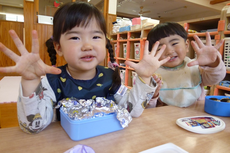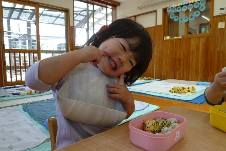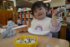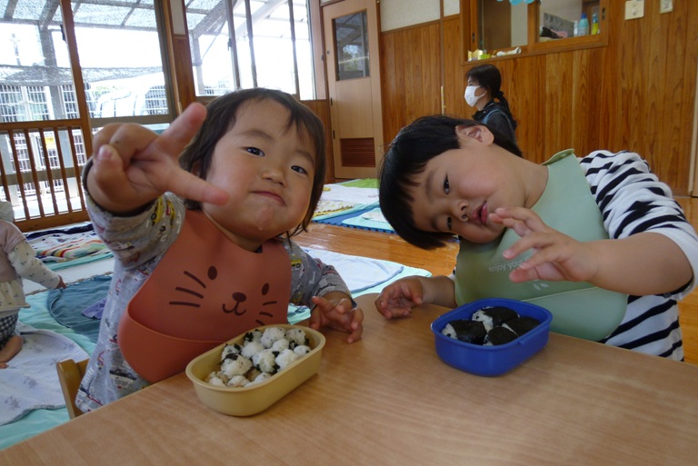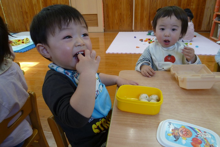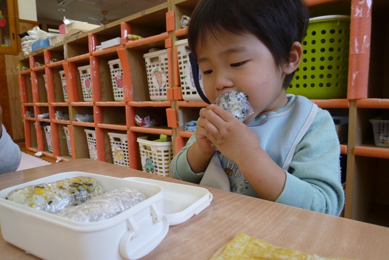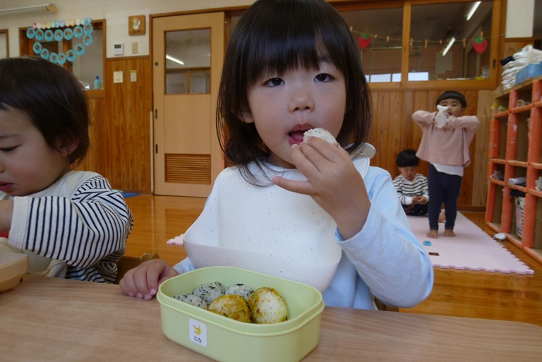 今日は子どもたちの大好きなおむすびの日!! 登園すると嬉しそうに「おにぎりもってきた~!」や「ママがつくってくれた!」と教えに来てくれました。 お外でいっぱい遊んでいるときも「おにぎりたべる?」「おにぎりまだ?」と聞きにくる子どもたちです! おむすびの時間が楽しみでわくわくしながらお部屋に帰るぱんだぐみさんでした。 そしてずーっと楽しみにしていたおむすびの時間!! 「おいしい~!」と言いながら、大きなお口で幸せそうに食べ進め・・・ あっという間に完食でした☆彡 ご準備ありがとうございました!