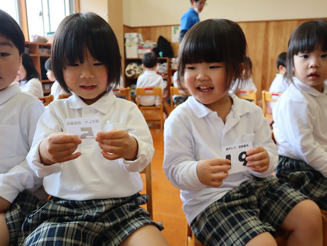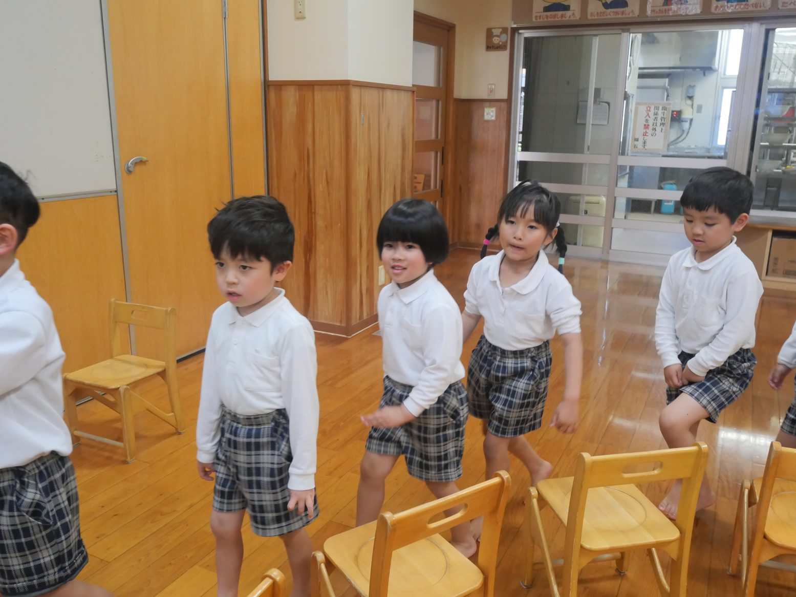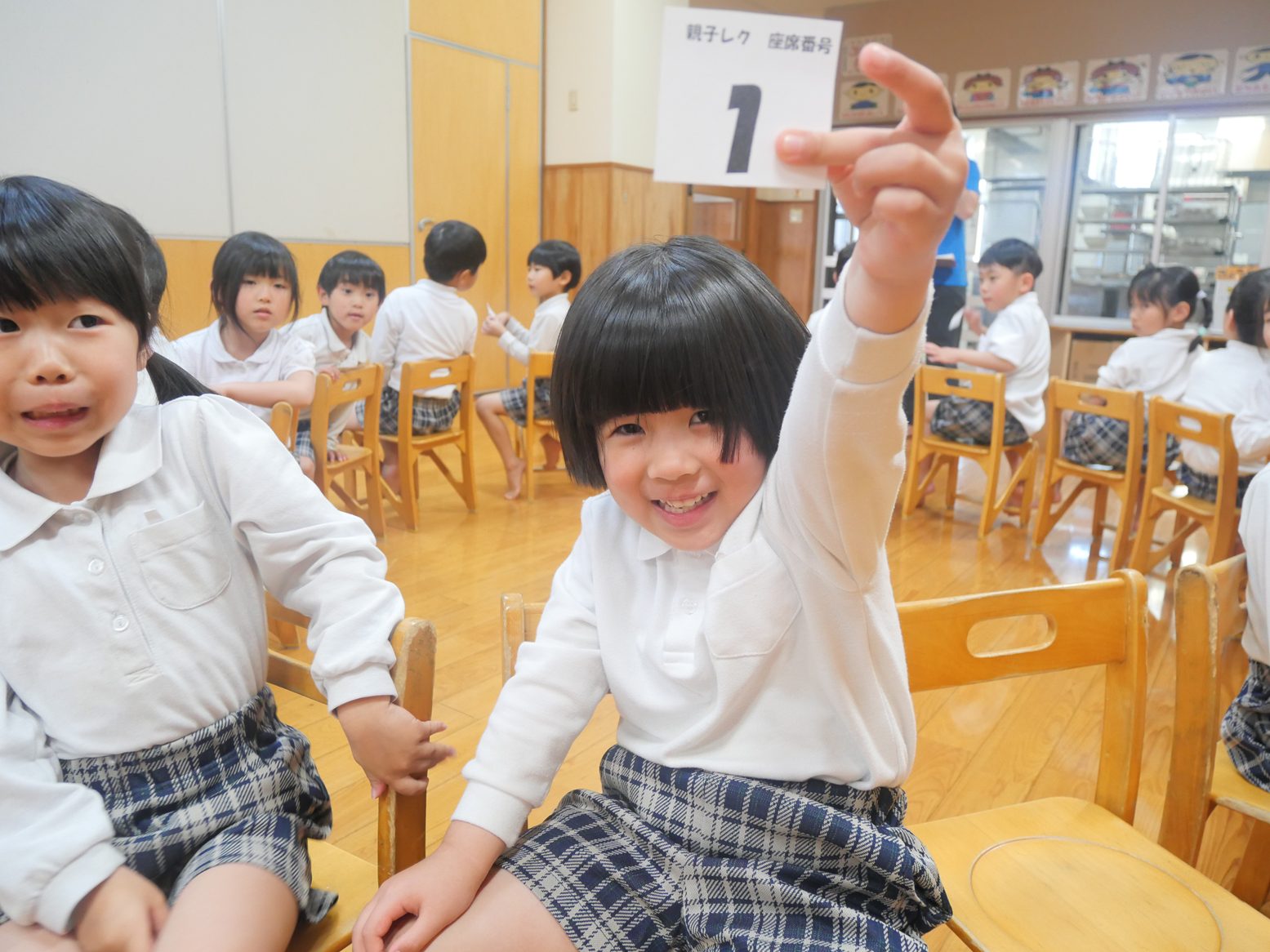 今日は親子レクリエーションの席のくじ引きを行いました。 音楽に合わせて椅子の周りをくるくる回ります。 音楽が止まると空いている椅子に座って「何番かな~!」とわくわくした表情の子どもたち。 くじを開くと「10番です!」「1番だったよ~!」と嬉しそうに話す姿が見られました。 「親子レクリエーション楽しみだね。」「ママとパパにかっこいいところ見てもらうぞ!」と更に親子レクリエーションに向けて気合が入る子どもたちでした。