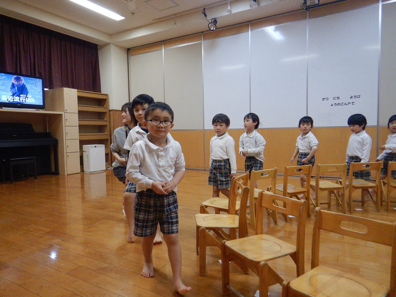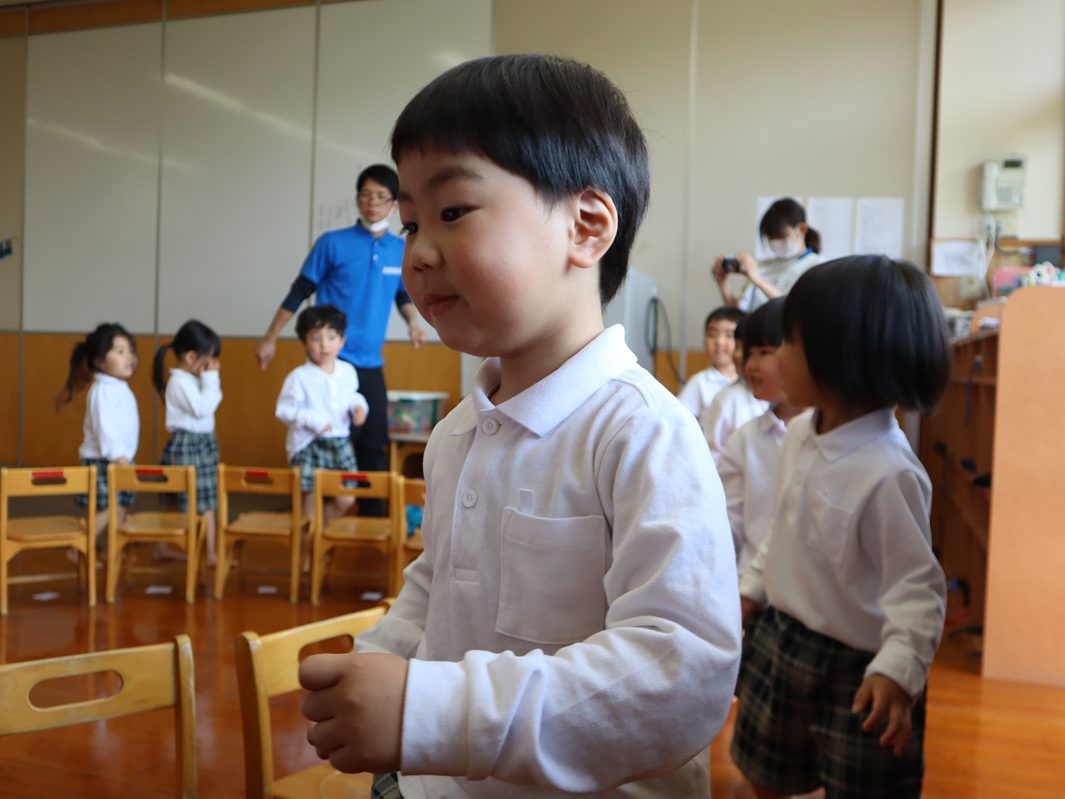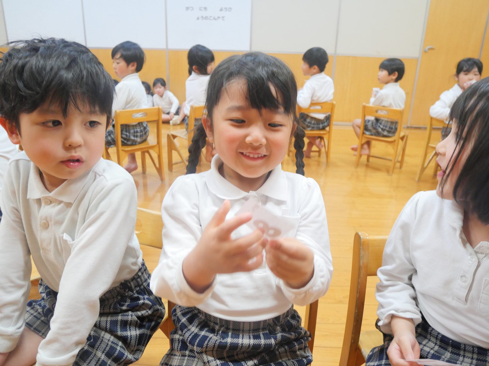 今日は親子レクリエーションの席のくじ引きを行いました。 音楽に合わせて椅子の周りをくるくる回ります。 音楽が止まると空いている椅子に座って「何番かな~!」とわくわくした表情の子どもたち。 くじを開くと「10番です!」「1番だったよ~!」と嬉しそうに話す姿が見られました。 「親子レクリエーション楽しみだね。」「ママとパパにかっこいいところ見てもらうぞ!」と更に親子レクリエーションに向けて気合が入る子どもたちでした。