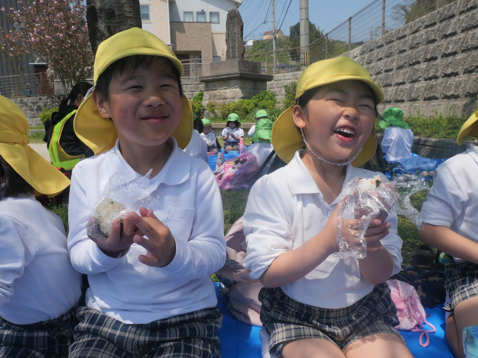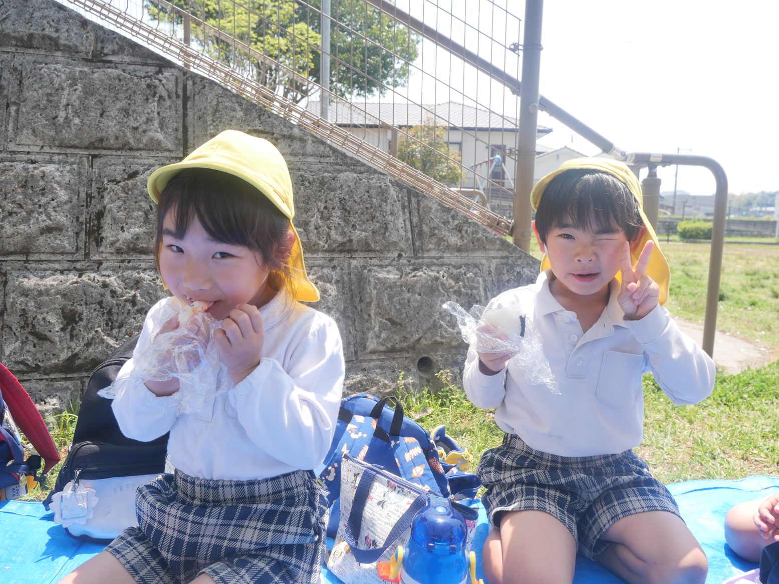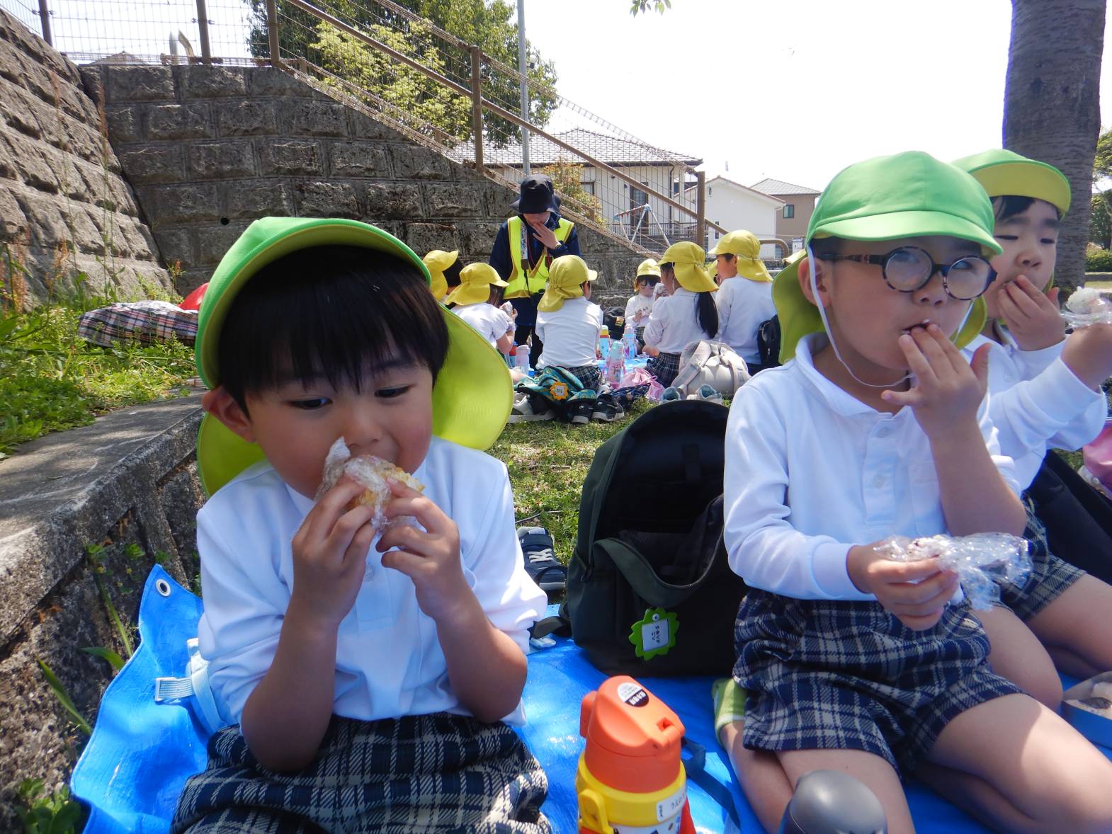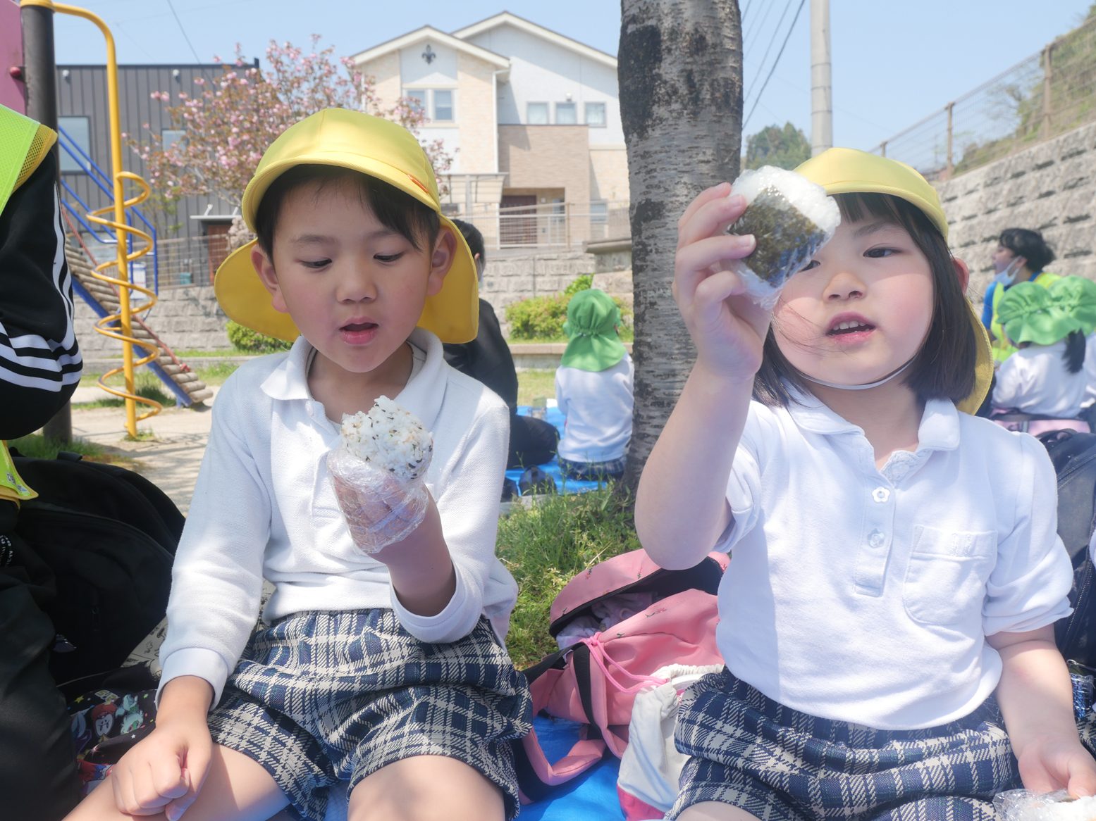 「見て可愛いでしょ!」「美味しいね!」と、口いっぱいにおむすびを頬張るうさぎ組さん、きりん組さんでした。