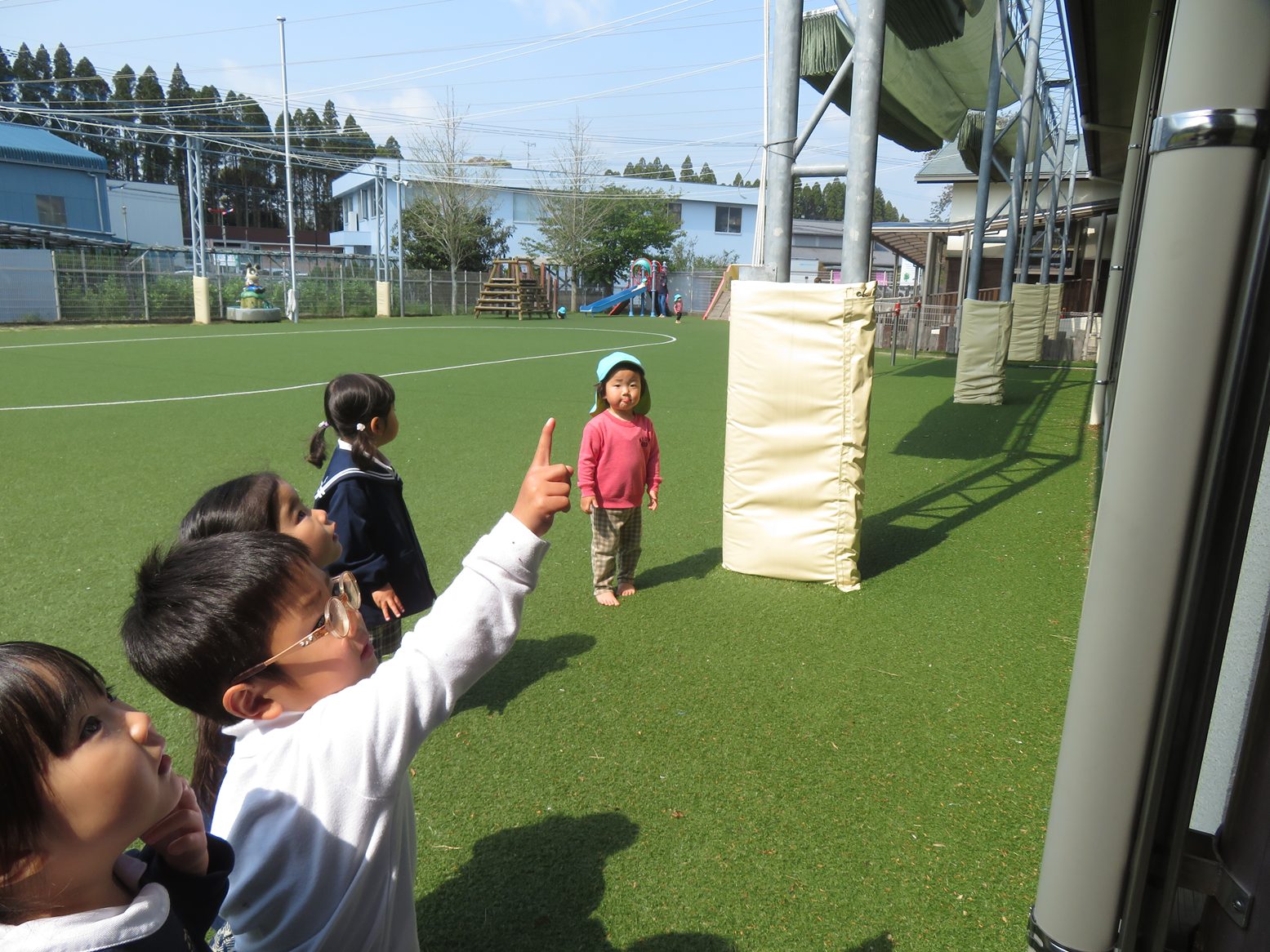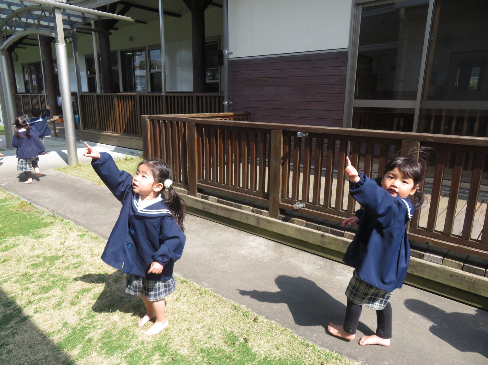 「これはどこにあると思う?」と質問すると...「お外にあるよ!」、「これはきりん組さんかな?」と子どもたちから様々な声が聞かれ、まずは園庭から捜索開始!
