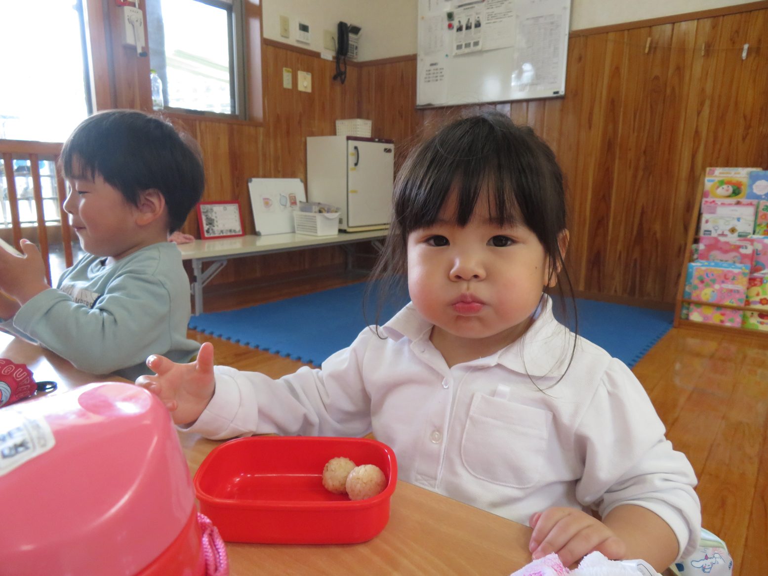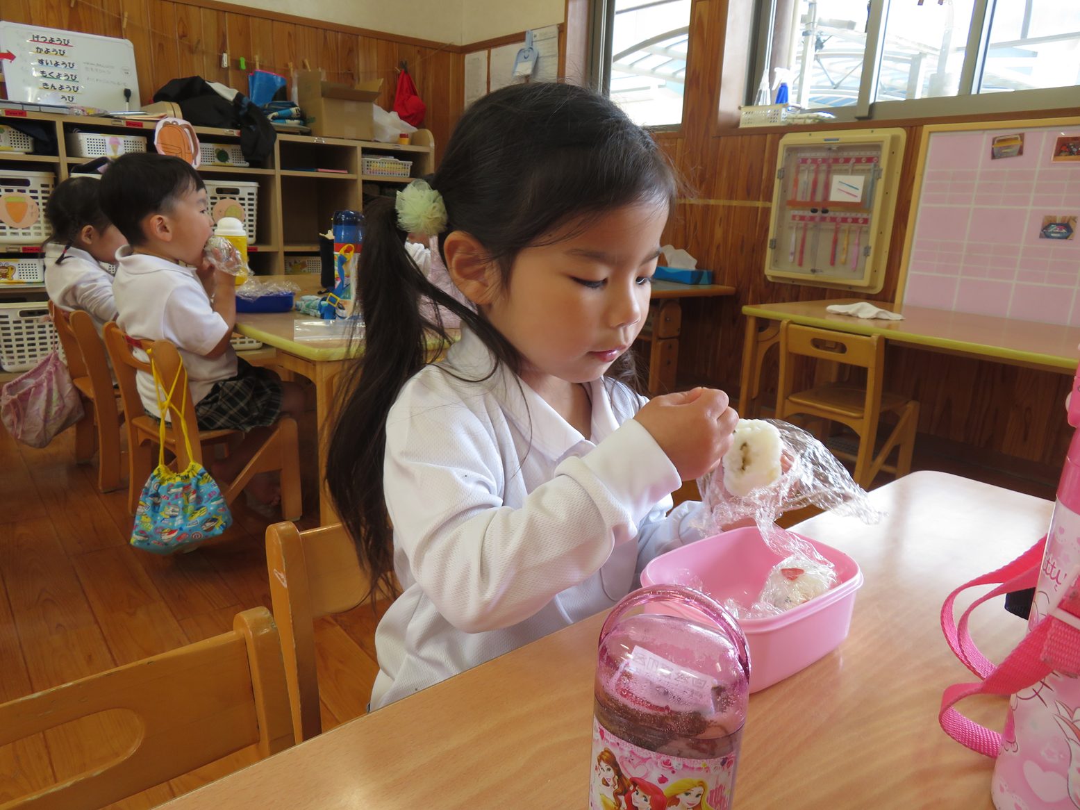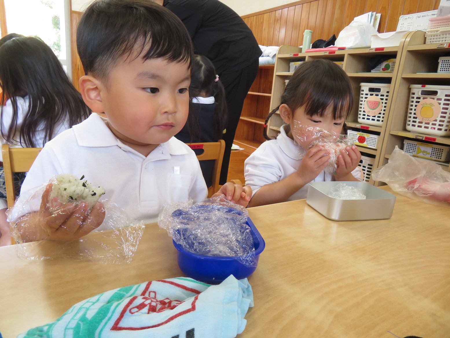また、シールラリーや外遊び後は「お腹ペコペコ。」と嬉しそうにおむすびを食べる子どもたちでした。