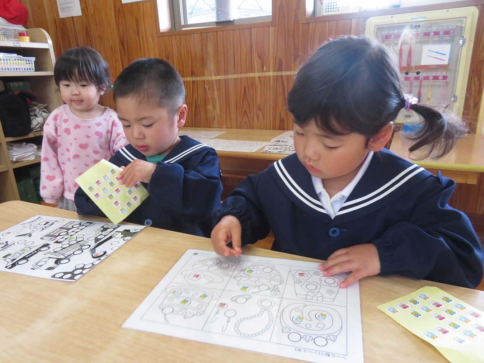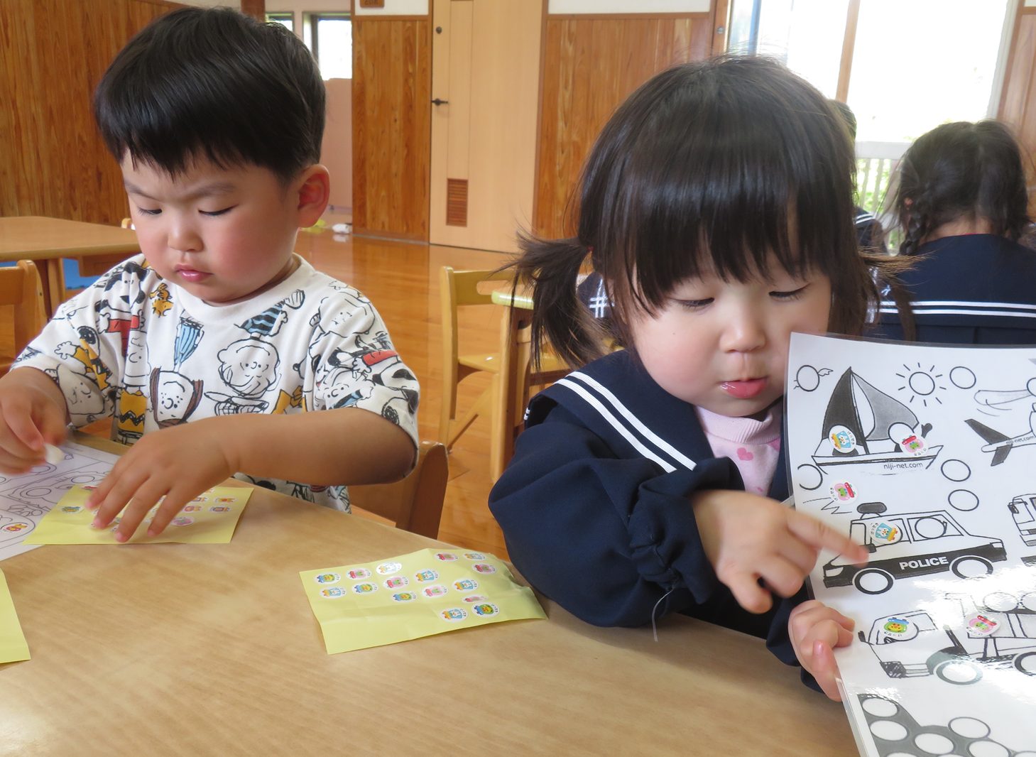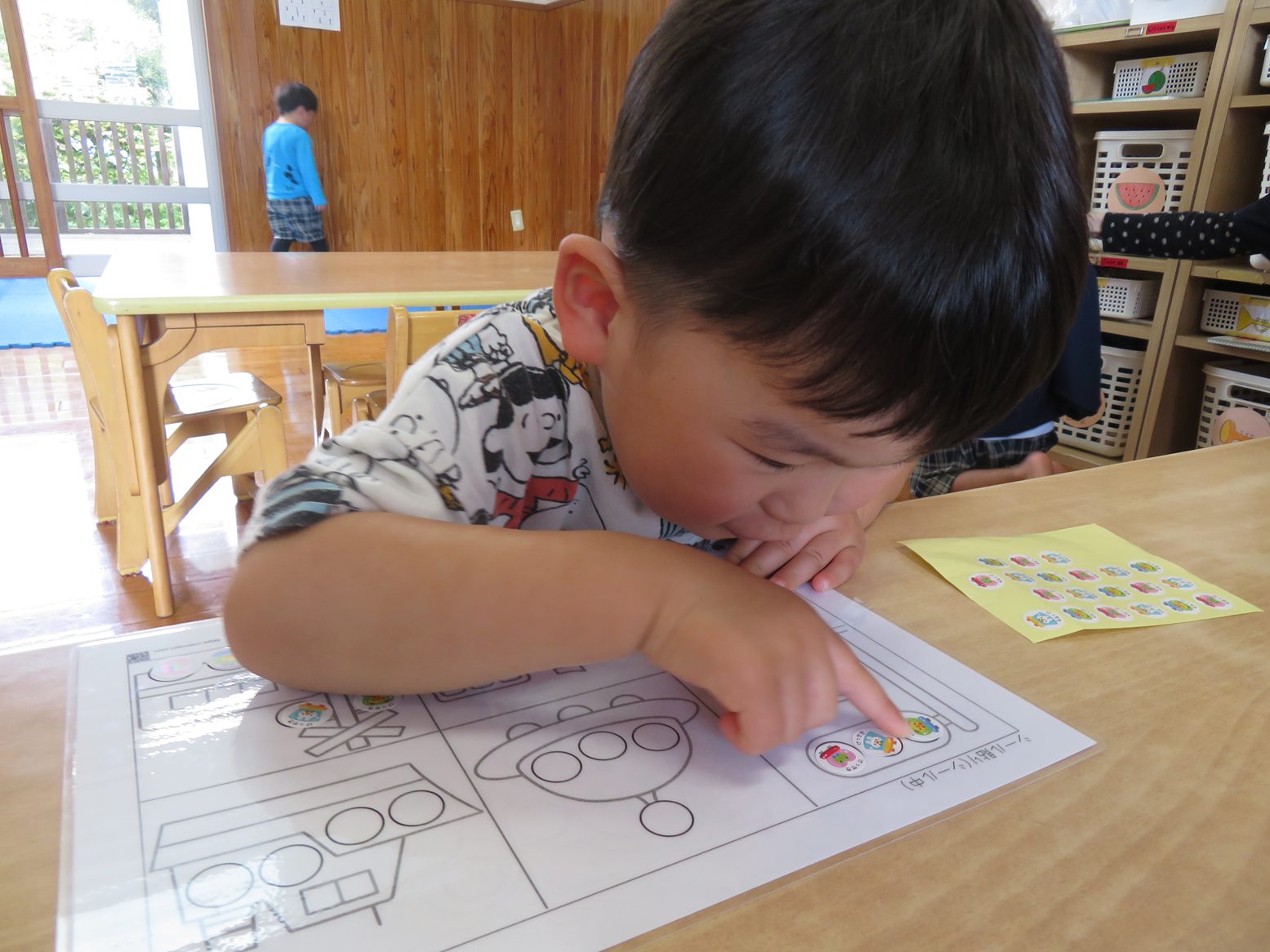 今日は、おやつを食べ終わった後にシール貼り遊びをしました。 様々なシール貼りのイラストを前に「どれにしようかな?」と興味津々! シールを貼り進める中では、上手に丸い枠の中に貼っていきます。 シールを貼り終わったら、次は剥がすのにも挑戦です! 貼るのは上手だった子どもたちも、剥がすのには「難しい!」と苦戦しながらも、剥がし切ると「できた!」と誇らしげな笑顔で教えてくれるりす組さんでした。 これからもシール貼り遊びをはじめ、指先を使った遊びをたくさん取り入れていきたいと思います。