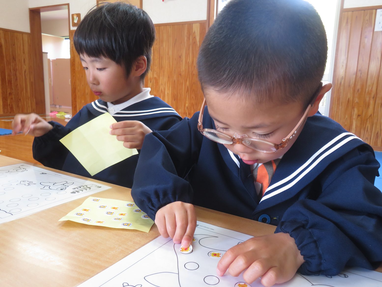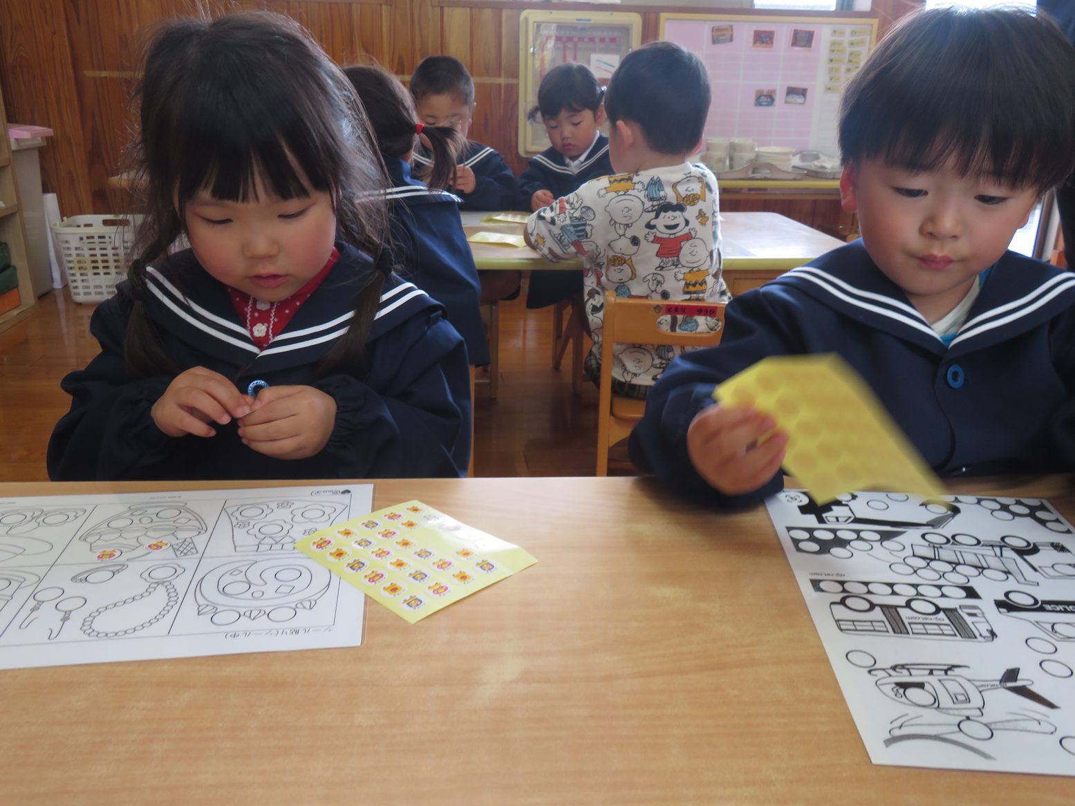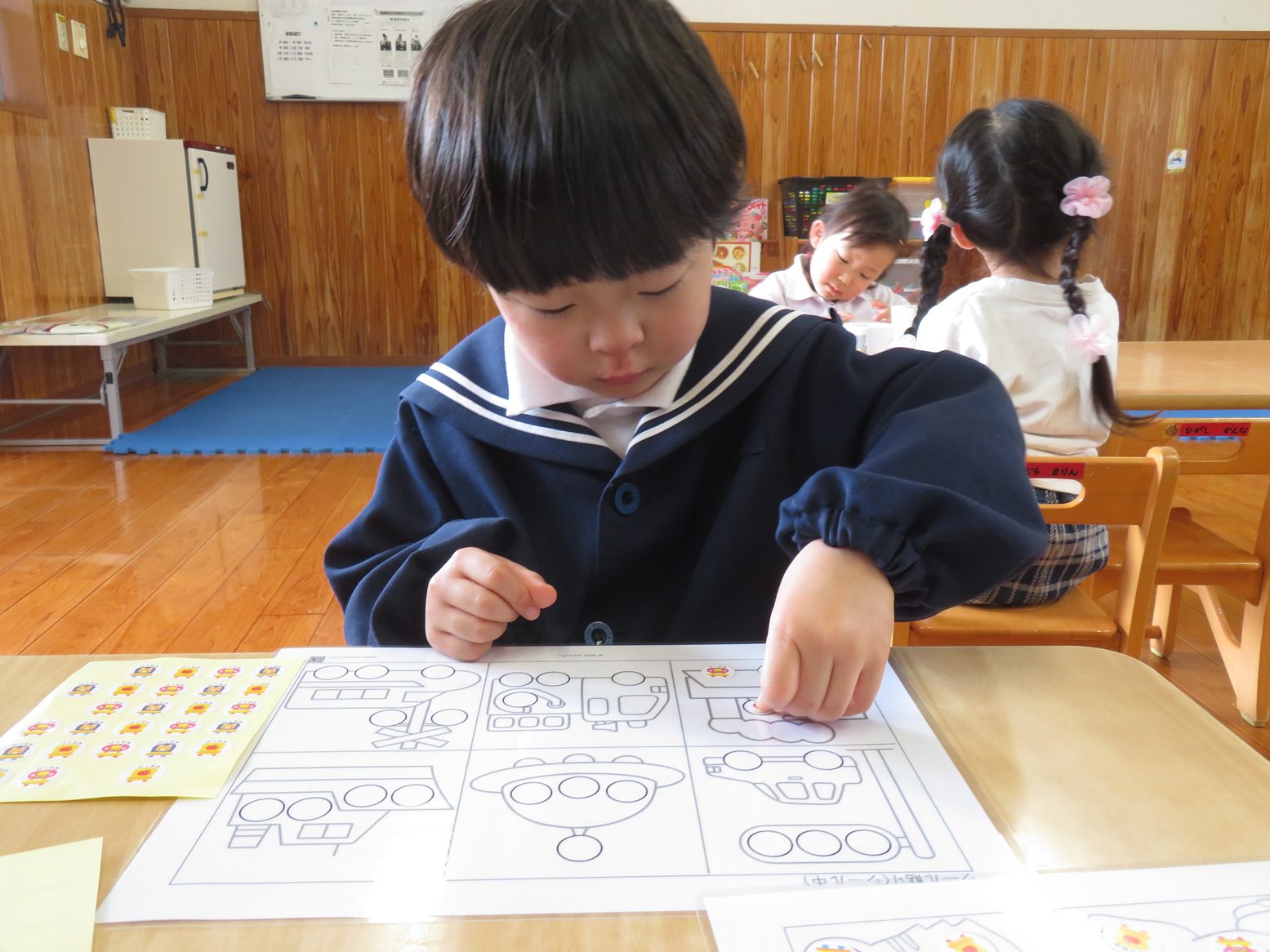 今日は、おやつを食べ終わった後にシール貼り遊びをしました。 様々なシール貼りのイラストを前に「どれにしようかな?」と興味津々! シールを貼り進める中では、上手に丸い枠の中に貼っていきます。 シールを貼り終わったら、次は剥がすのにも挑戦です! 貼るのは上手だった子どもたちも、剥がすのには「難しい!」と苦戦しながらも、剥がし切ると「できた!」と誇らしげな笑顔で教えてくれるりす組さんでした。 これからもシール貼り遊びをはじめ、指先を使った遊びをたくさん取り入れていきたいと思います。