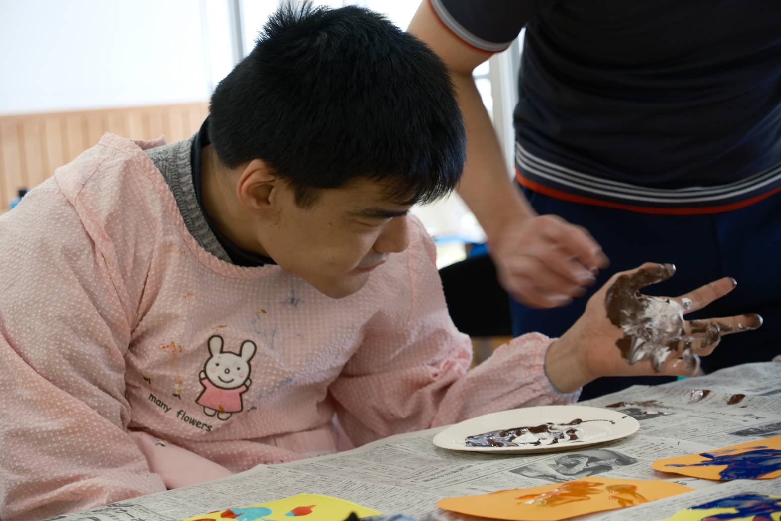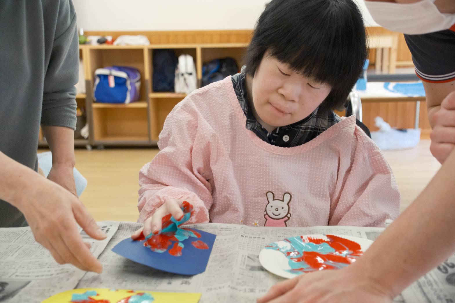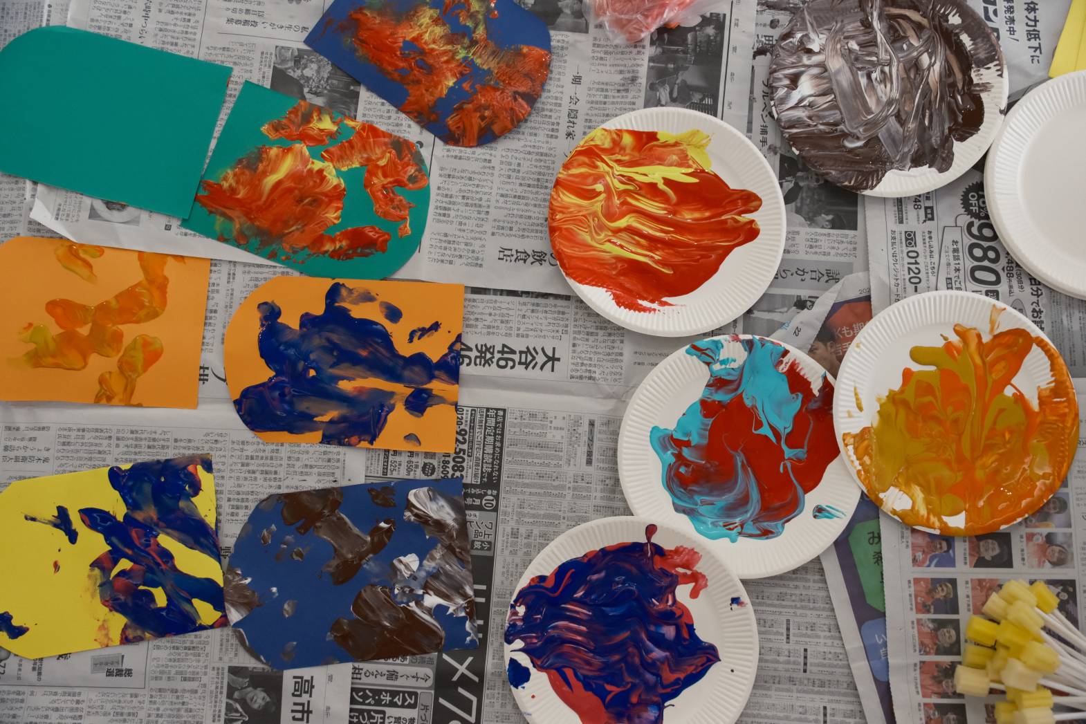 今日は「こどもの日」に向けてこいのぼりづくりを行いました! 色紙に好きな絵の具を選んで、手でペタリ! とっても綺麗なマーブル模様に仕上がりました! 手のひらに絵の具が付いている感触を楽しまれる方、触ったところに色が付がつくのを楽しまれる方など、それぞれ活動を楽しまれている様子でした! 皆さんは、今回の活動でこいのぼりのどこを作っているのか分ったでしょうか? 次回の活動も楽しみにしておいてください!