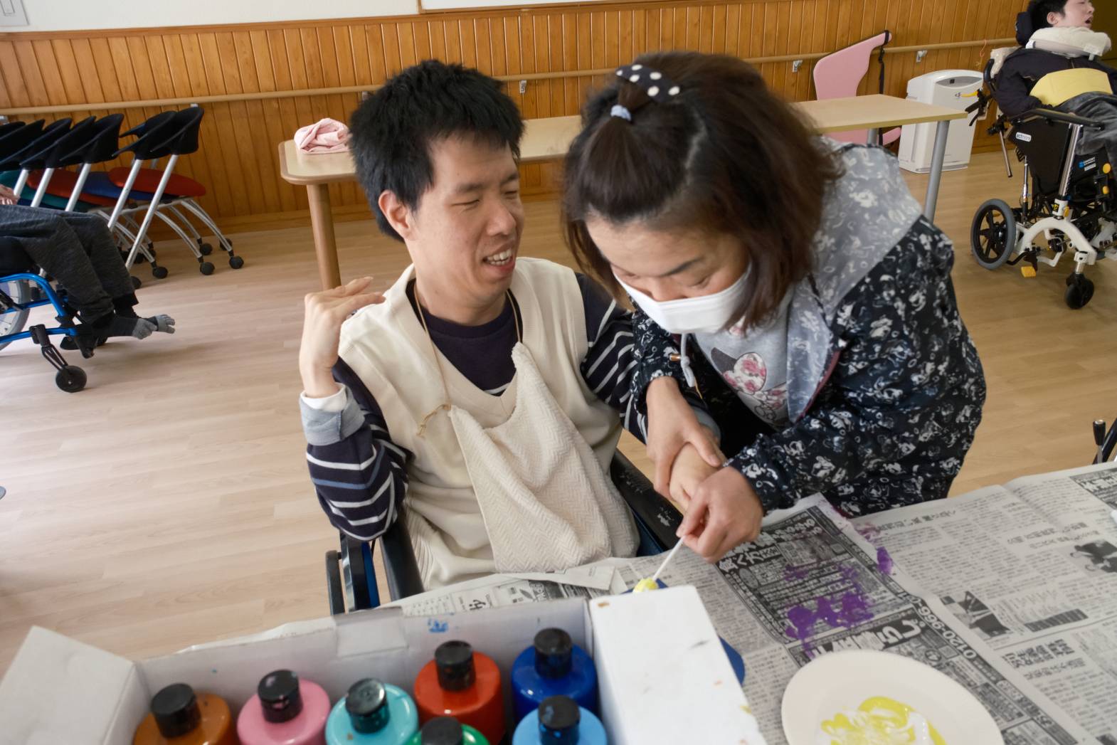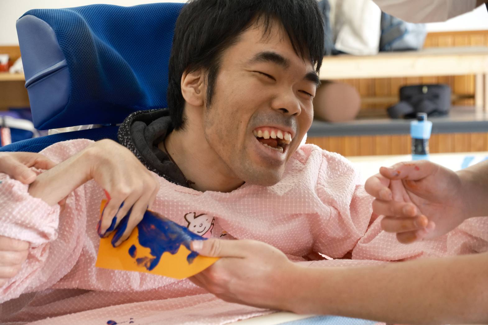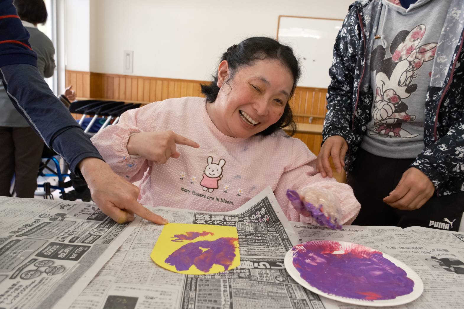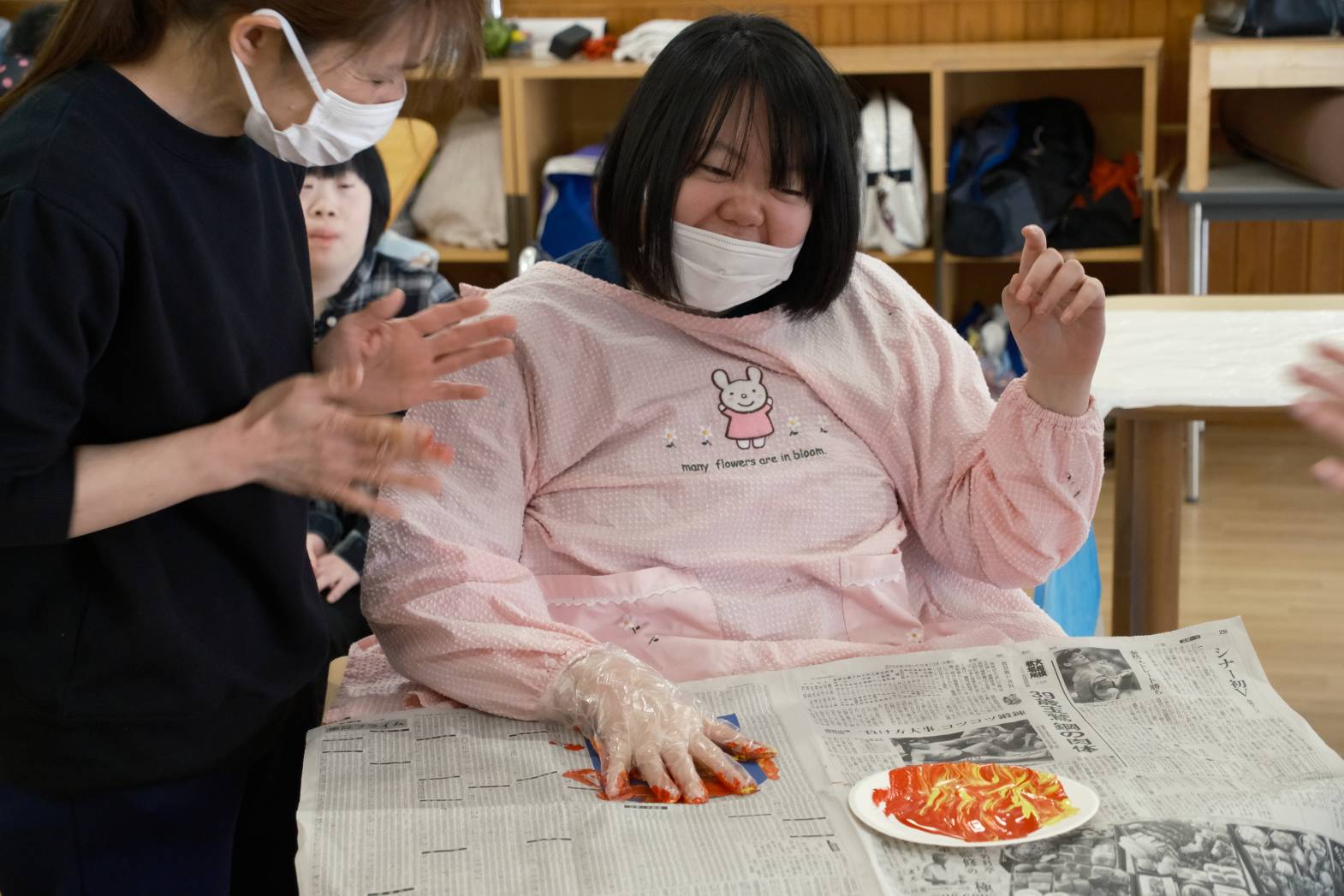 今日は「こどもの日」に向けてこいのぼりづくりを行いました! 色紙に好きな絵の具を選んで、手でペタリ! とっても綺麗なマーブル模様に仕上がりました! 手のひらに絵の具が付いている感触を楽しまれる方、触ったところに色が付がつくのを楽しまれる方など、それぞれ活動を楽しまれている様子でした! 皆さんは、今回の活動でこいのぼりのどこを作っているのか分ったでしょうか? 次回の活動も楽しみにしておいてください!