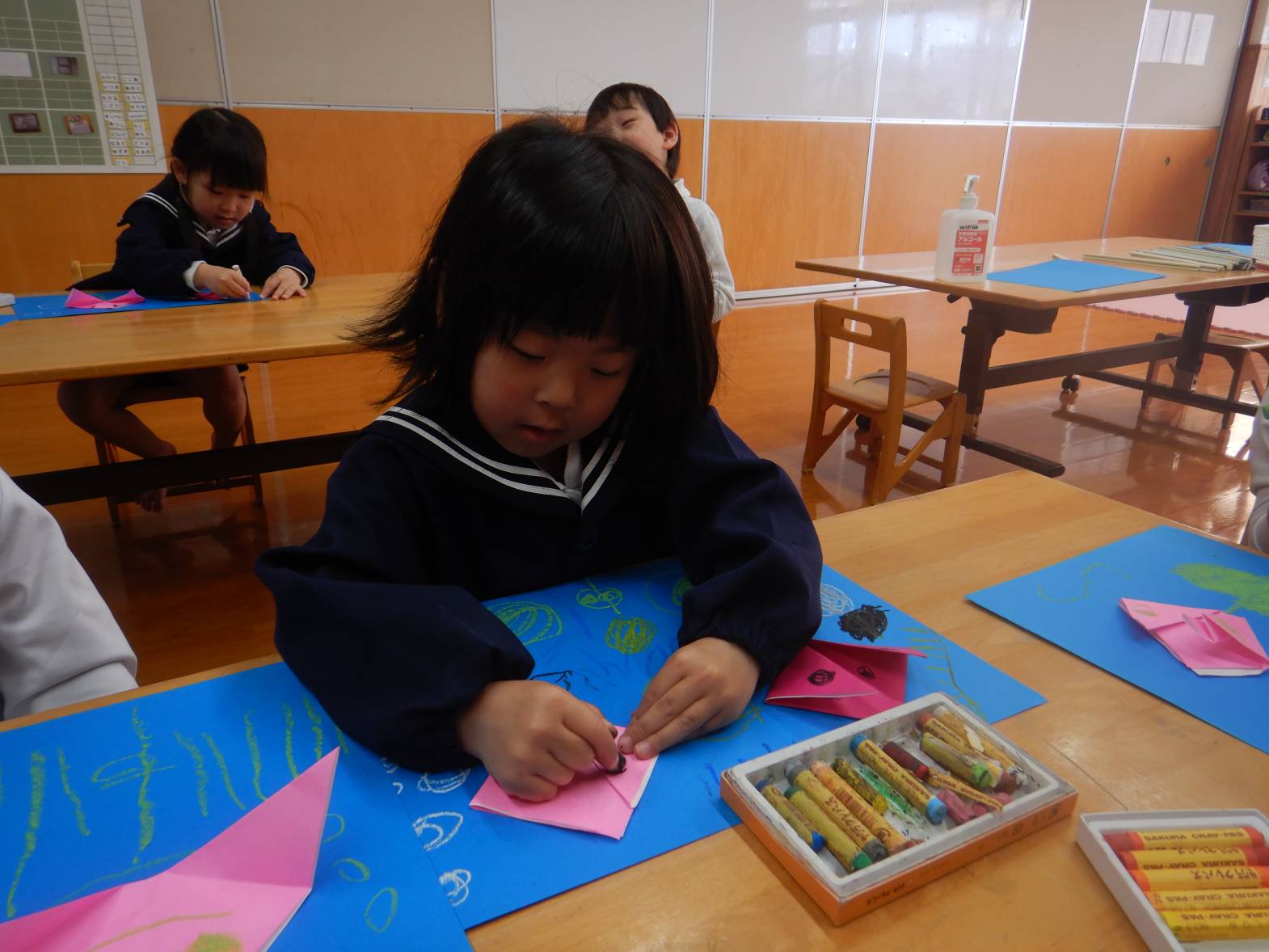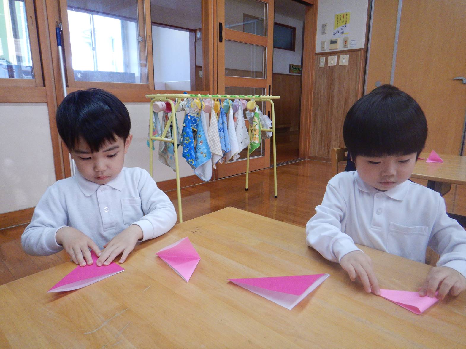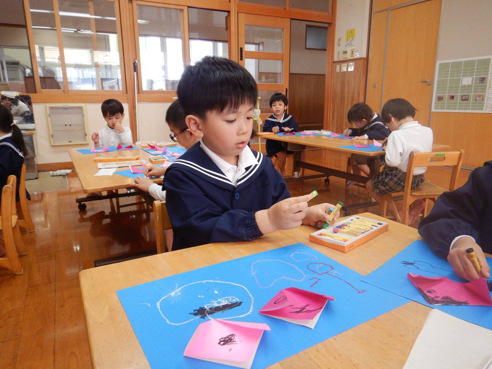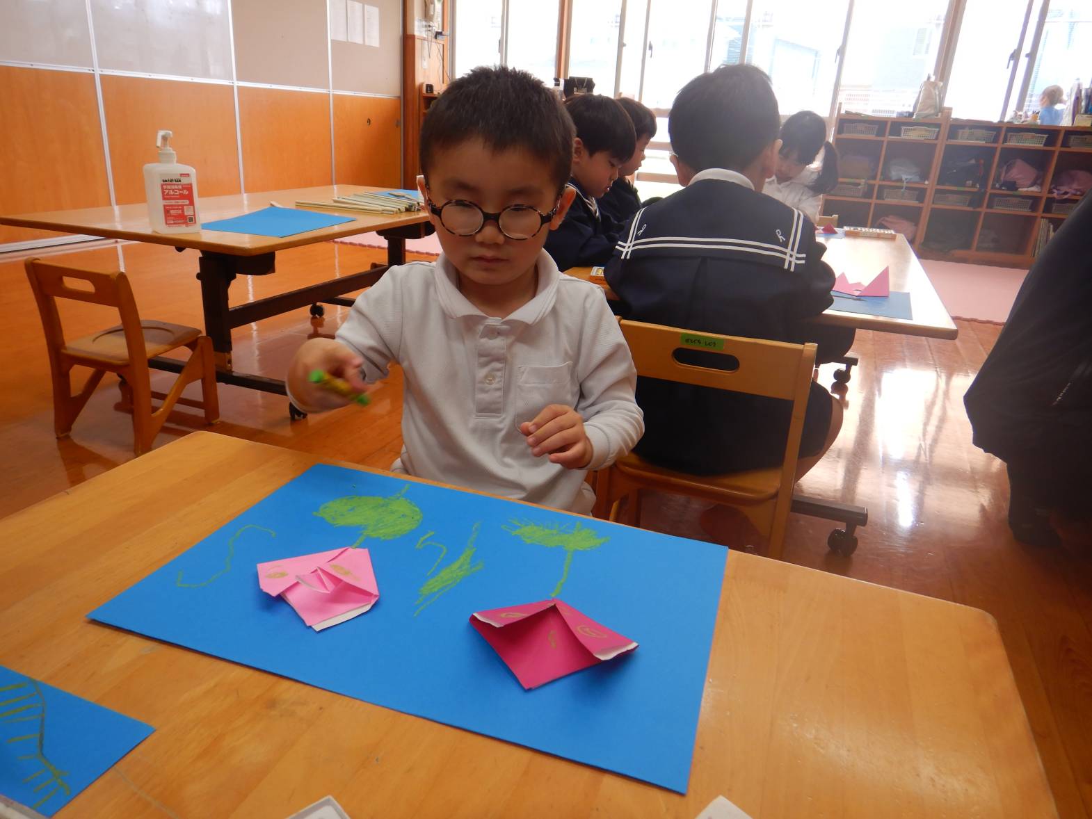 今週はチューリップの製作をしました。 まずは折り紙でチューリップの花を折っていきます。 「しっかり合わせて折れたよ!」「ちょっと難しかった。」とお手本を見ながら折っていく子どもたち。 次は画用紙にお花を貼って絵を描いていきます。 「ちょうちょ書こうかな?」「お友だち書いちゃおう!」と思い思いのチューリップを作ったうさぎ組さんでした。