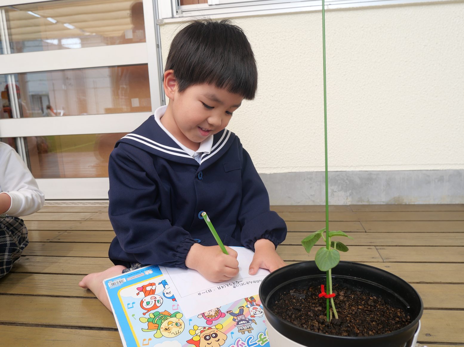 「葉っぱは、何枚あるかな?」「ここは、緑色だね!」と、真剣な表情でオクラを見つめる姿が見られます。
