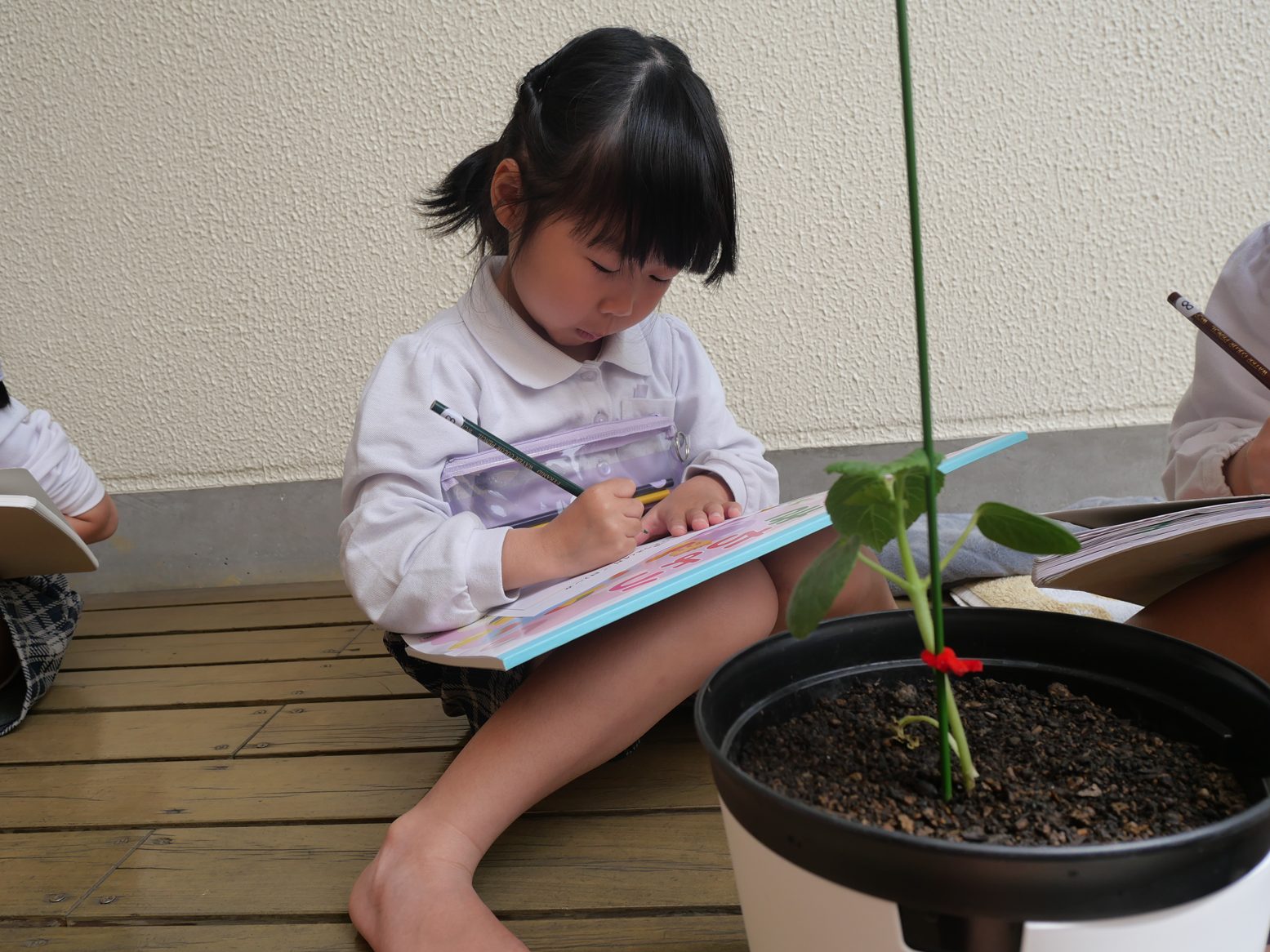 「見て、オクラ上手に描けたよ。」「葉っぱ、3枚もあったんだね!」など、観察していく中で新たな気付きや発見をする姿も見られました。