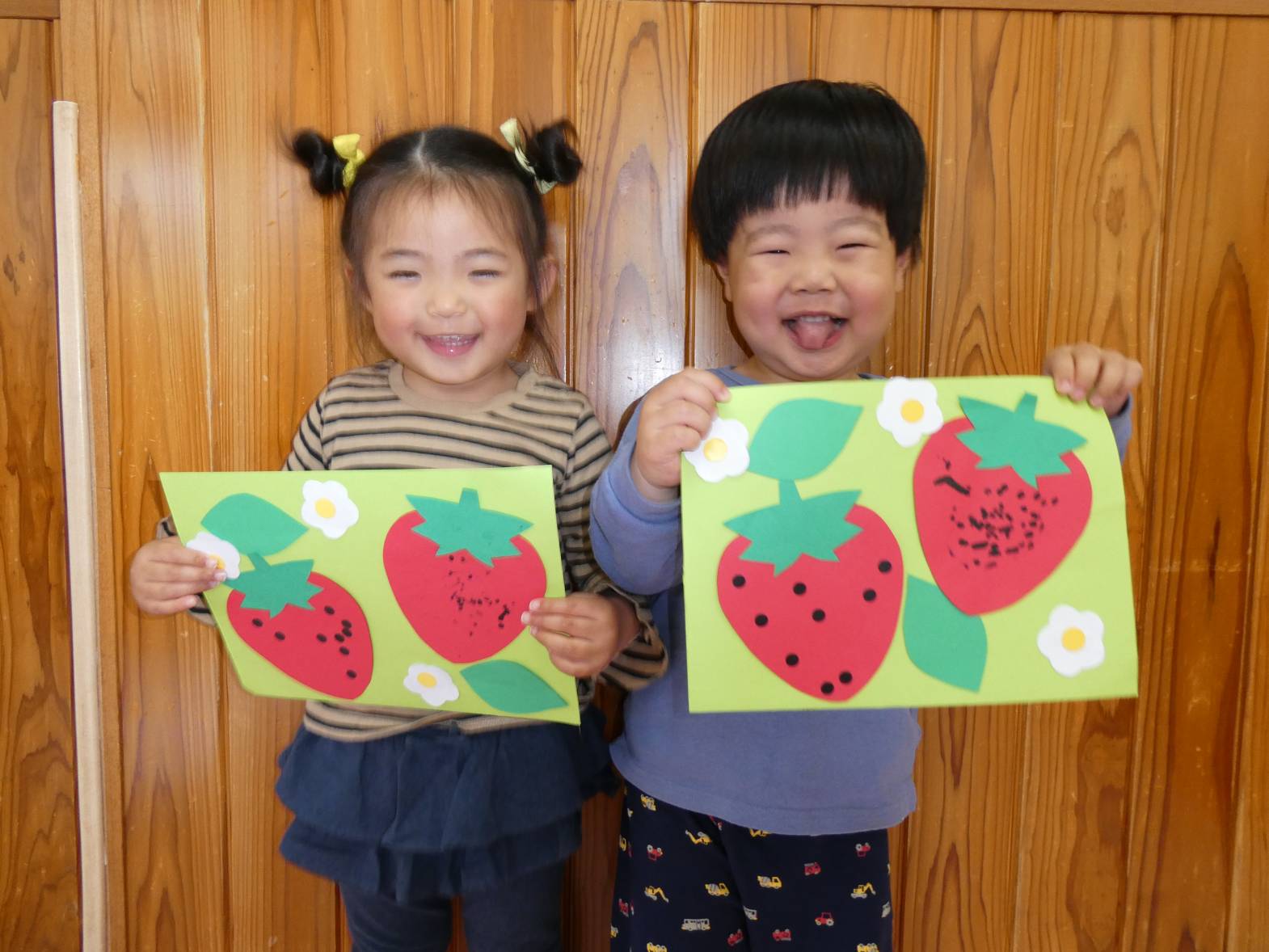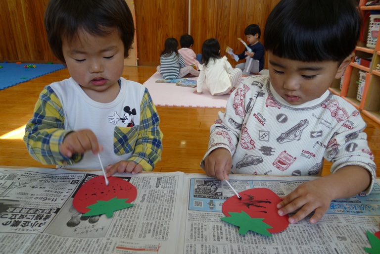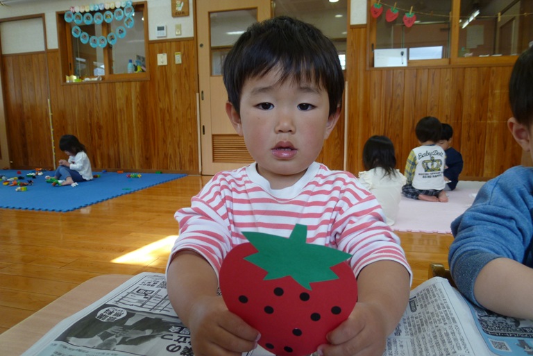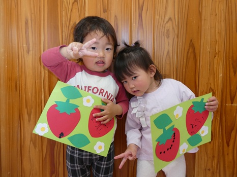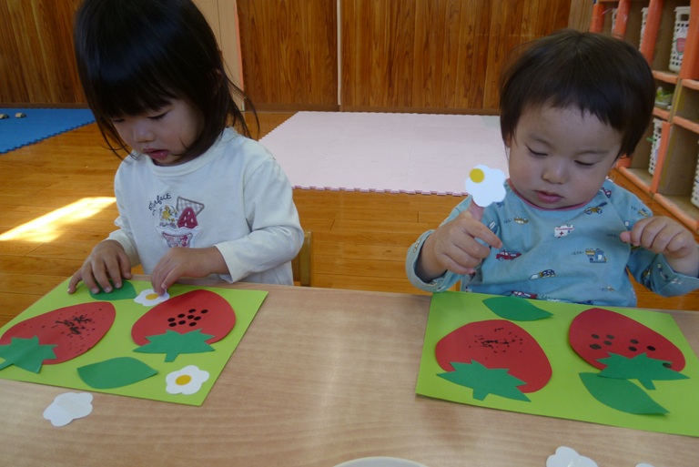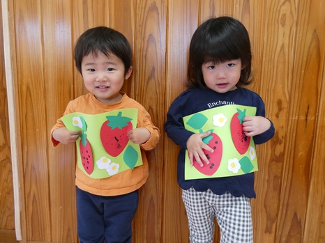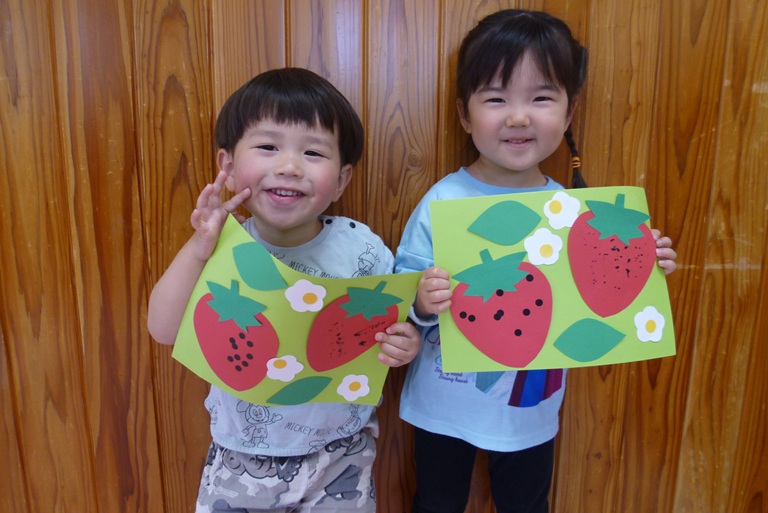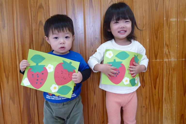 4月はいちごの製作をしました! 絵の具やシールを使っていちごに種をつけました。 「いちご~♡」や「とんとんとん」等、たくさんお話をしながら楽しそうに取り組む子どもたち♫ お花と葉っぱを好きな場所に貼って、 とってもかわいいいちごができあがりました☆ これからも色々な製作を楽しんでいきたいと思います!!