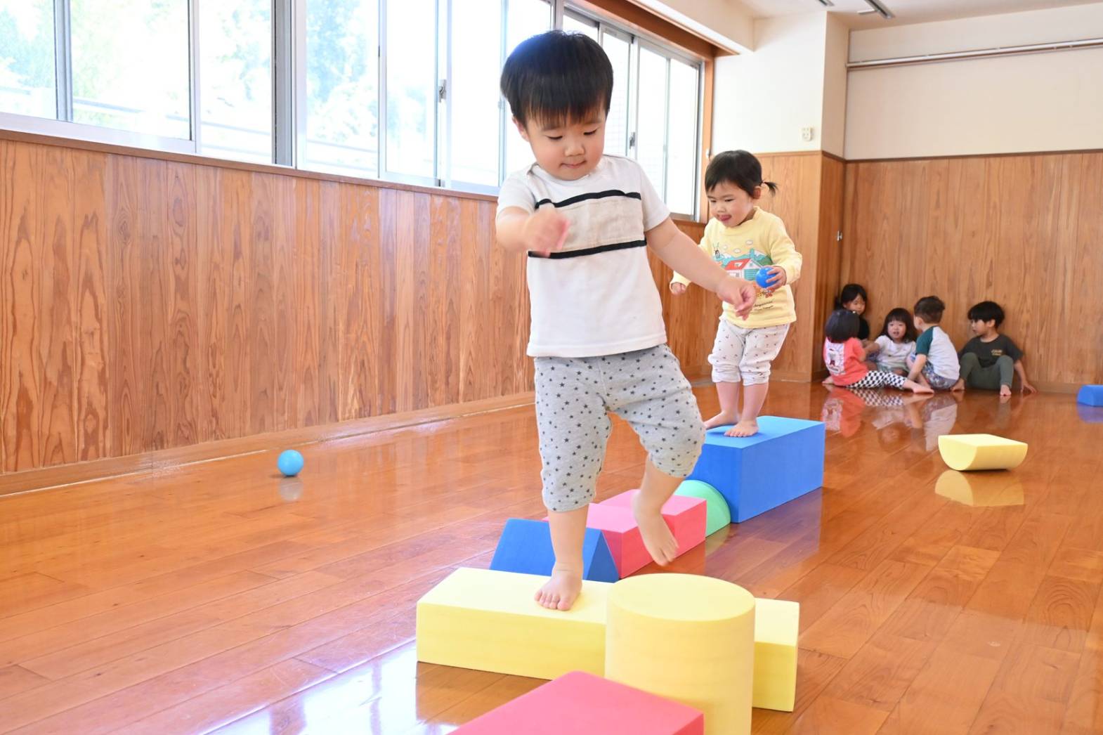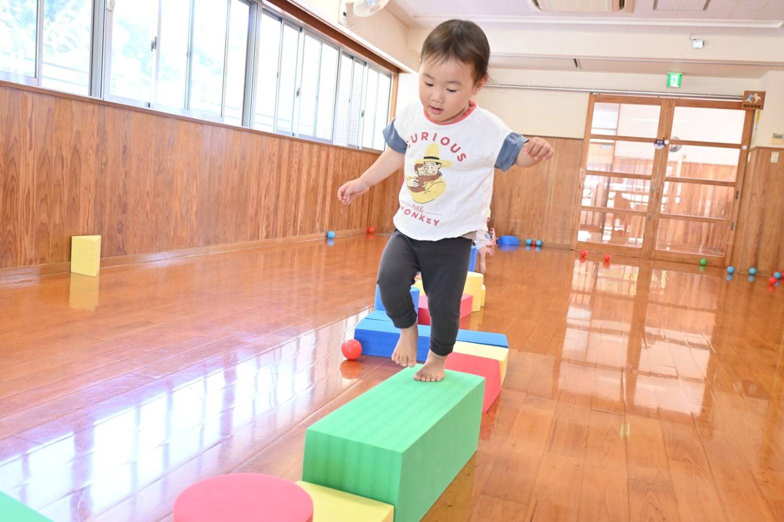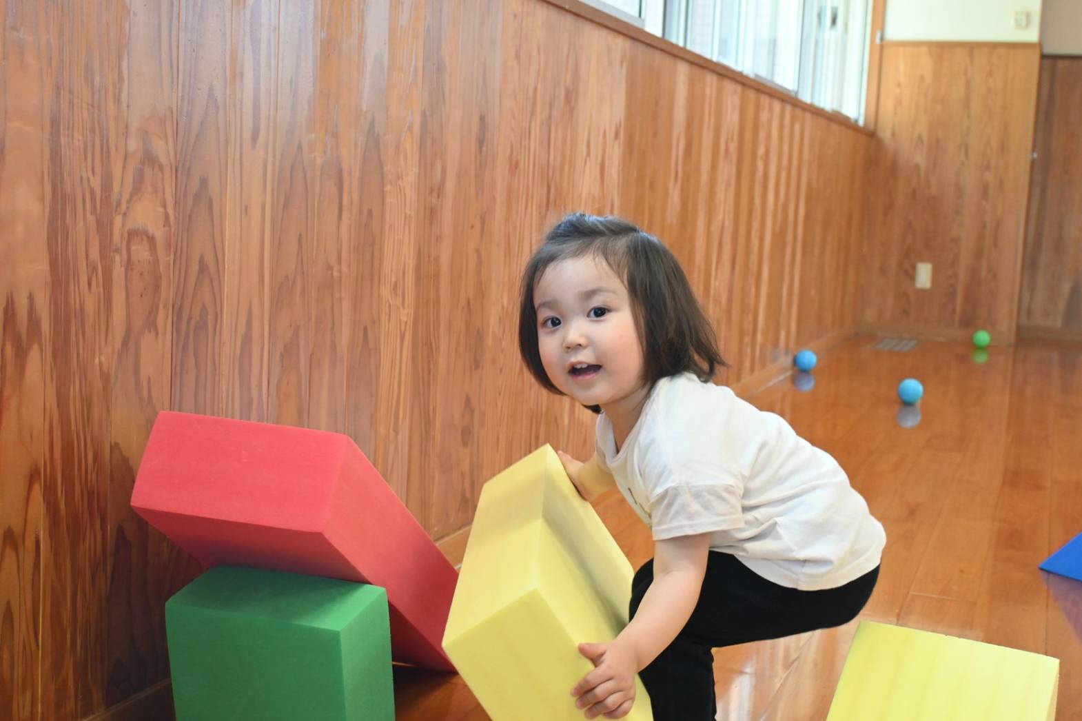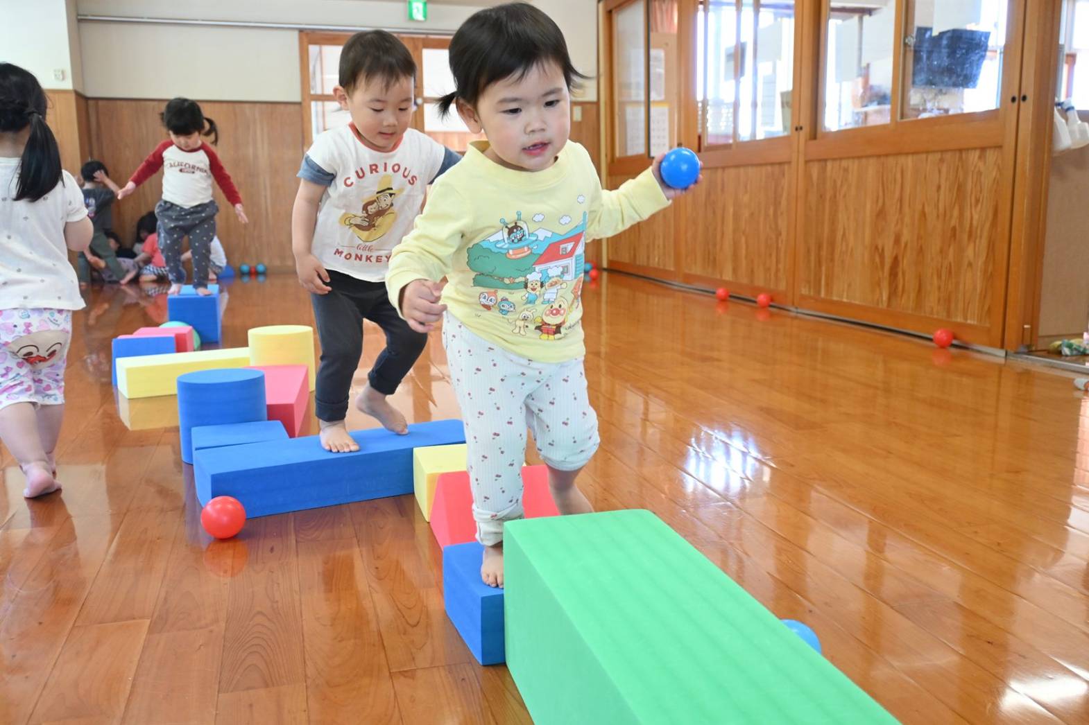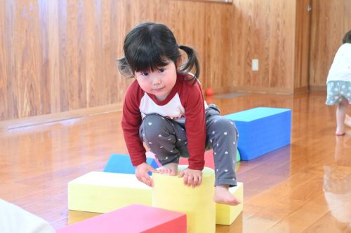 ソフトブロック遊びでは、高く積み上げたり並べたりと思い思いに遊ぶぱんだ組さん。 「おうちできたね!」、「みて、たかい!」と子どもたち同士で話をしながら楽しむ姿が見られます。 ブロックを並べて橋を作ると、落ちないように慎重に渡る子どもたち。 「おっとっと。」、「ゆっくりゆっくり。」と何度も挑戦をしていました。 体を動かすことが大好きなぱんだ組さん。 様々な玩具を通して遊びの幅を広げていきたいと思います。
