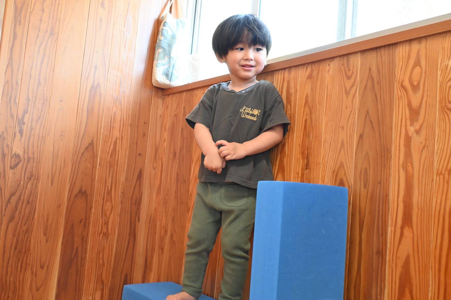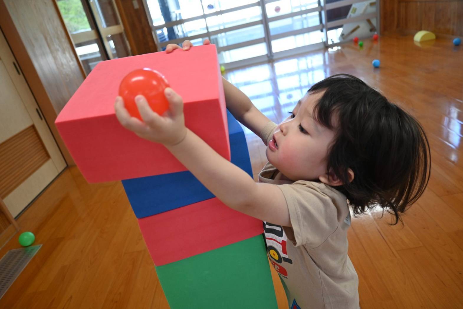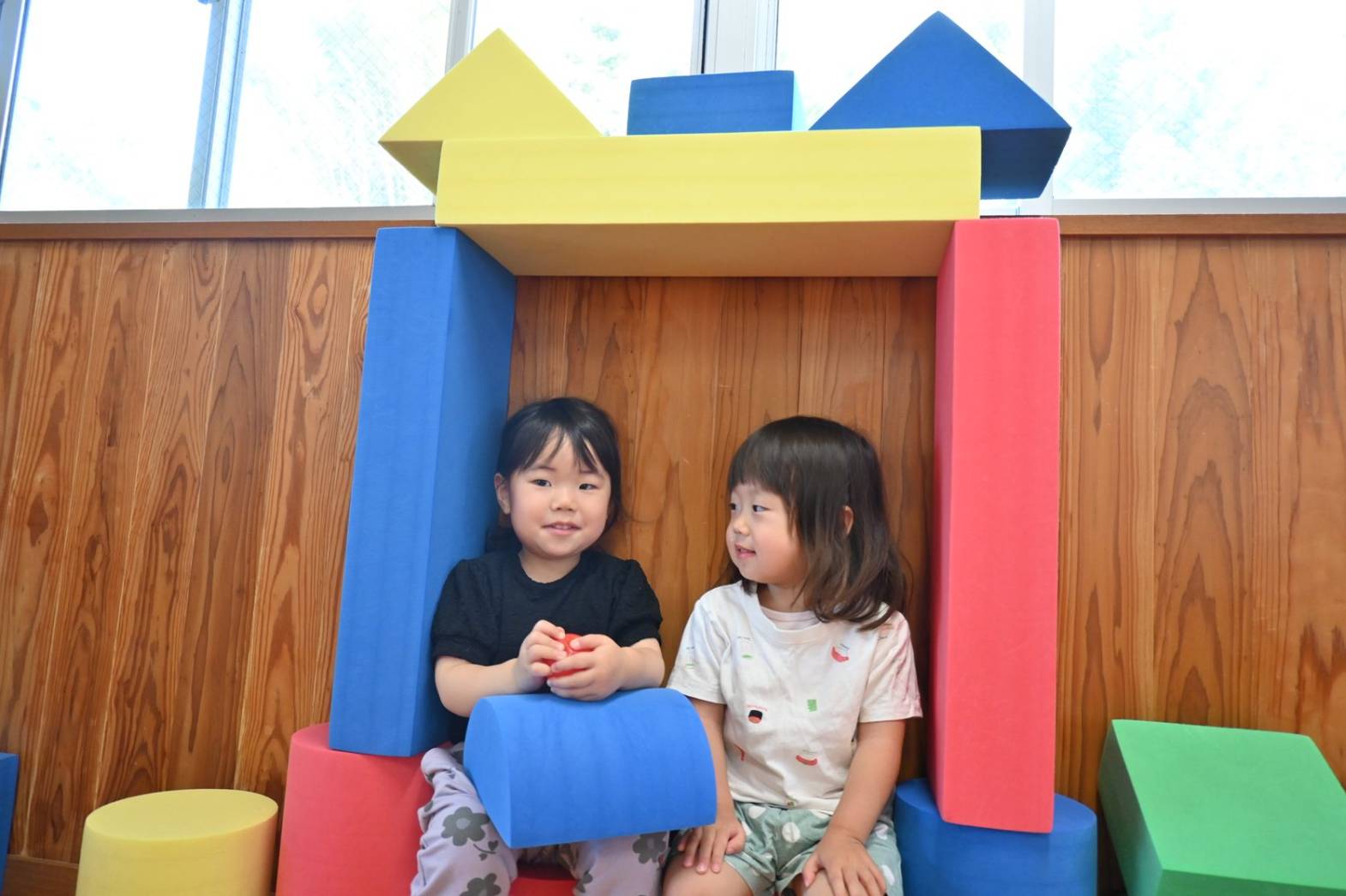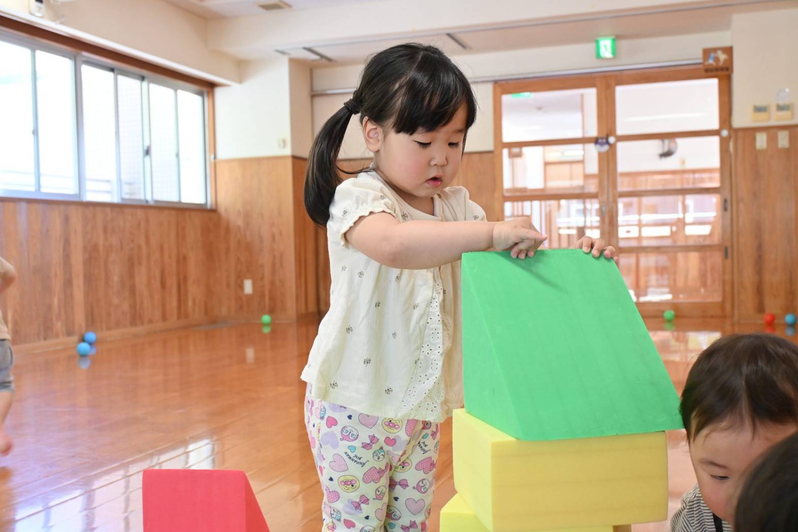 ソフトブロック遊びでは、高く積み上げたり並べたりと思い思いに遊ぶぱんだ組さん。 「おうちできたね!」、「みて、たかい!」と子どもたち同士で話をしながら楽しむ姿が見られます。 ブロックを並べて橋を作ると、落ちないように慎重に渡る子どもたち。 「おっとっと。」、「ゆっくりゆっくり。」と何度も挑戦をしていました。 体を動かすことが大好きなぱんだ組さん。 様々な玩具を通して遊びの幅を広げていきたいと思います。