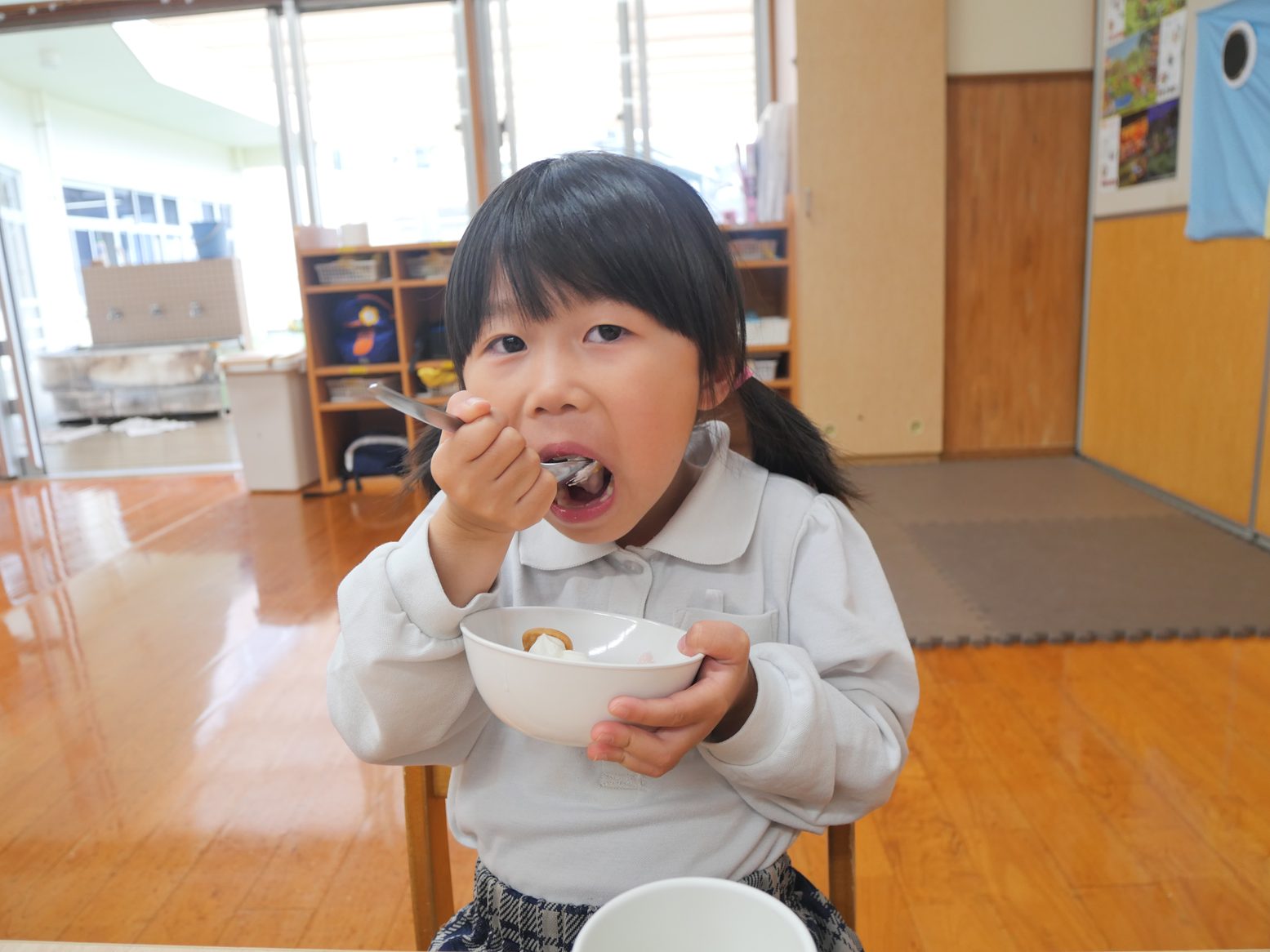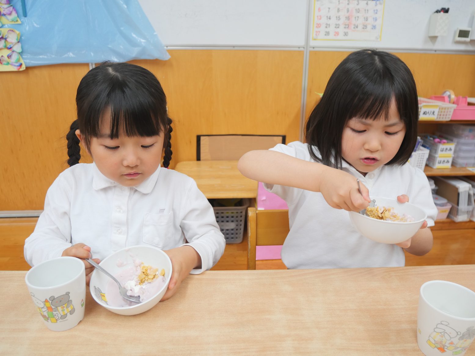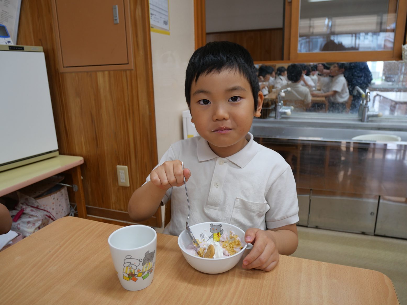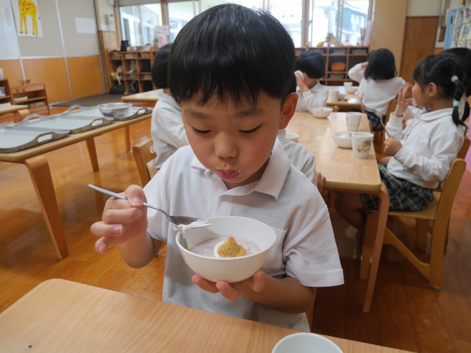 昨日は、わくわくメニューの日でした。 おやつのメニューは、カルピスとパフェです! 「美味しそうだね!」「これは何かな?」と、興味津々におやつを眺める姿が見られます。 食べ始めると「美味しいよ。」「これはクッキーだね!」と、友だちとの会話を弾ませながら食べ進めていました。 また「おかわりしたい!」「もっと食べたい。」とおかわりをする子も多く、あっという間に食べ終わっていた子どもたち。 「たくさん食べたね。」「お腹いっぱい!」と、満足気な表情でした。