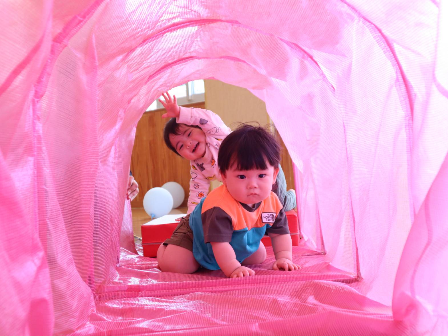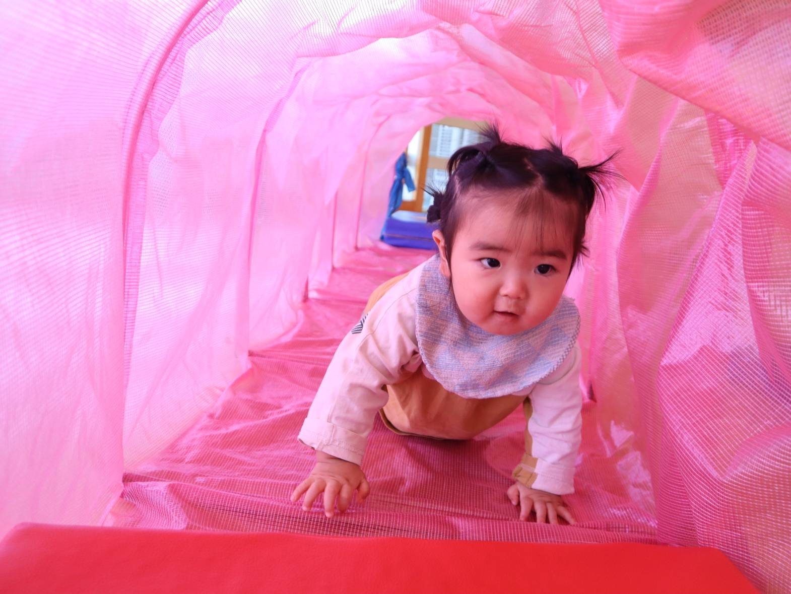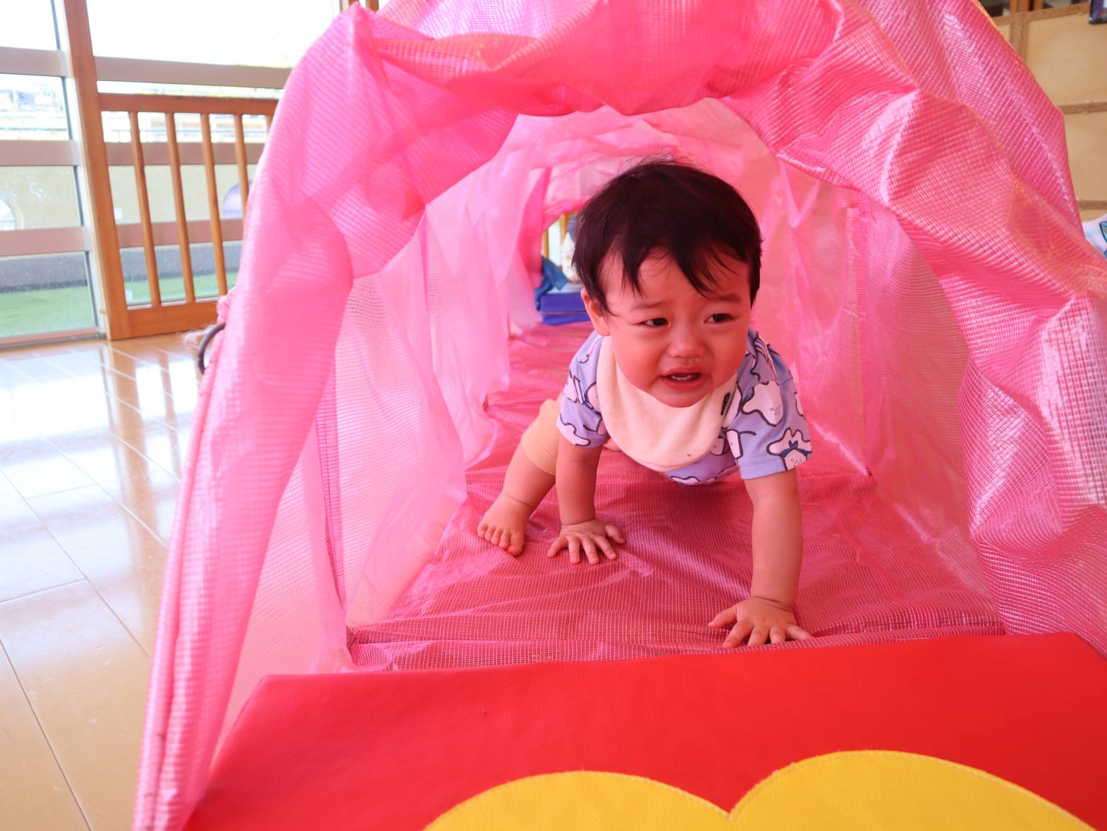 保育園生活にすっかり慣れてきた子どもたち。 活動範囲や遊ぶ玩具の種類も少しずつ増えてきました。 トンネルを出すと、興味津々で覗いて「あ!」、「ばあ!」と声を出しながらハイハイで進んでいく姿が見られました。 反対側にいる友だちや保育者と顔を見合わせて、手を振ったり笑顔になったりするひよこ組さんです。