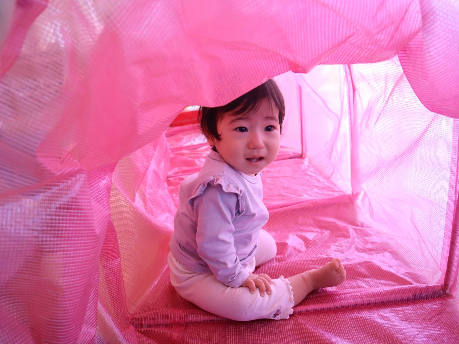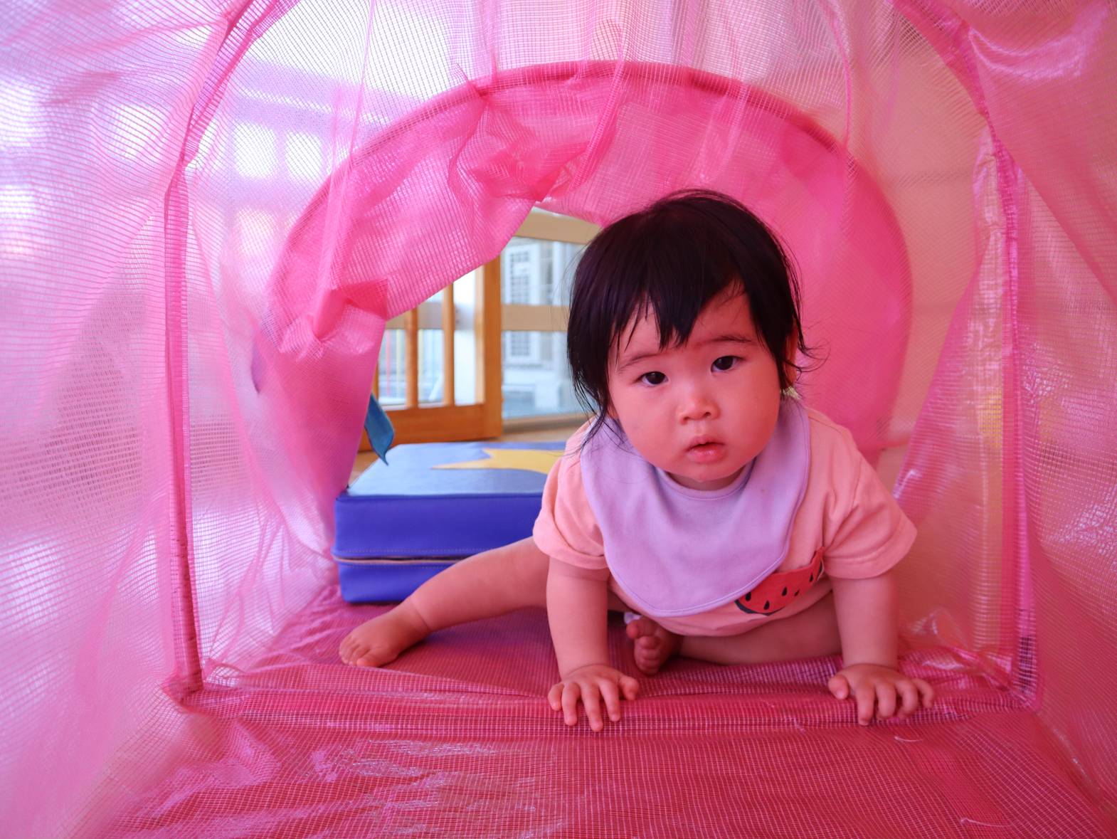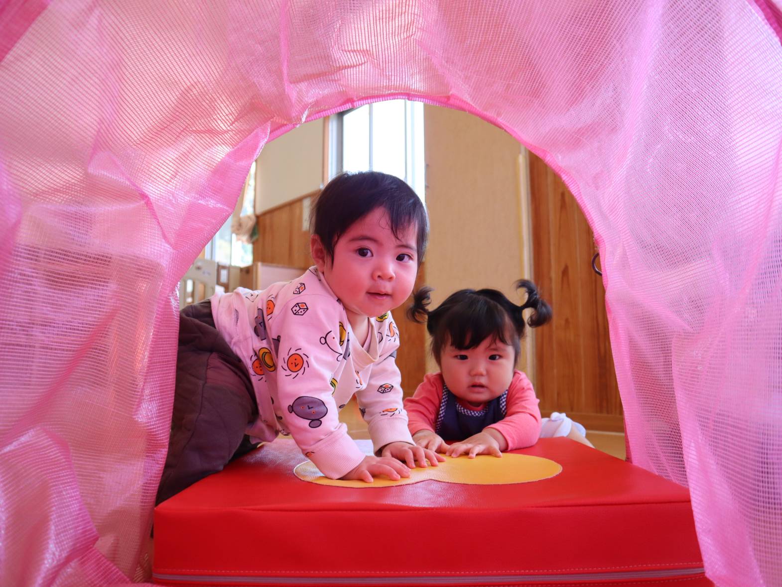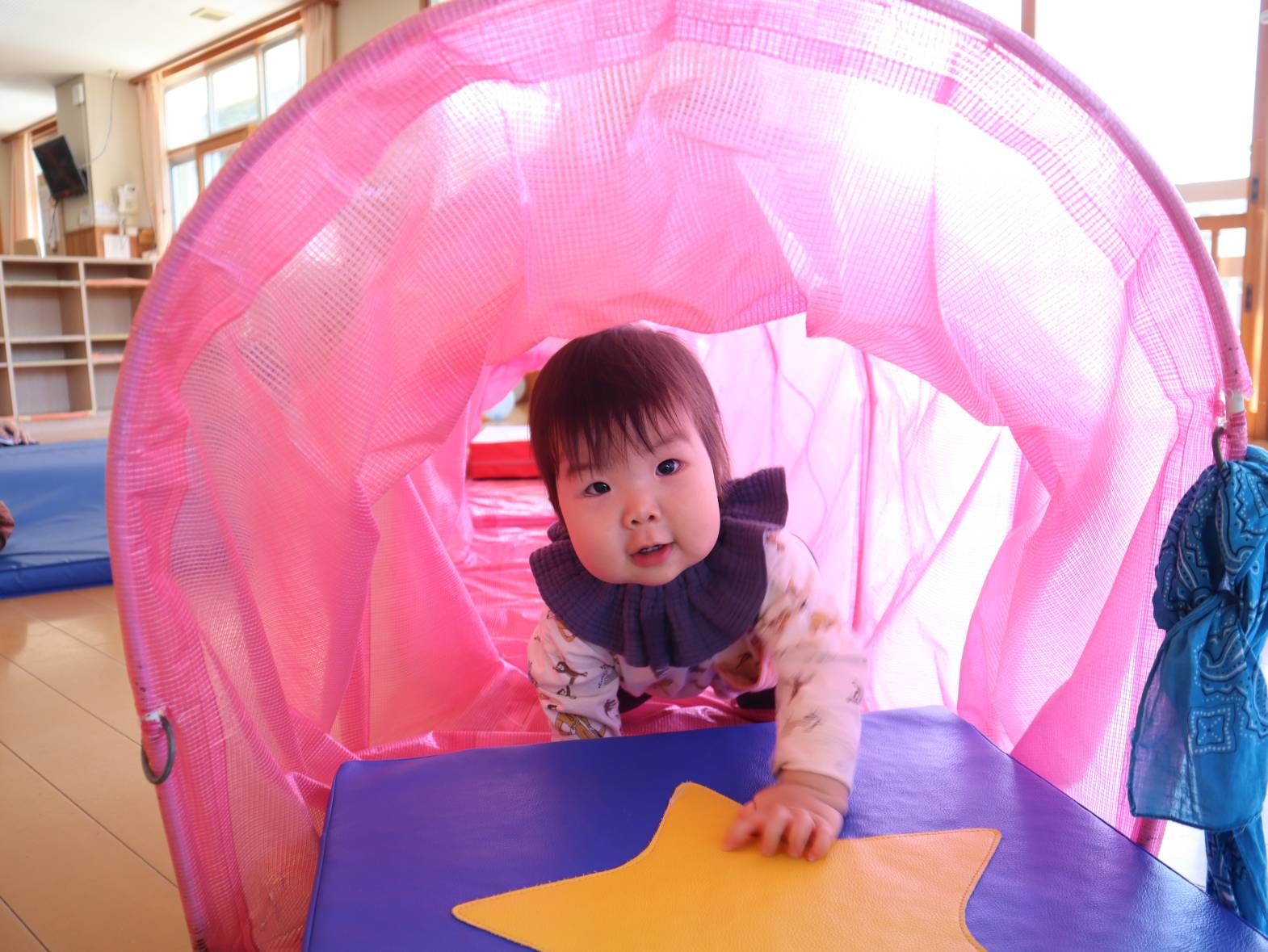 保育園生活にすっかり慣れてきた子どもたち。 活動範囲や遊ぶ玩具の種類も少しずつ増えてきました。 トンネルを出すと、興味津々で覗いて「あ!」、「ばあ!」と声を出しながらハイハイで進んでいく姿が見られました。 反対側にいる友だちや保育者と顔を見合わせて、手を振ったり笑顔になったりするひよこ組さんです。