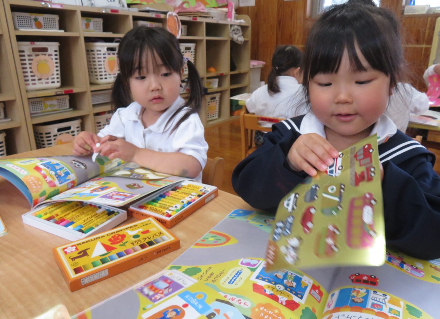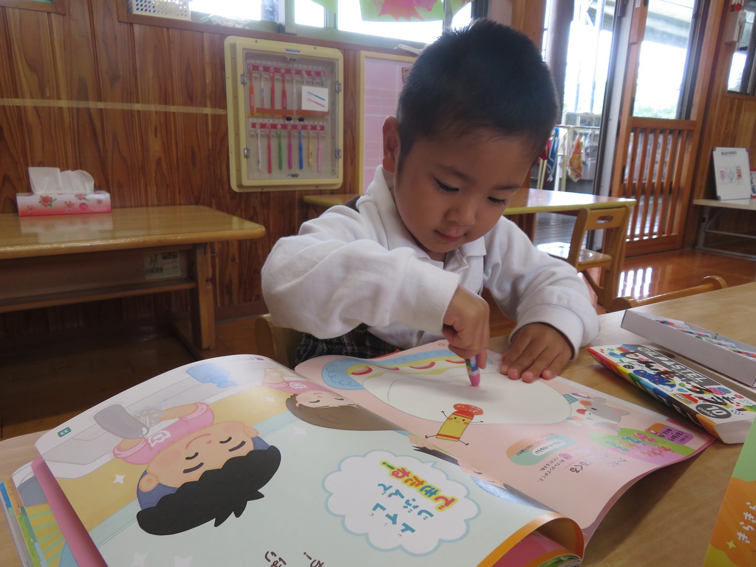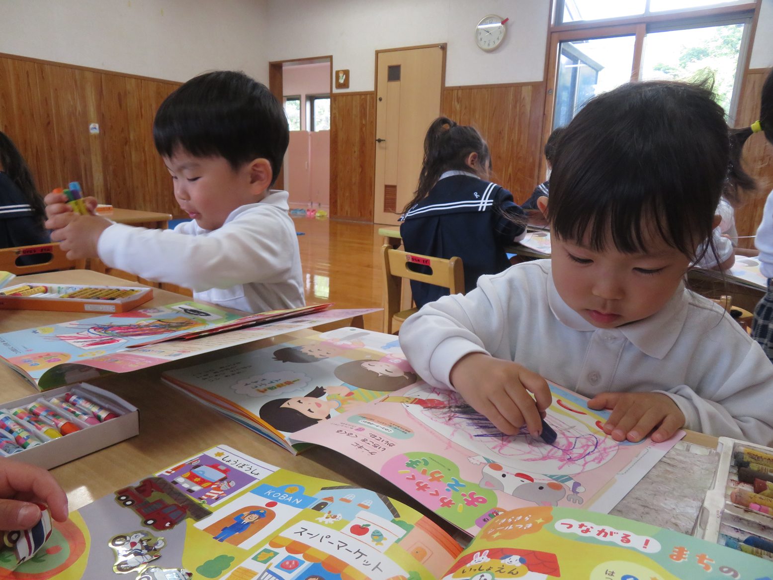 今日は月刊絵本の読み聞かせや絵本を使って活動しました。 シールや色塗り、擦るといちごの香りがするページがあるのを見て「シール貼りする!」、「色塗りのページはどこだ?」とやる気まんまんな子どもたち。 絵本をもらうと嬉しそうにページをめくり、シールや色塗りのページを見つけると「あった!」と楽しそうにシール貼りやクレヨンで色塗りを行います。 また「これなんて書いてある?」、「このお歌どんなお歌だったっけ?」と書いてある文字を先生に確認しながら楽しく絵本を読むりす組さんでした。