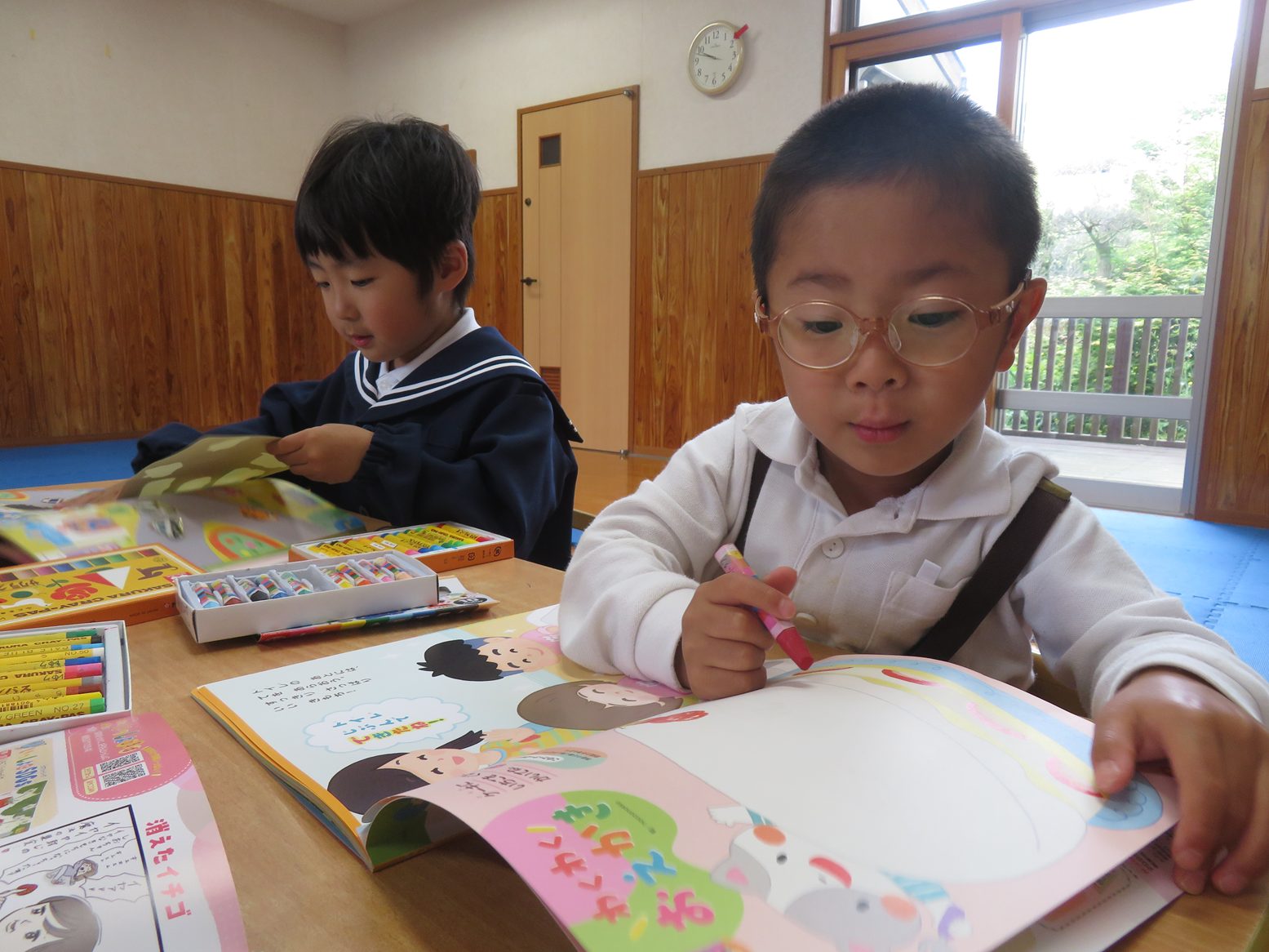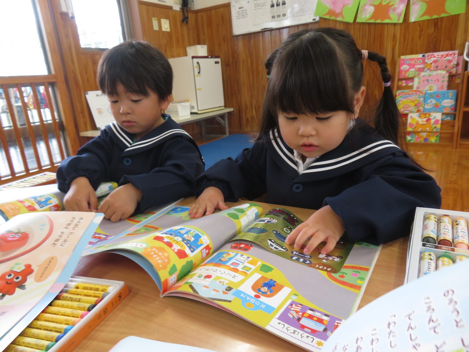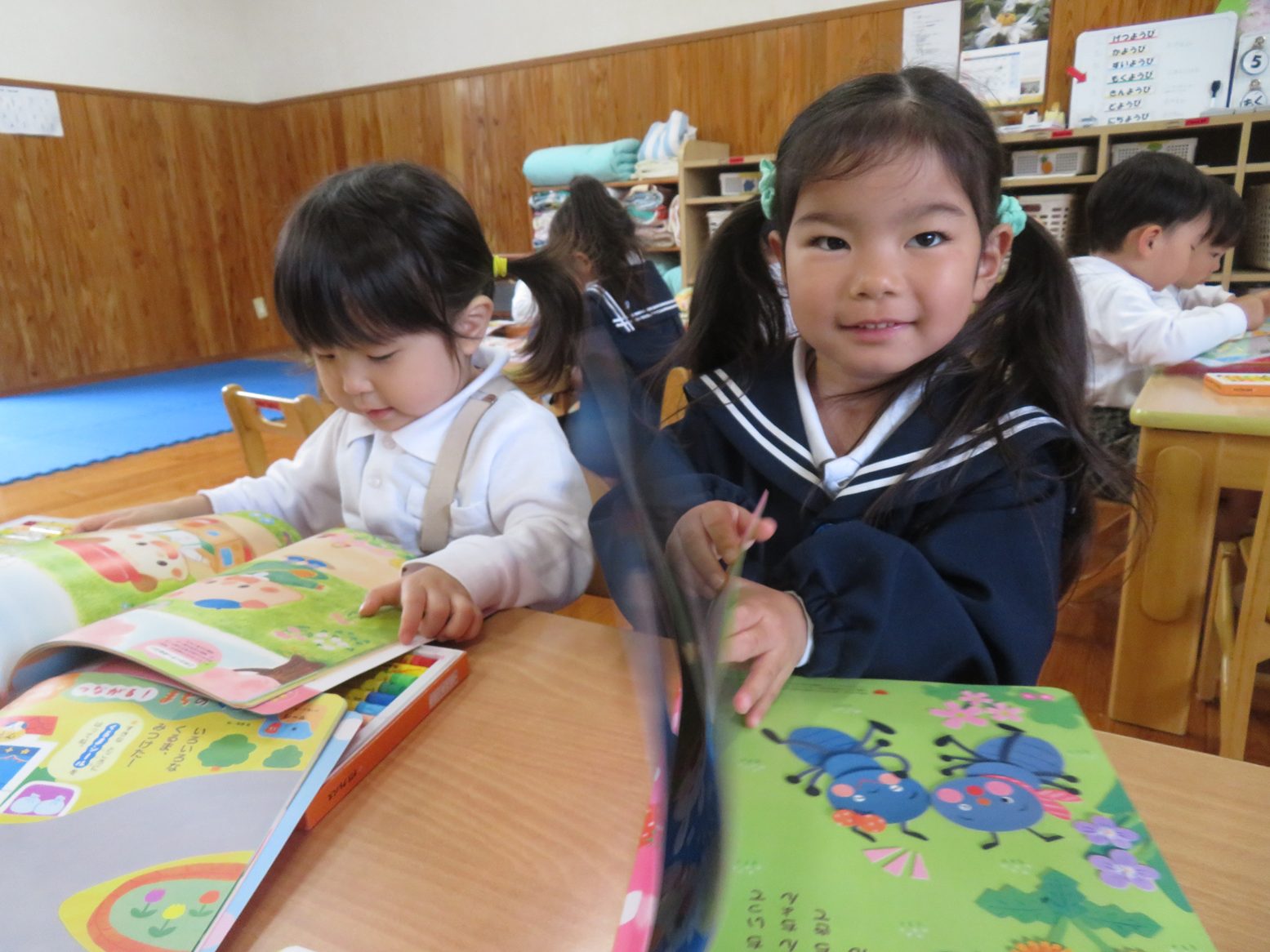 今日は月刊絵本の読み聞かせや絵本を使って活動しました。 シールや色塗り、擦るといちごの香りがするページがあるのを見て「シール貼りする!」、「色塗りのページはどこだ?」とやる気まんまんな子どもたち。 絵本をもらうと嬉しそうにページをめくり、シールや色塗りのページを見つけると「あった!」と楽しそうにシール貼りやクレヨンで色塗りを行います。 また「これなんて書いてある?」、「このお歌どんなお歌だったっけ?」と書いてある文字を先生に確認しながら楽しく絵本を読むりす組さんでした。