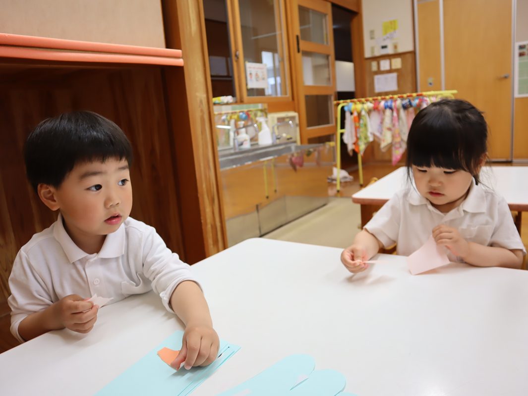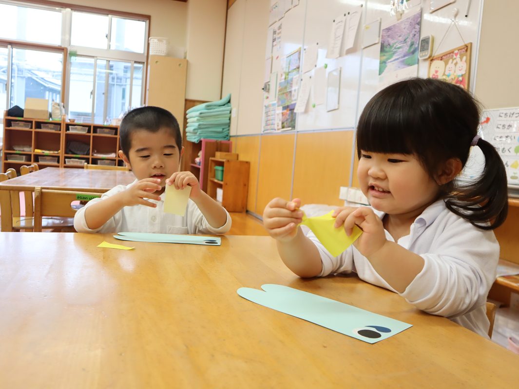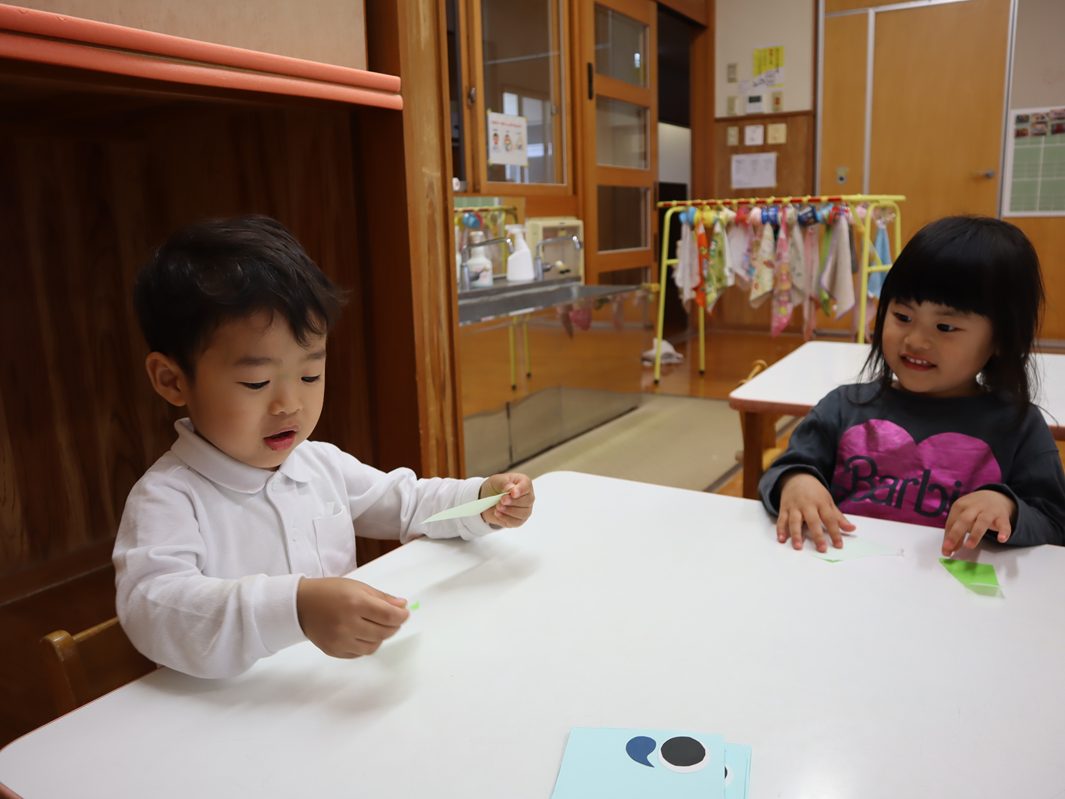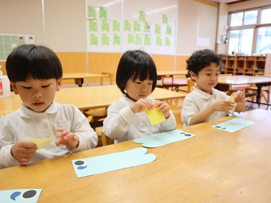 明日のこいのぼり会に向けて製作を行いました。 折り紙をびりびりとちぎってからこいのぼりに貼っていきます。 更に、シール貼りにも取り組みました。 ぱんだ組の頃と比べて小さなサイズのシールでしたが、指を器用に使ってペタペタ貼る子どもたち。 こいのぼりが完成すると「見て!かっこいいこいのぼりだよ。」「ひらひらにしたんだ~!」と自分だけのこいのぼりに満足気な姿が見られました。 明日はこいのぼり会です。是非、子どもたちに感想を聞かれてみて下さい。