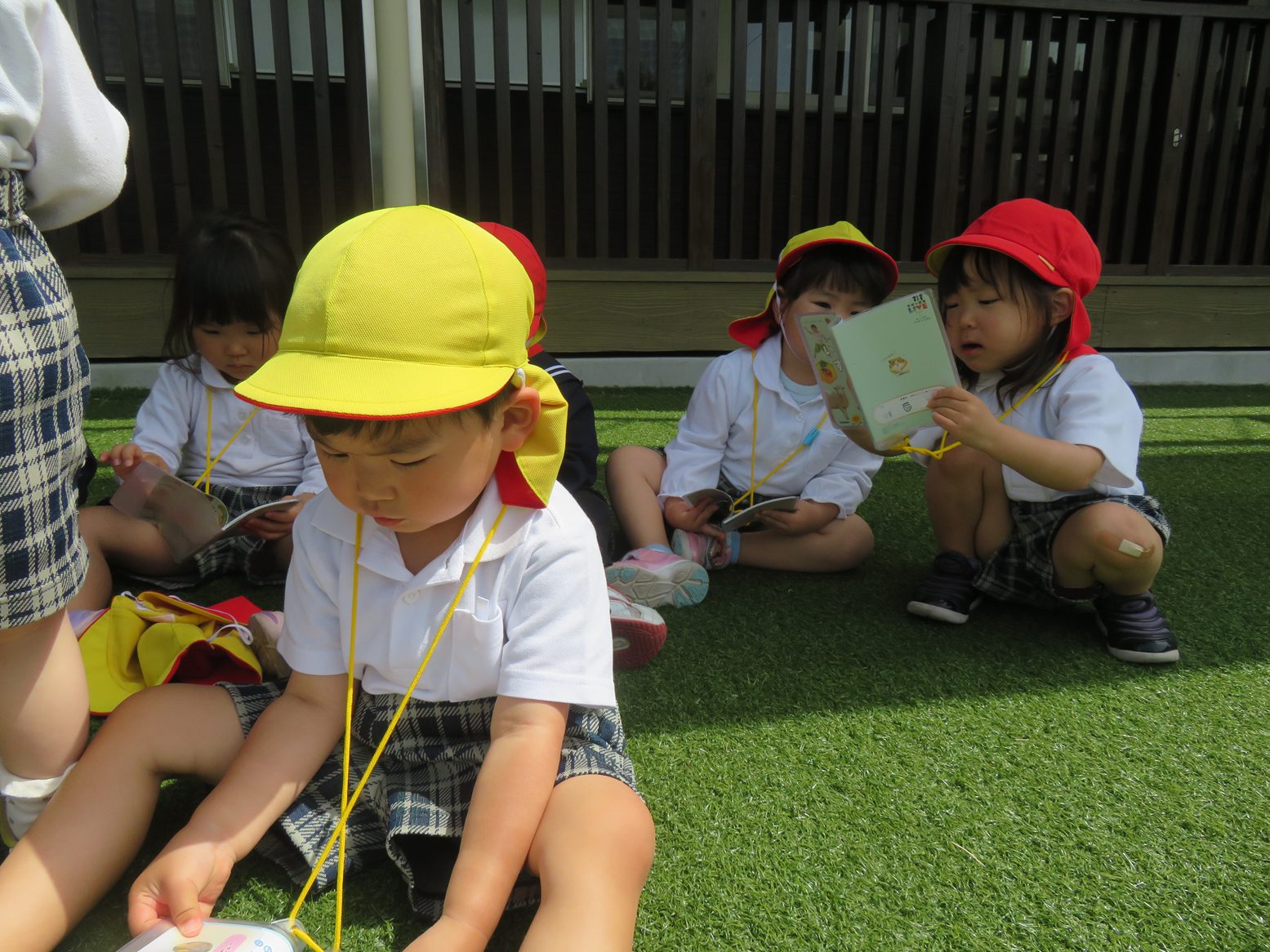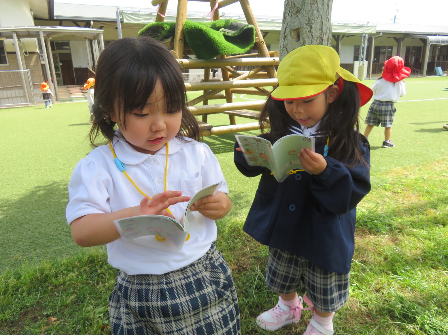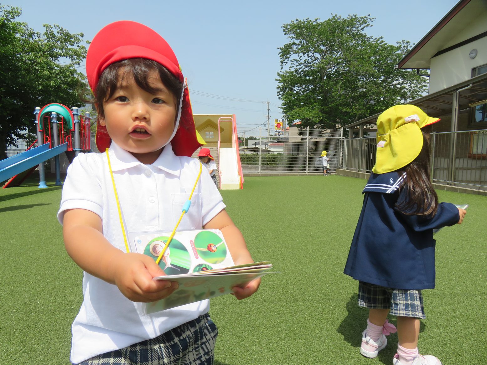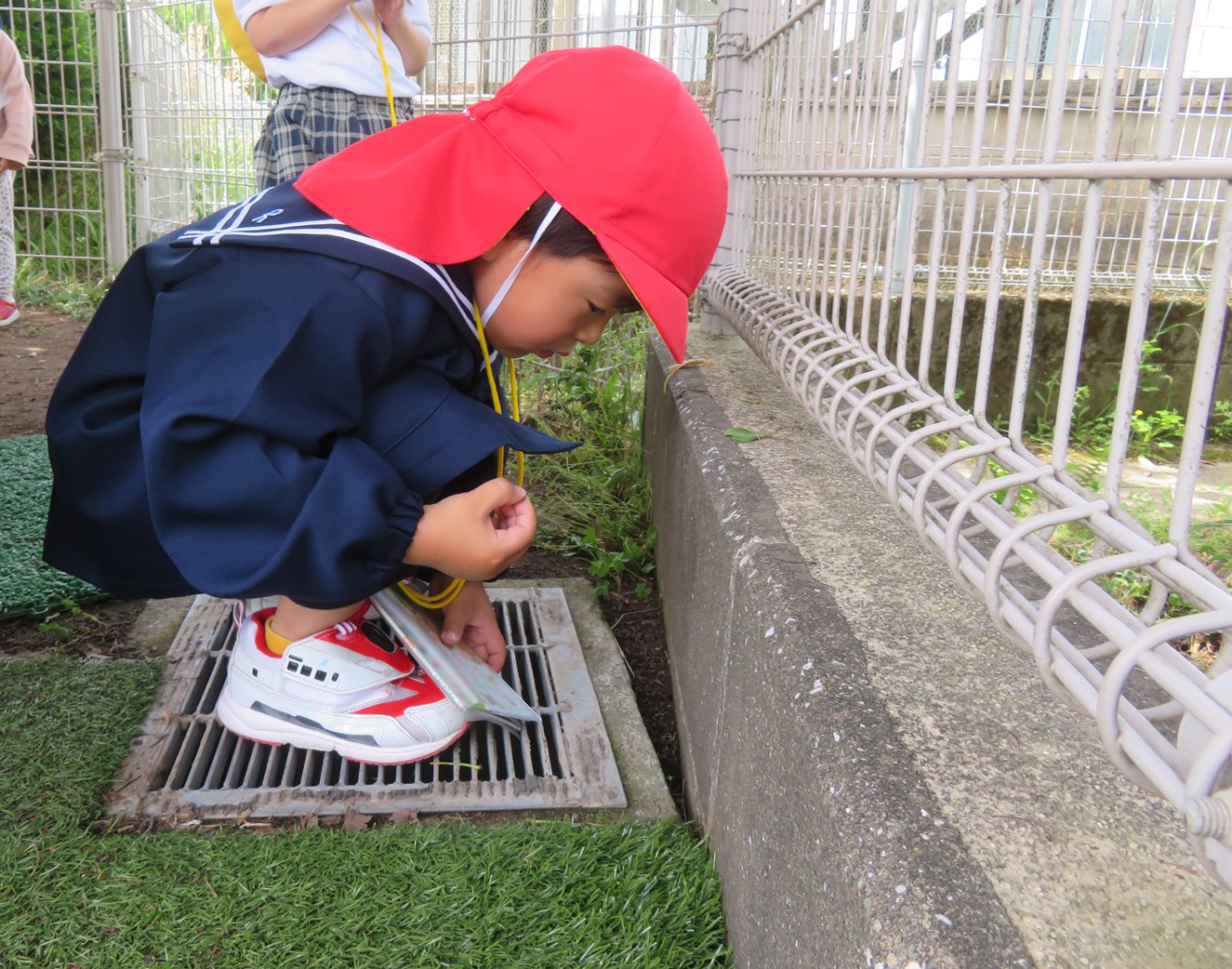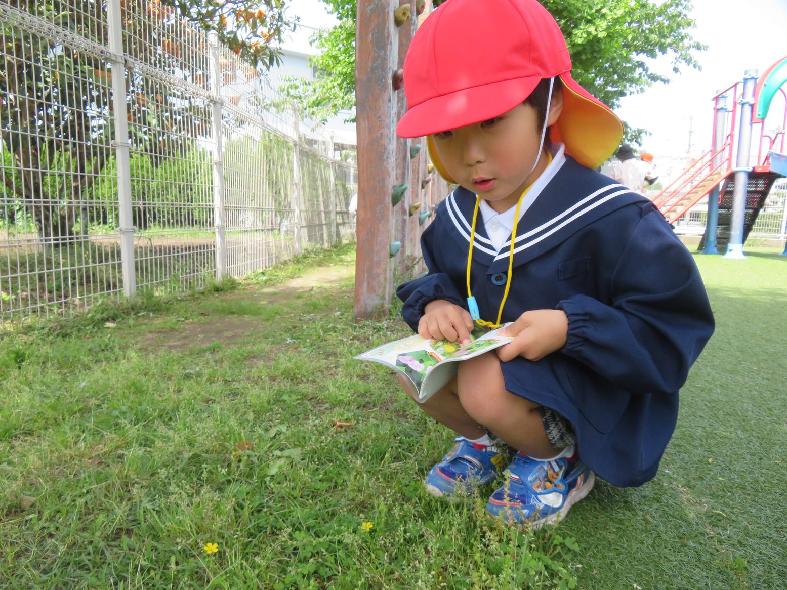 虫や草花探しを行う中では、『だんごむし』に『あり』、『もんしろちょう』を発見しました。また、「この黄色い花は何かな?」と図鑑で調べ、「あった!」と図鑑の中に同じものを発見すると嬉しそうな笑顔を覗かせる子どもたち。