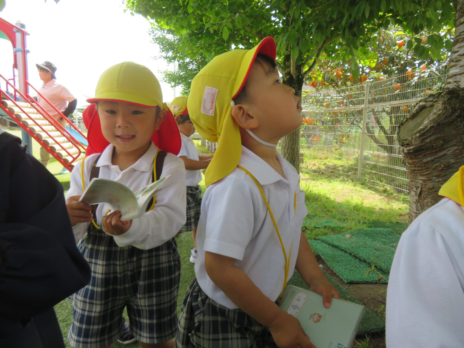今回のおむすびの日は、図鑑を片手に園庭で虫や草花探しをしました。