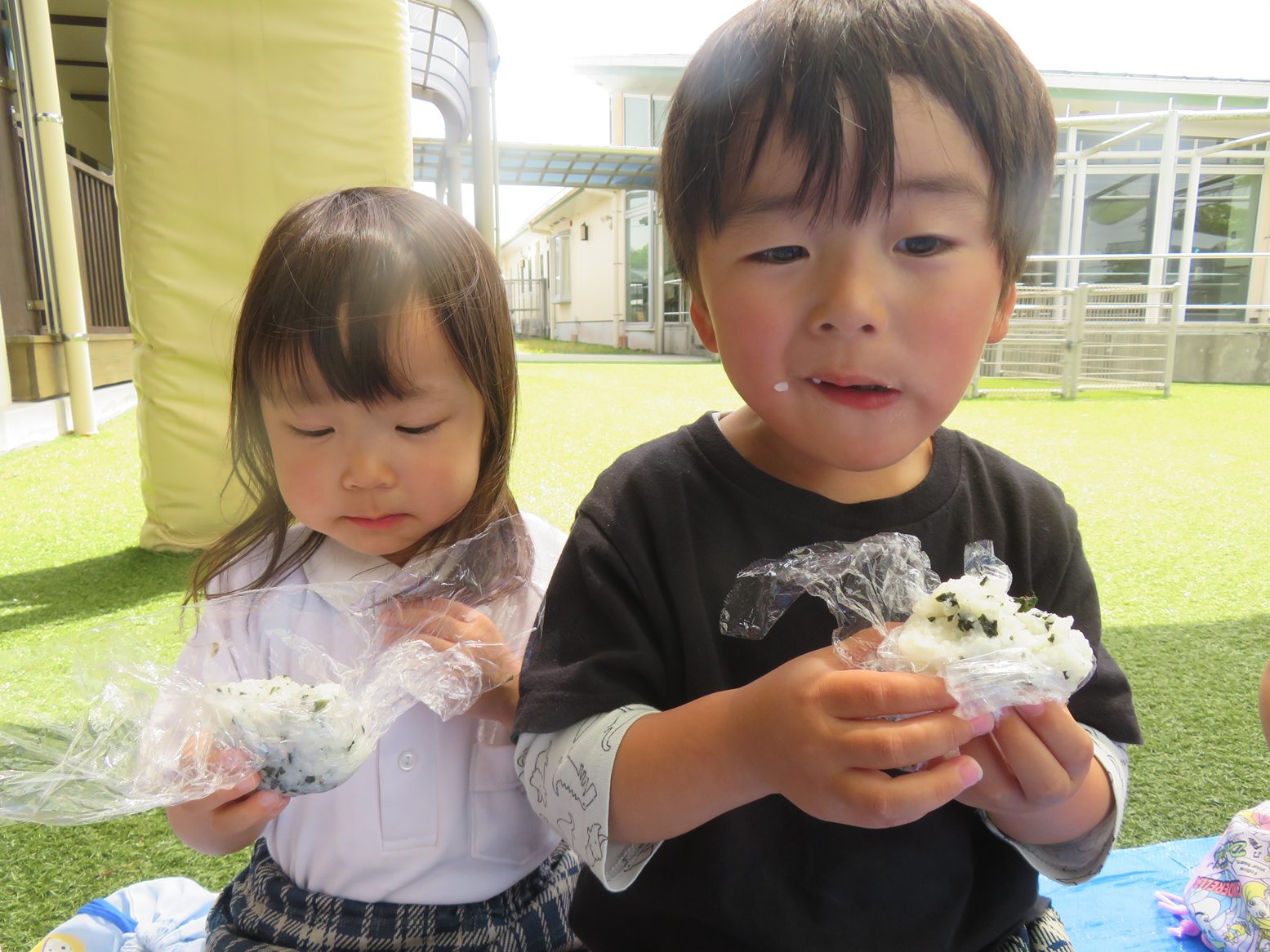 今回は園庭にブルーシートを敷いておむすびを食べました。