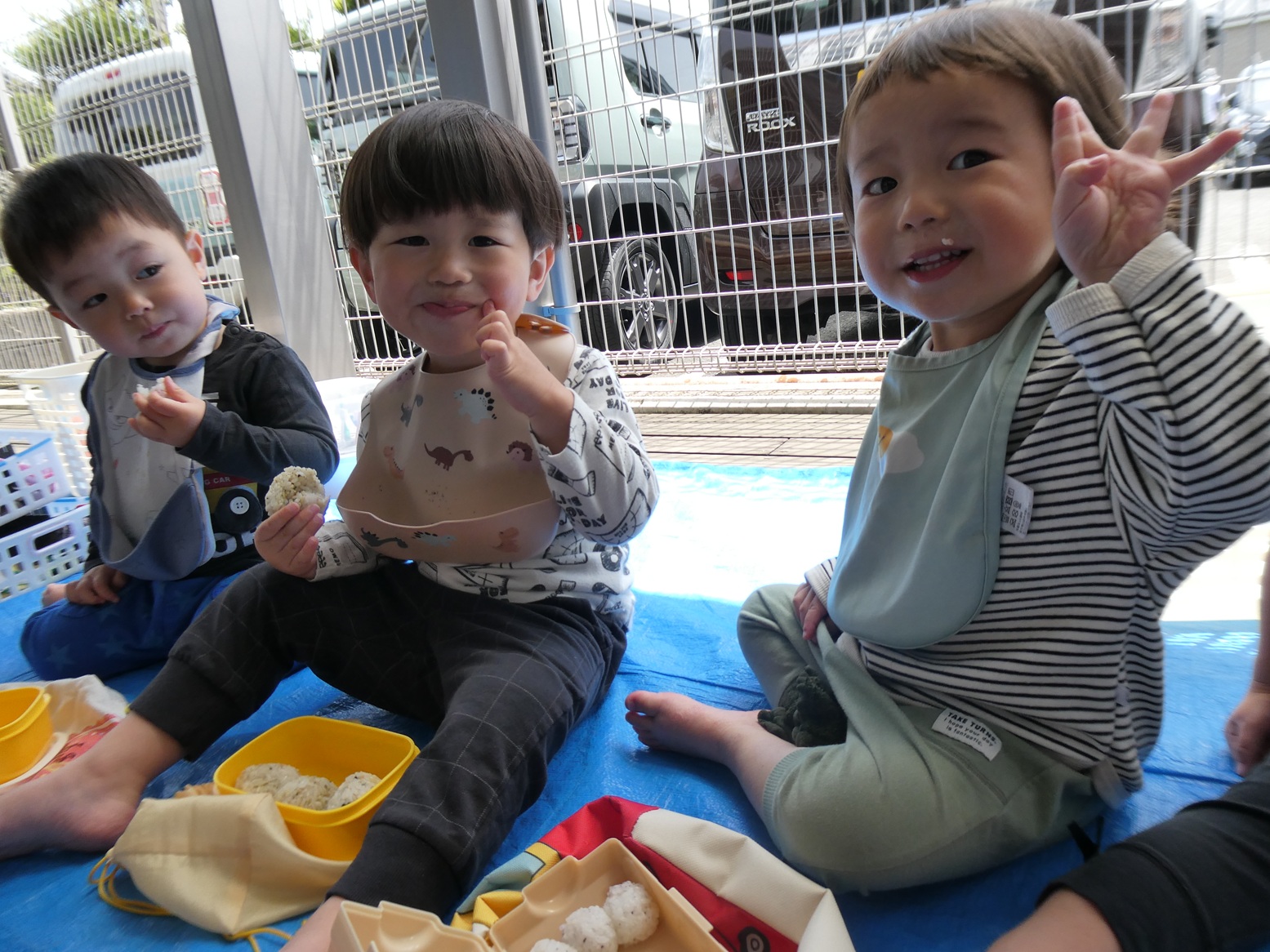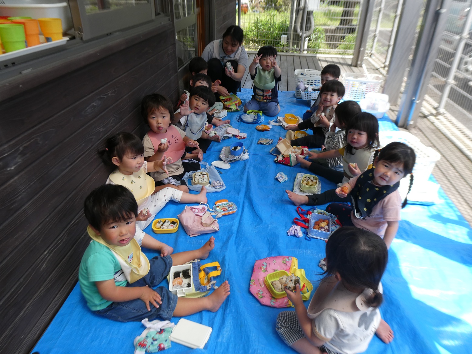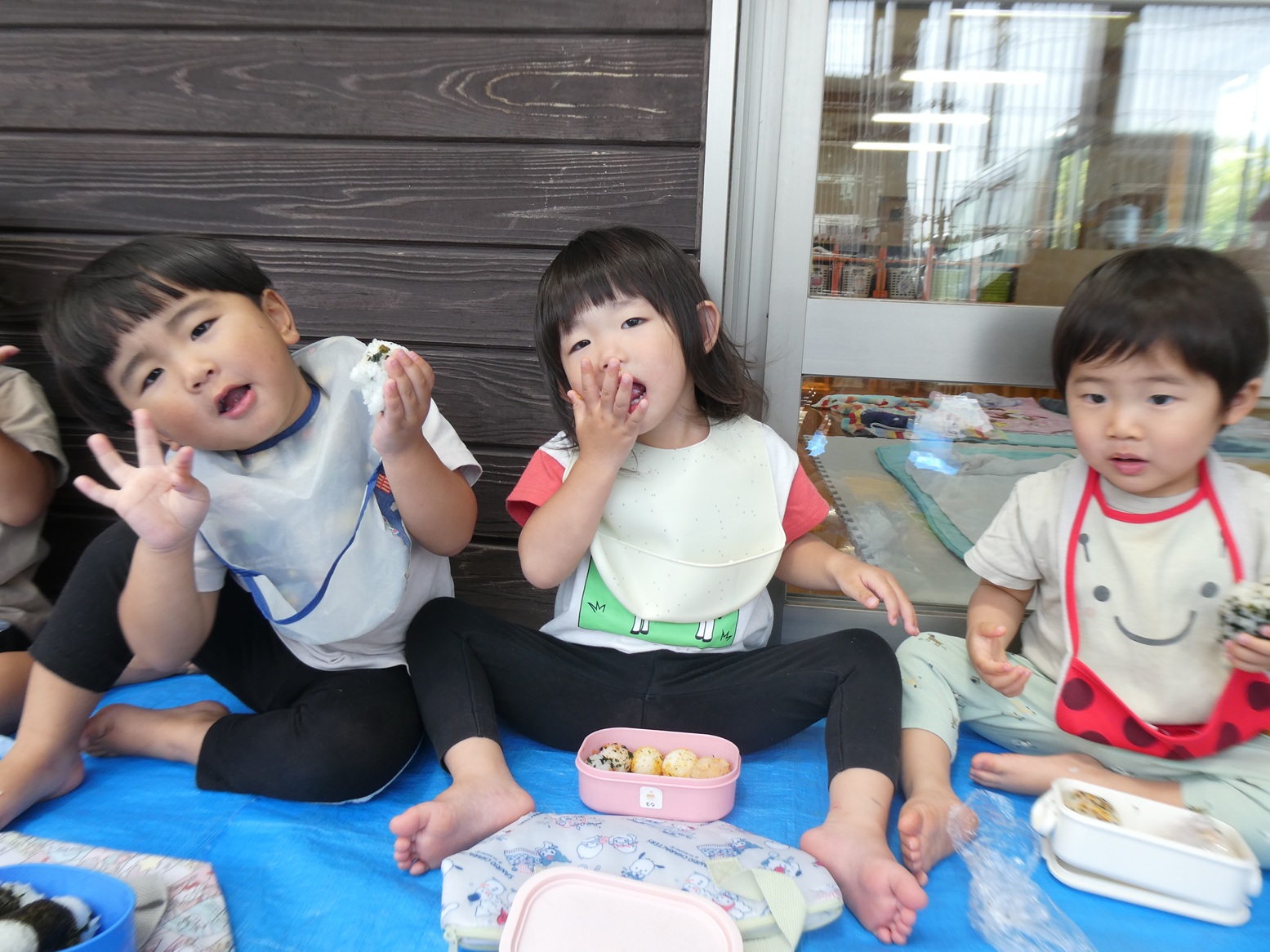 子どもたちがいつも楽しみにしているおむすびの日☆ 今日は初めてテラスで食べました!! みんなでシートに座ってわくわくしていました。 お友だちとお弁当箱やおにぎりを見せ合って楽しそうに食べる子どもたち。 自分で上手に食べることができていました!! ご準備ありがとうございました!