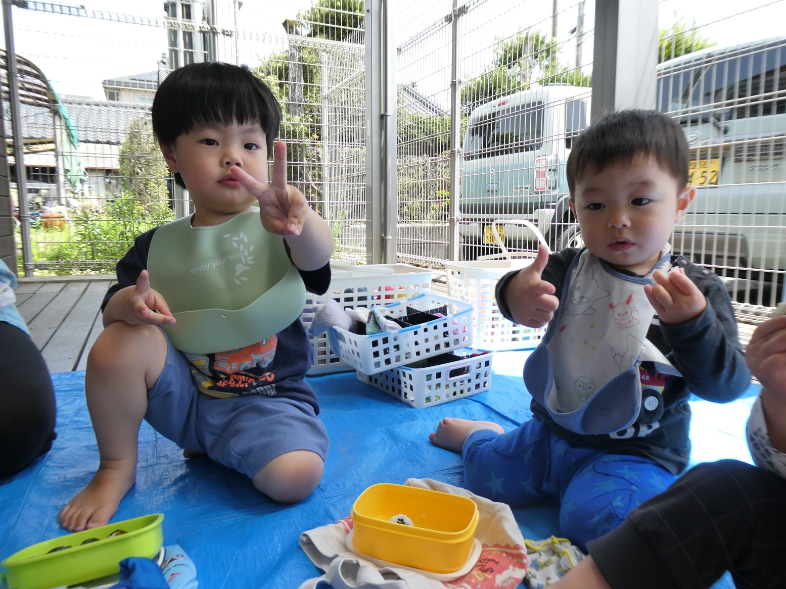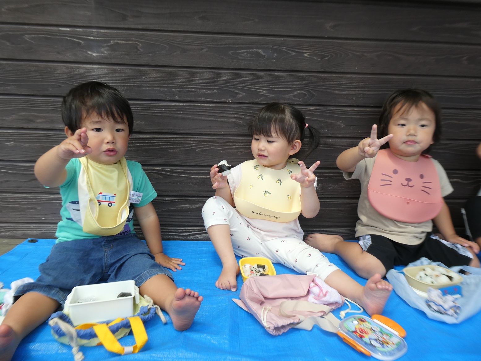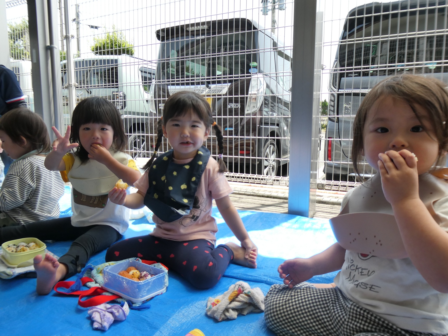 子どもたちがいつも楽しみにしているおむすびの日☆ 今日は初めてテラスで食べました!! みんなでシートに座ってわくわくしていました。 お友だちとお弁当箱やおにぎりを見せ合って楽しそうに食べる子どもたち。 自分で上手に食べることができていました!! ご準備ありがとうございました!