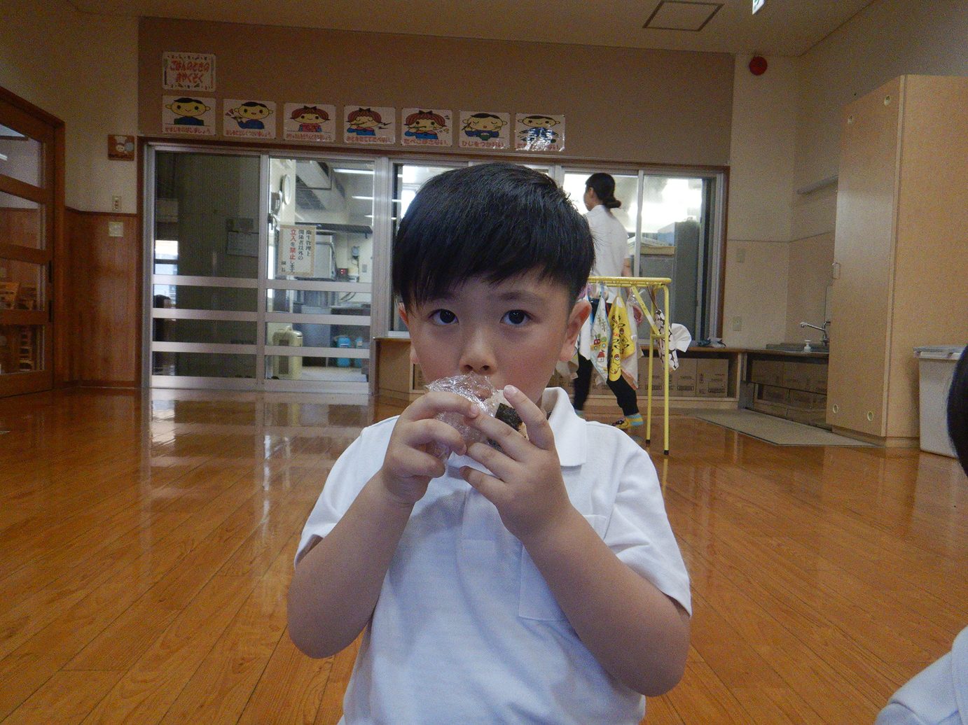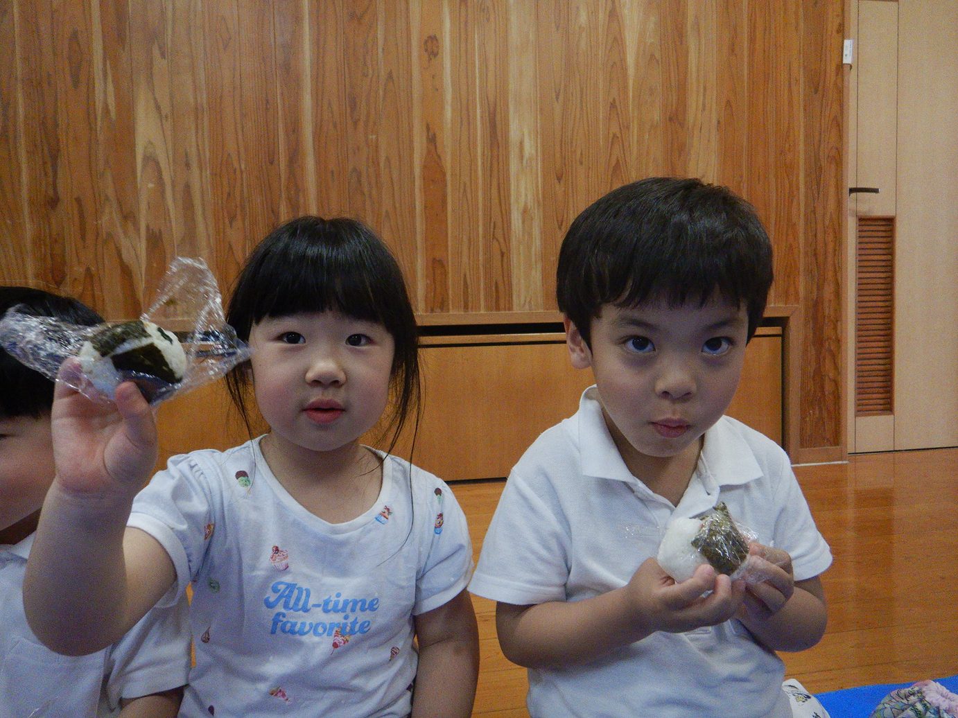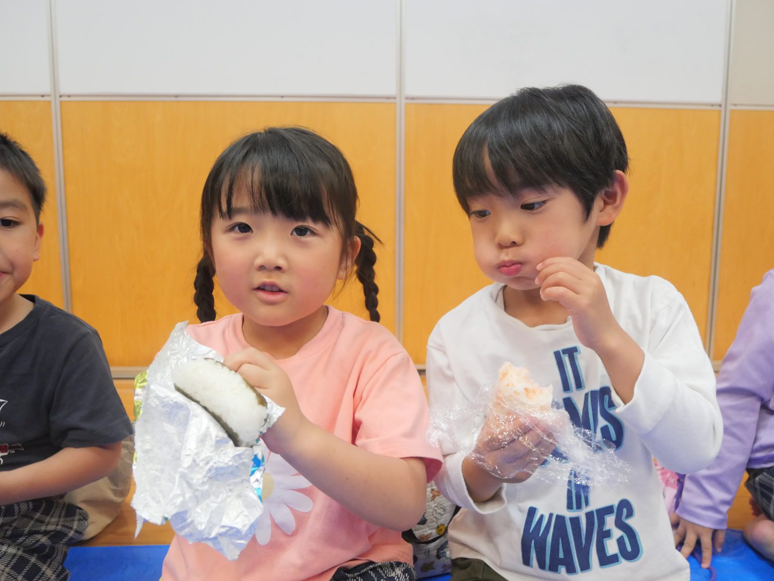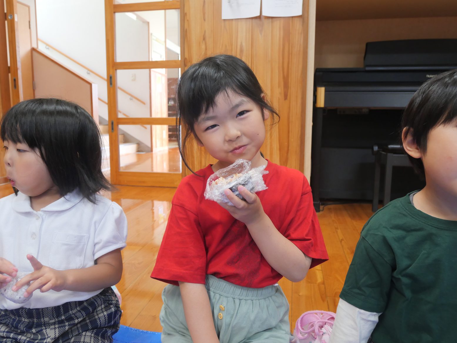 「おにぎり、美味しい。」「鮭のおにぎりから食べよう!」と、嬉しそうにおむすびを頬張る姿が見られます。