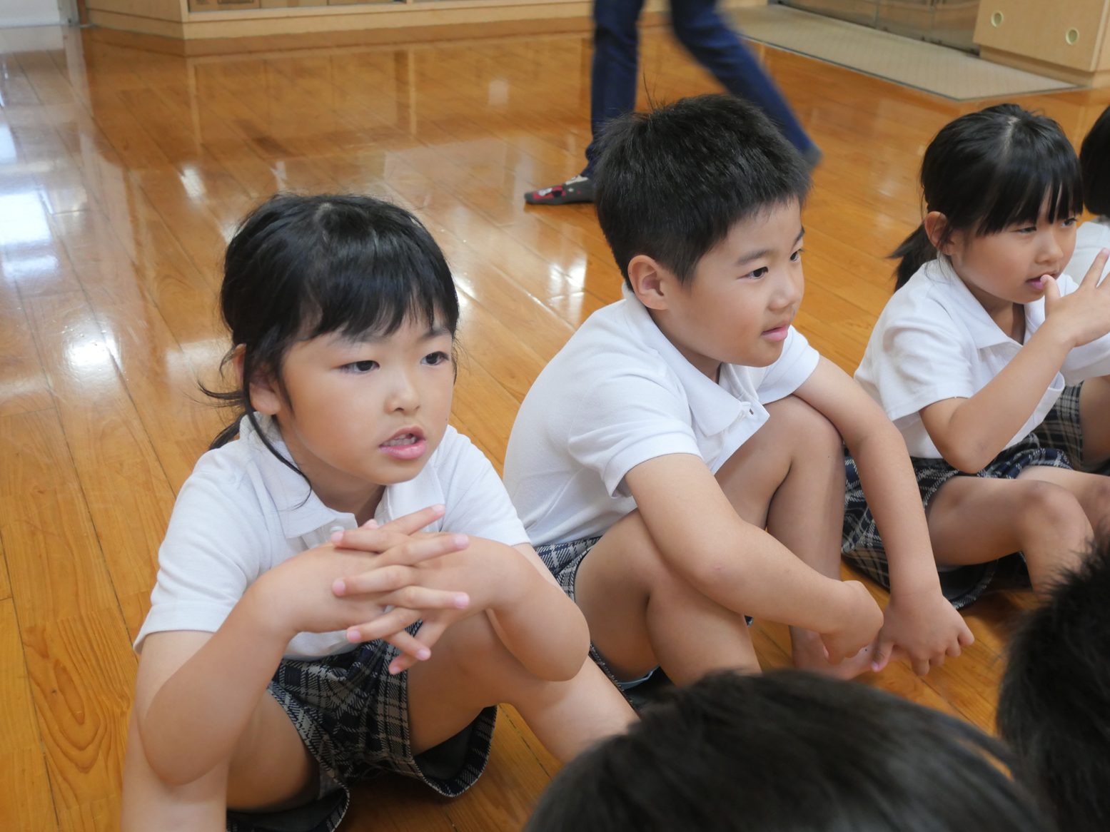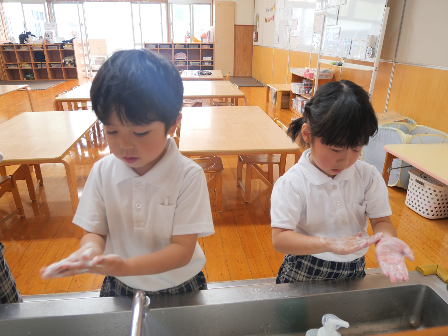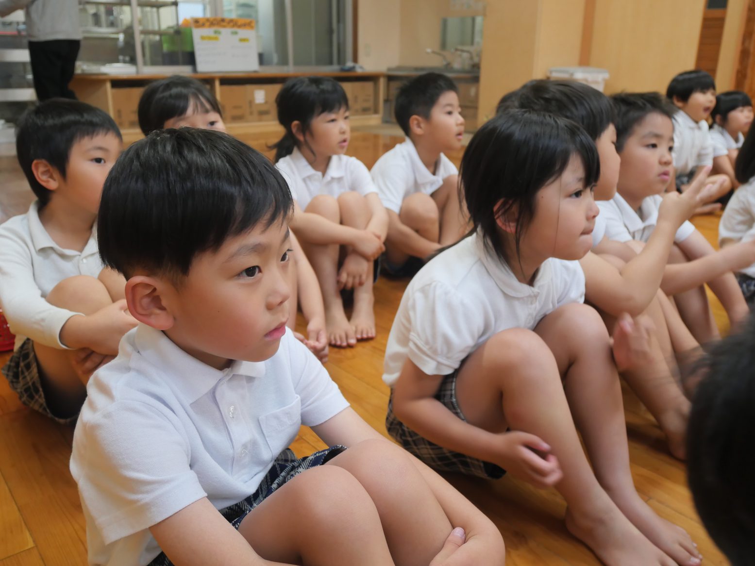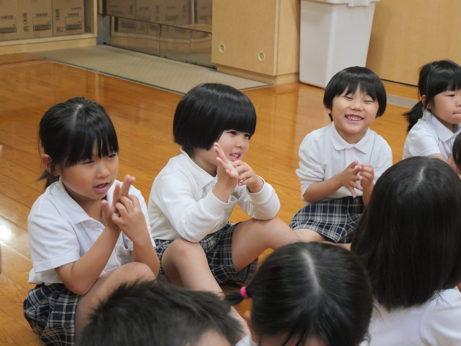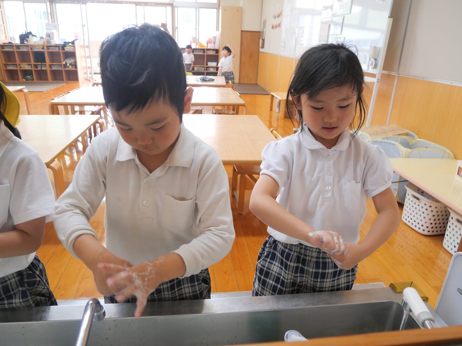 先日、お話会がありました。 今月は、手の洗い方や身だしなみについての話を聞いた子どもたち。 「カメのポーズで、指の間を洗うんだね。」「シャツは入れた方が、カッコいいね!」と、学んだことや気付いたことを共有する姿が見られます。 また実際に学んだことを、お話会後に取り組んでいたきりん組さん。 「次はオオカミのポーズだよ!」「ボタンがあいているよ。」とみんなで声を掛け合いながら、手洗いや身だしなみへの意識を高める姿が見られました。