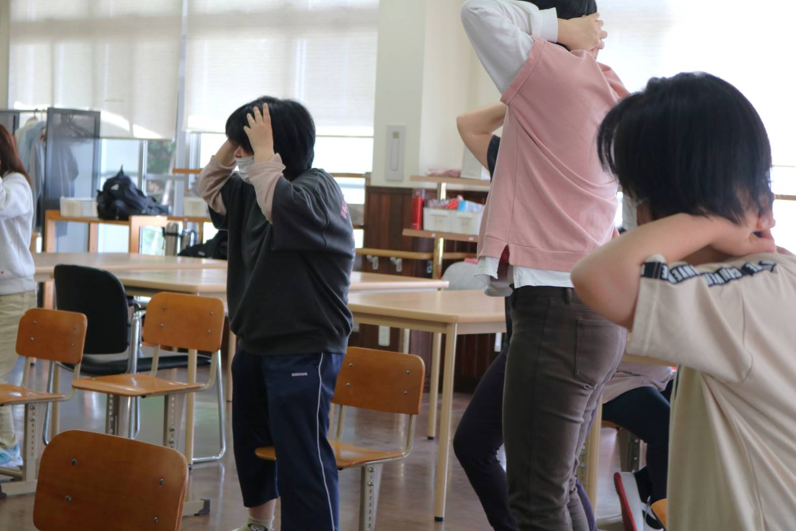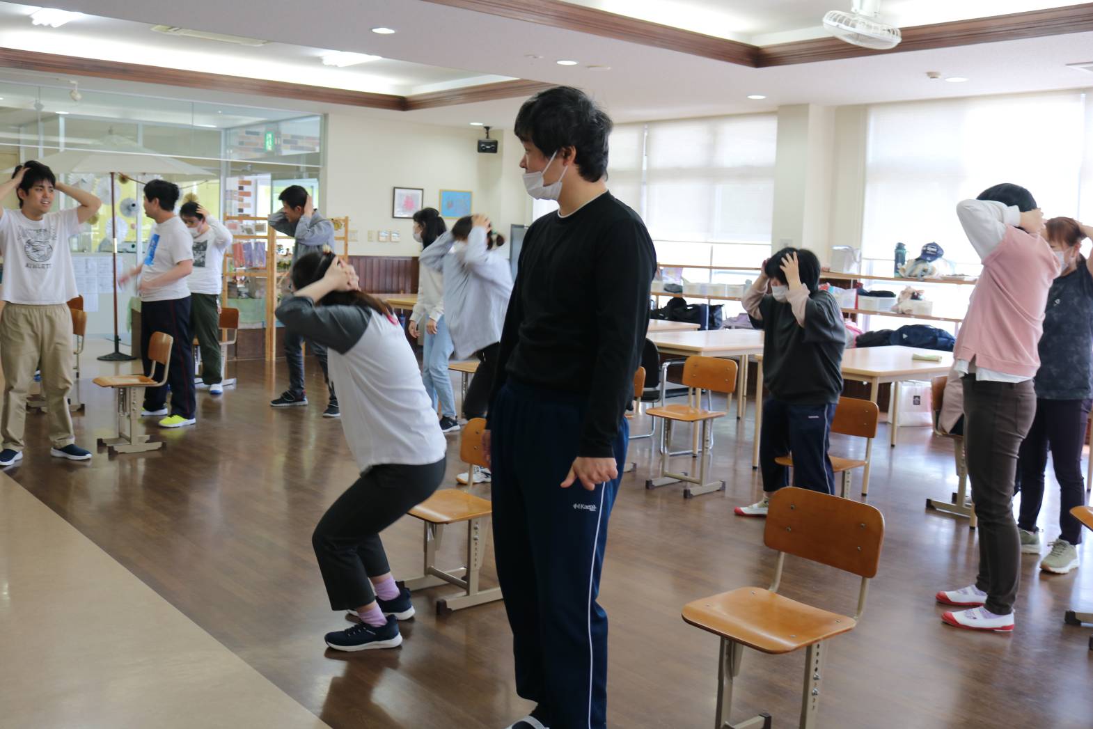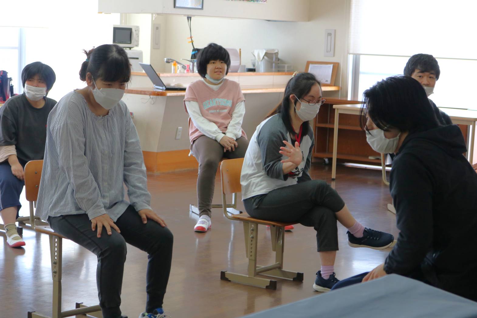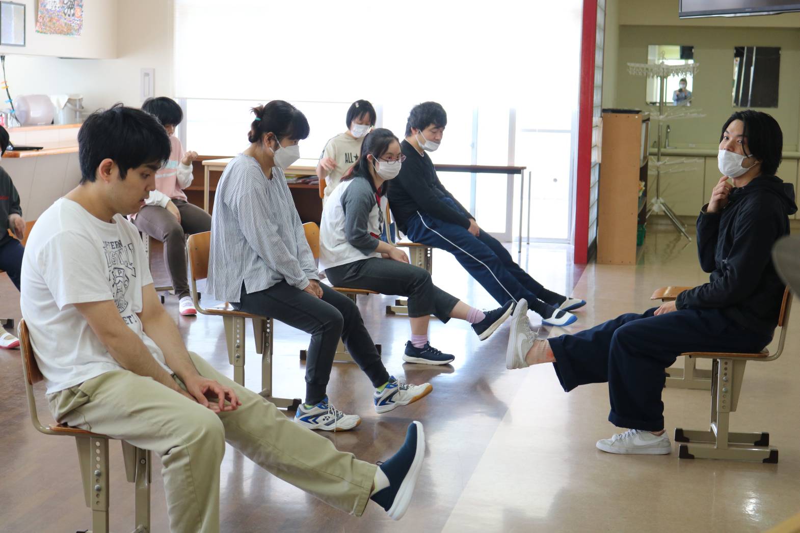 リズムに合わせて全身を動かし、椅子に座ってゆっくり体を伸ばしました。