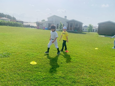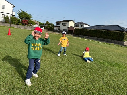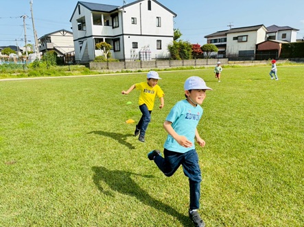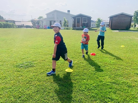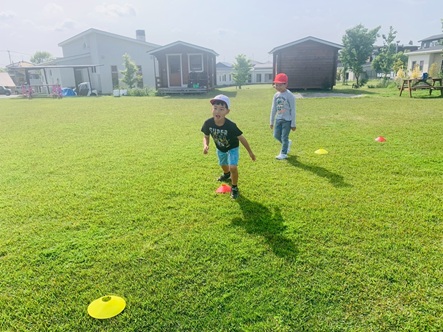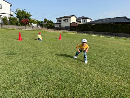 ゴーストップを行いました。 大きな円の周りやコーンの間を移動しながら、ホイッスルの音に合わせて止まったり、進んだりしていきます。 まずは、歩いて移動です! ホイッスルが鳴ると…ピタッと動きを止めることに成功です。 余裕が出てくると、ポーズをする姿も見られました☆ 歩くだけでなく、スキップで取り組んだり、難易度をあげて、走りながら取り組んだりもしましたよ! いっぱい動いて、「疲れた~!」と芝生の上で休憩して身体を休める子どもたちでした♪
