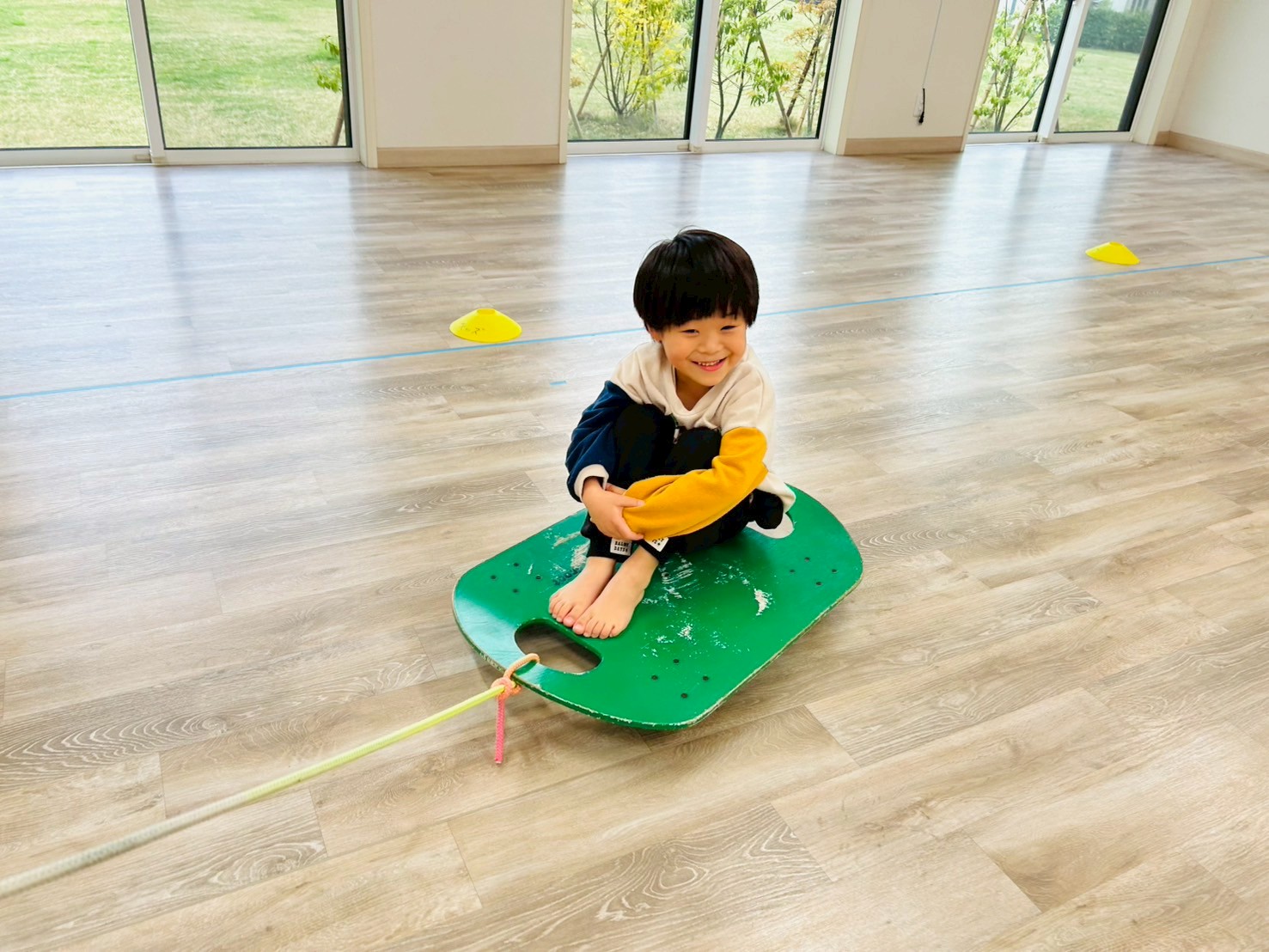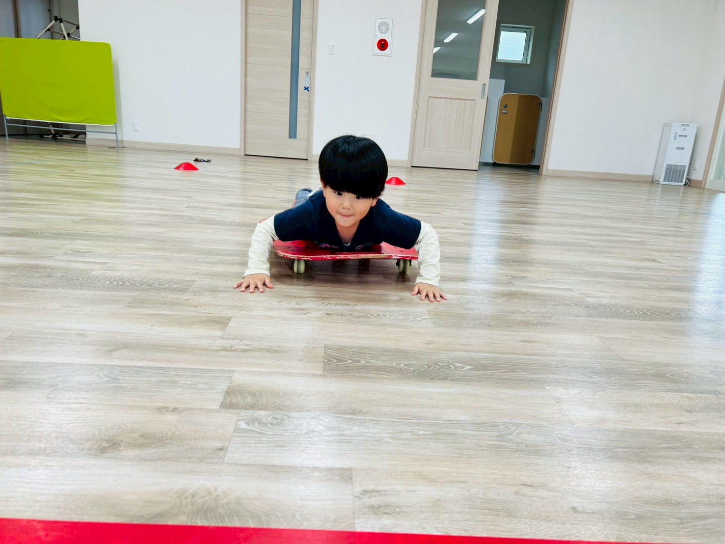 ぞうグループでボディボードの活動を行いました。 ボディボードに四つ這いで乗って進む活動では、以前は斜めに進むことも多かったのですが、今回はゴールに向けて一直線に進むことができていました! ボードの中央に体を乗せることが難しいお子さんもいましたが、何度も練習をすることでボードの中央に、ボードと平行になって乗ることもできるようになりましたよ。 ボードにしゃがんで乗り、職員やお友だちが引っ張って進んだ際には、ソリのような感覚に笑顔が見られます! 「シュー!」と声を出しながら風を感じて大笑いでしたよ☆